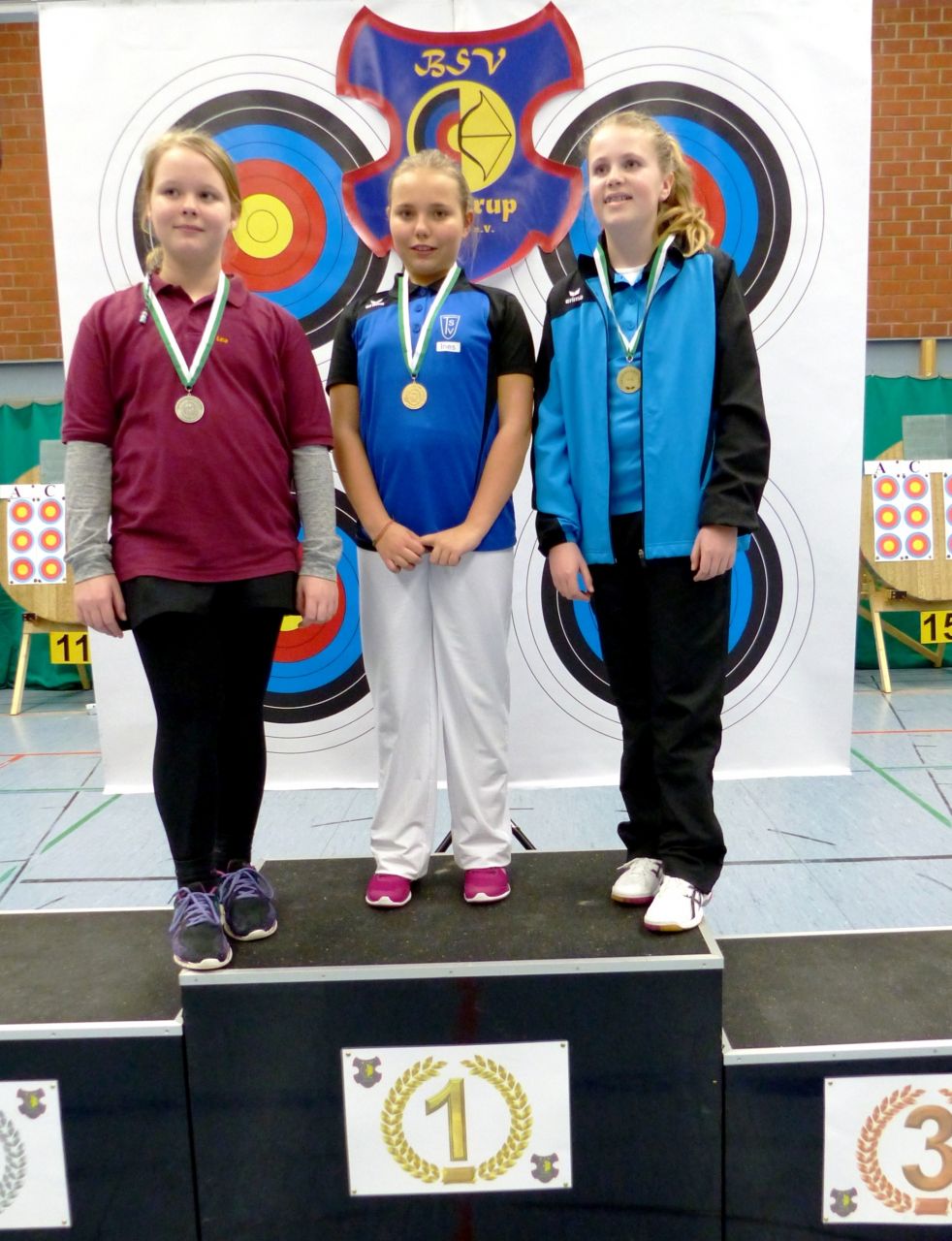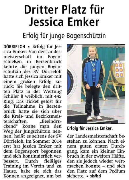 Jessika Emker als „Newcomerin“ im Bogensport vom Schützenverein Dörrieloh, erzielte in der weiblichen Schülerklasse B mit dem Recurve-Bogen 445 Ringe, dieses „reichte“ für einen tollen „Bronzeplatz“. Erst im Sommer 2014 hatte sie mit dem Bogensport begonnen, ihr Trainingsfleiß brachte sie nun nach Kreismeister- und Bezirksmeisterschaft erstmals aufs „Treppchen“ bei der Landesverbandsmeisterschaft.