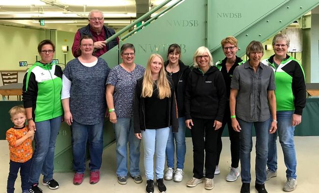Nicht alle Teilnehmerinnen, aber mit den beiden "Betreuern" Tamme und Karl-Friedrich Scharrelmann (Aufsicht Luftpistole), von links strahlen um die Wette: Verena Wieling-Schröder, Nicole Tatgenhorst, Sigrid Klöcker, Swantje Brückner, Ronja Schwenn, Rosemarie Wowries, Claudia Reuter, Sabine Prochazka u. Karin Husmann.