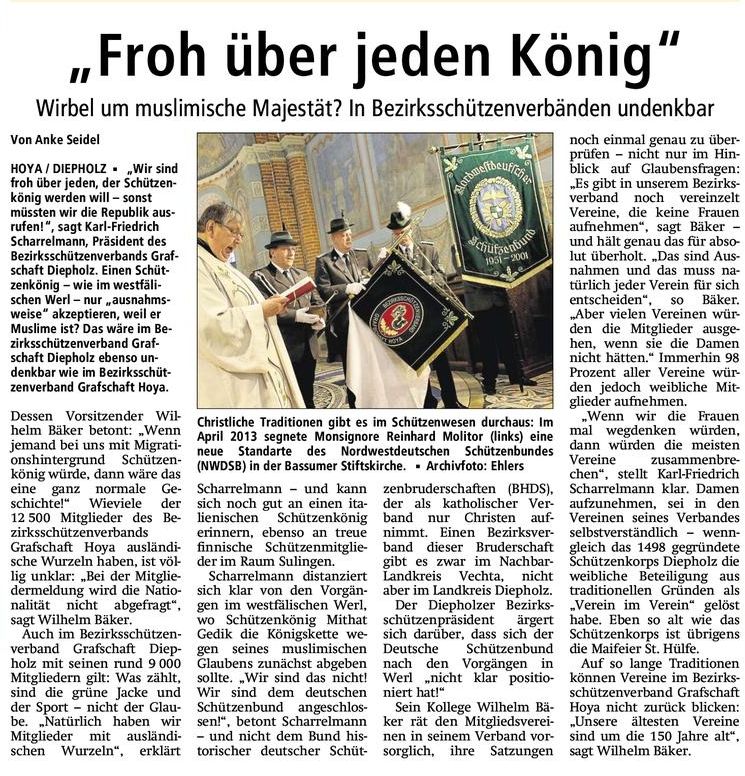 06.08.2014 – In den letzten Tagen hat die Tatsache, dass ein Mitglied der Schützenbruderschaft St. Georg in Werl-Sönnern Schützenkönig wurde und dem Islam angehört, in der ganzen Republik für Aufsehen gesorgt, weil er in einem Verein die Königswürde erlangte, in dem laut dem Bund Historischer Deutscher Schützenbruderschaften (BHDS) nur „christliche Menschen“ Mitglied sein dürfen.