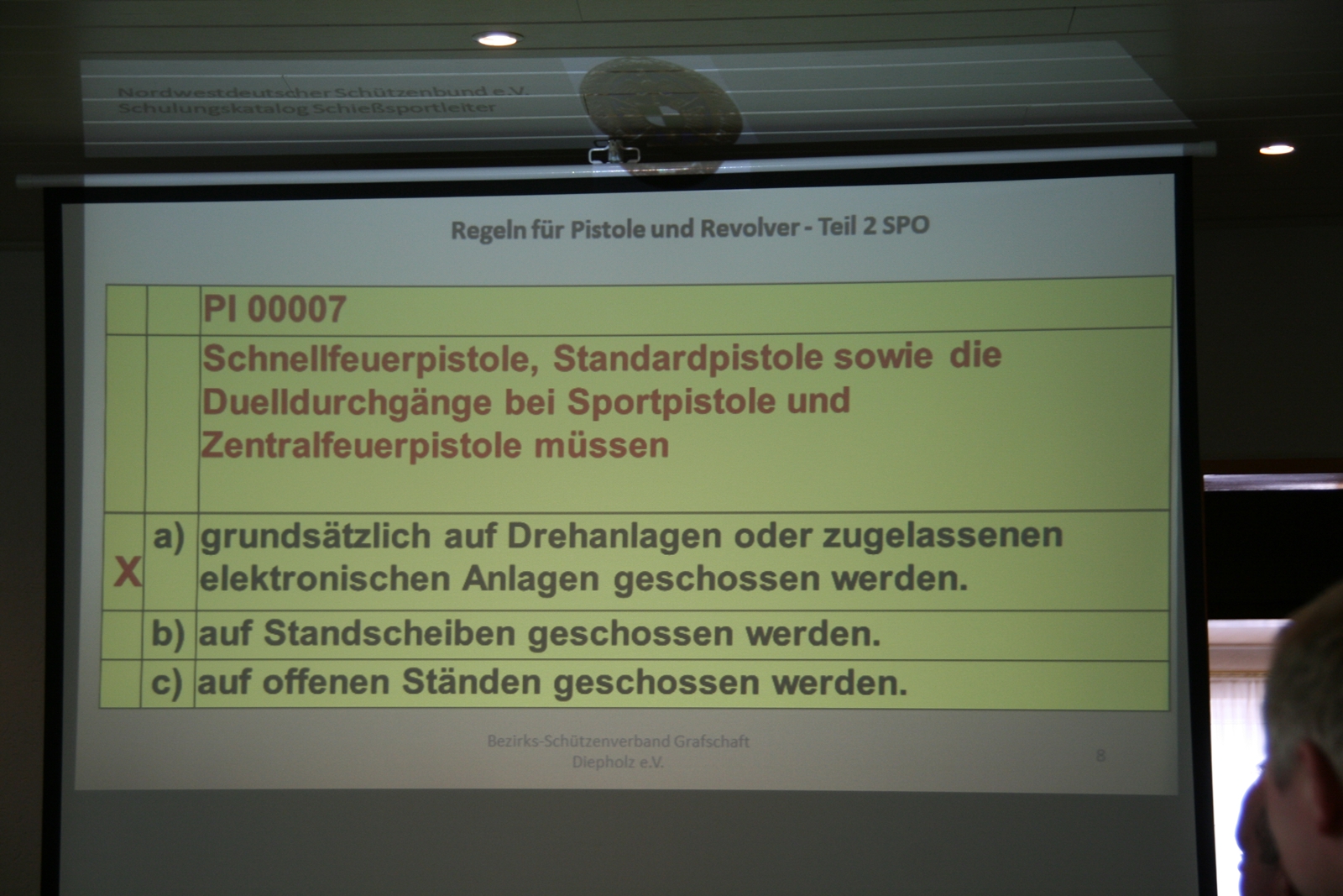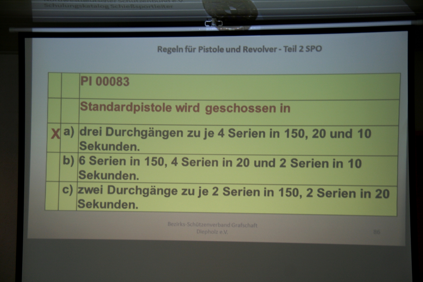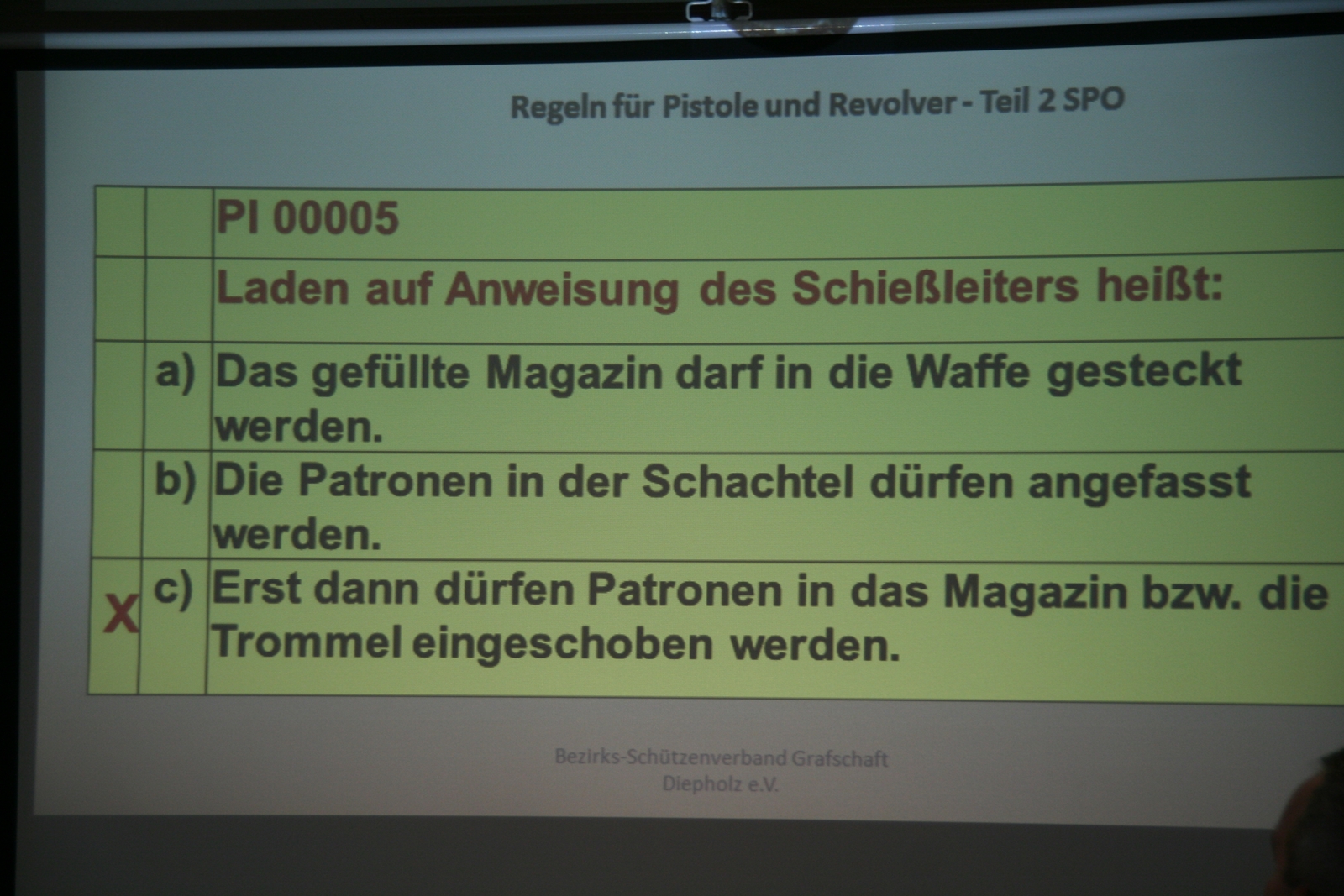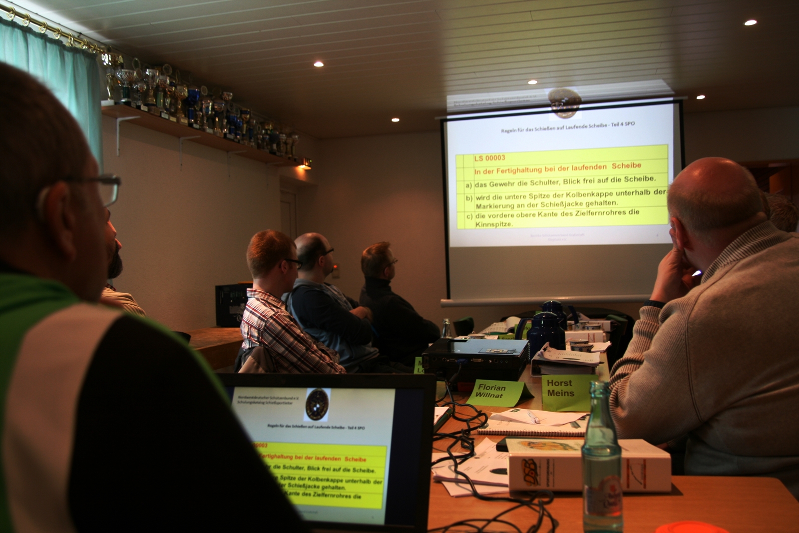Am Samstagmorgen, den 12. November, dem „Prüfungstag“, standen Wiederholungen auf dem Programm. Horst Brinkmann, Referent für Waffensachkunde, ließ über Powerpoint die evtl. Fragen revue passieren und testete so das Wissen der angehenden Schießsportleiter.