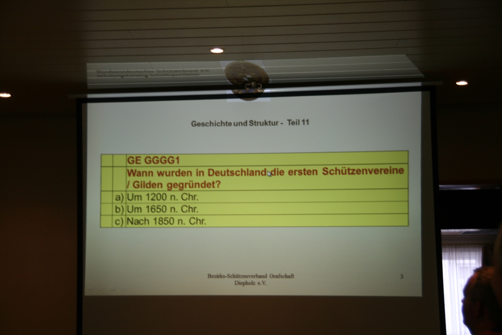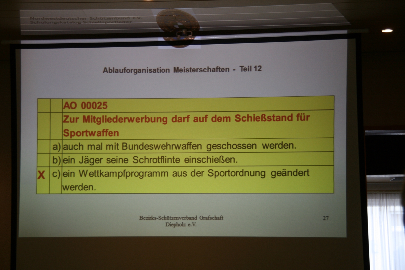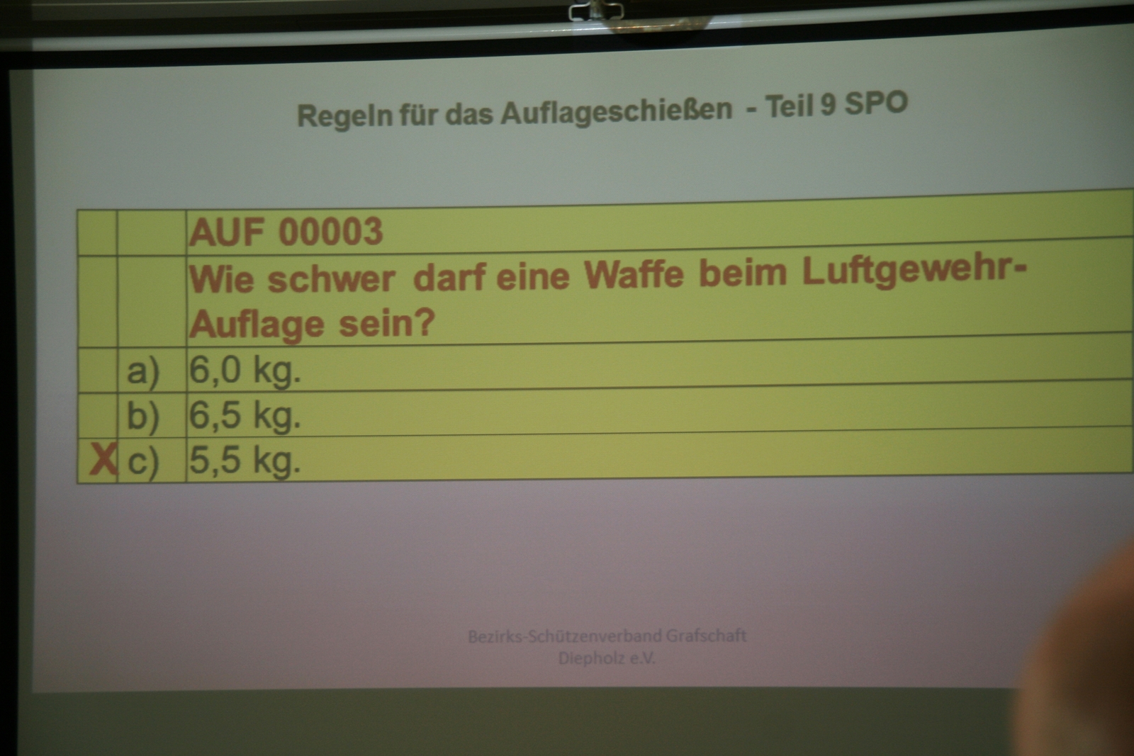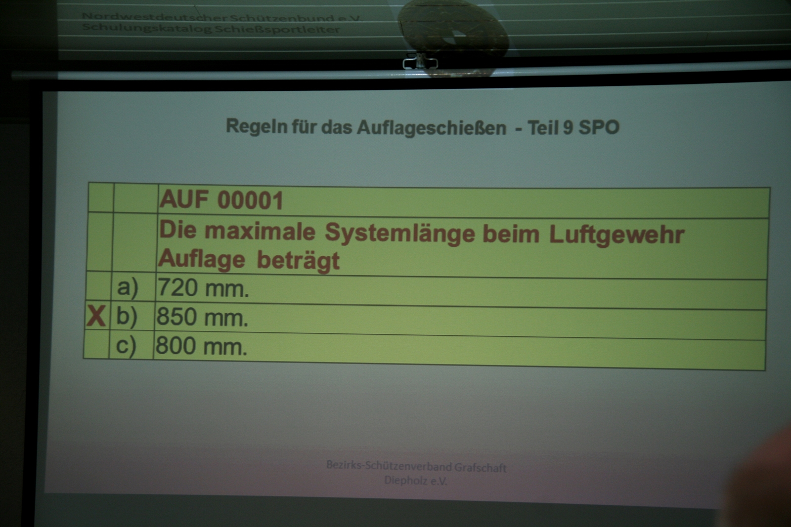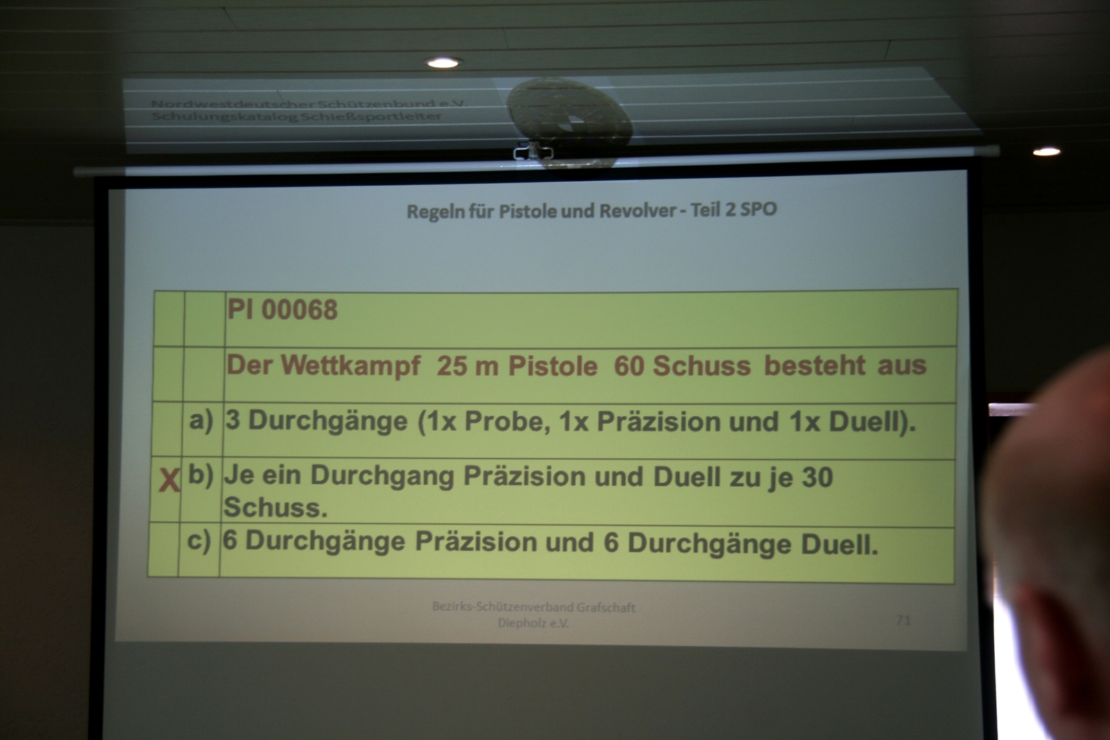 Am Samstagmorgen, den 12. November, dem „Prüfungstag“, standen Wiederholungen auf dem Programm. Horst Brinkmann, Referent für Waffensachkunde, ließ über Powerpoint die evtl. Fragen revue passieren und testete so das Wissen der angehenden Schießsportleiter.