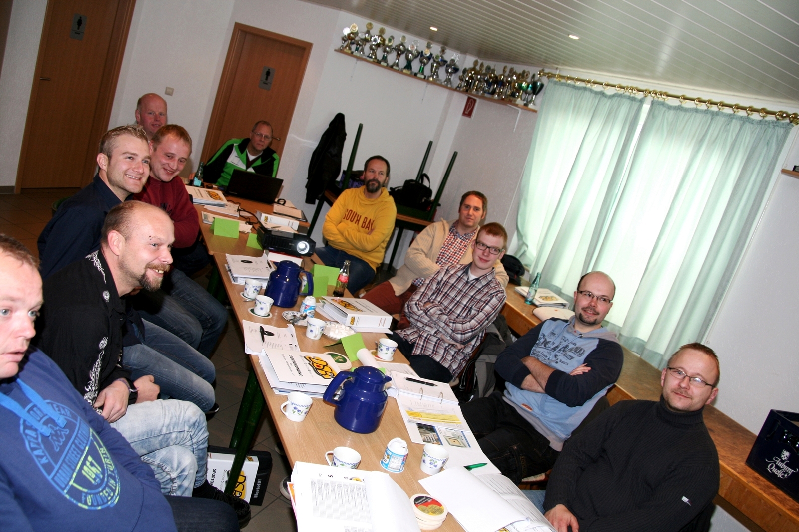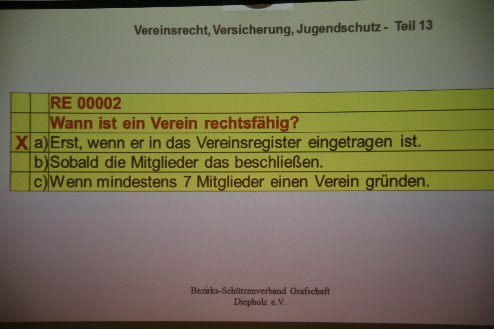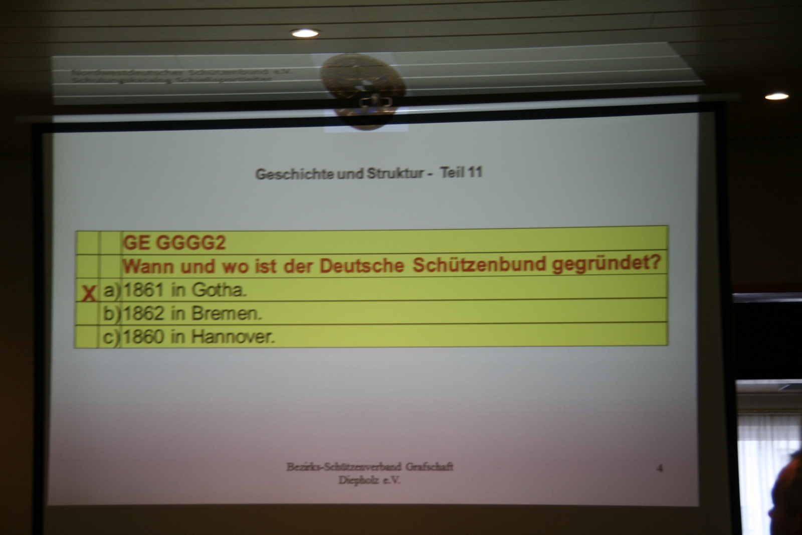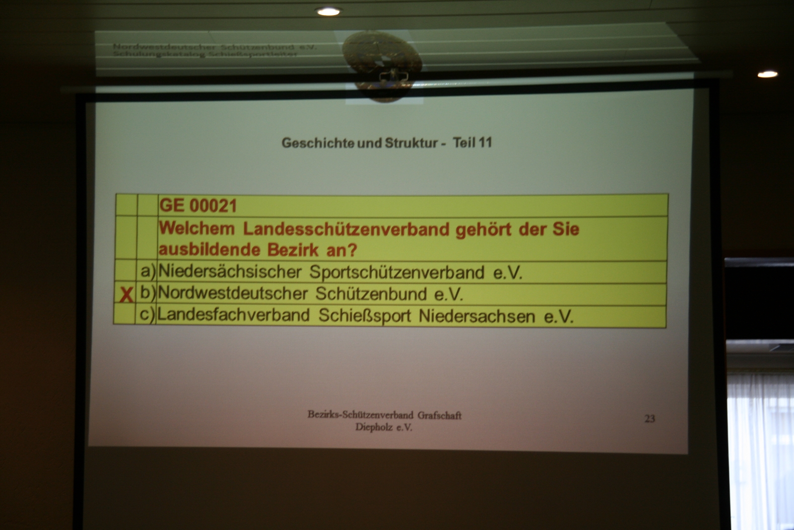 Am Samstagmorgen, den 12. November, dem „Prüfungstag“, standen Wiederholungen auf dem Programm. Horst Brinkmann, Referent für Waffensachkunde, ließ über Powerpoint die evtl. Fragen revue passieren und testete so das Wissen der angehenden Schießsportleiter.