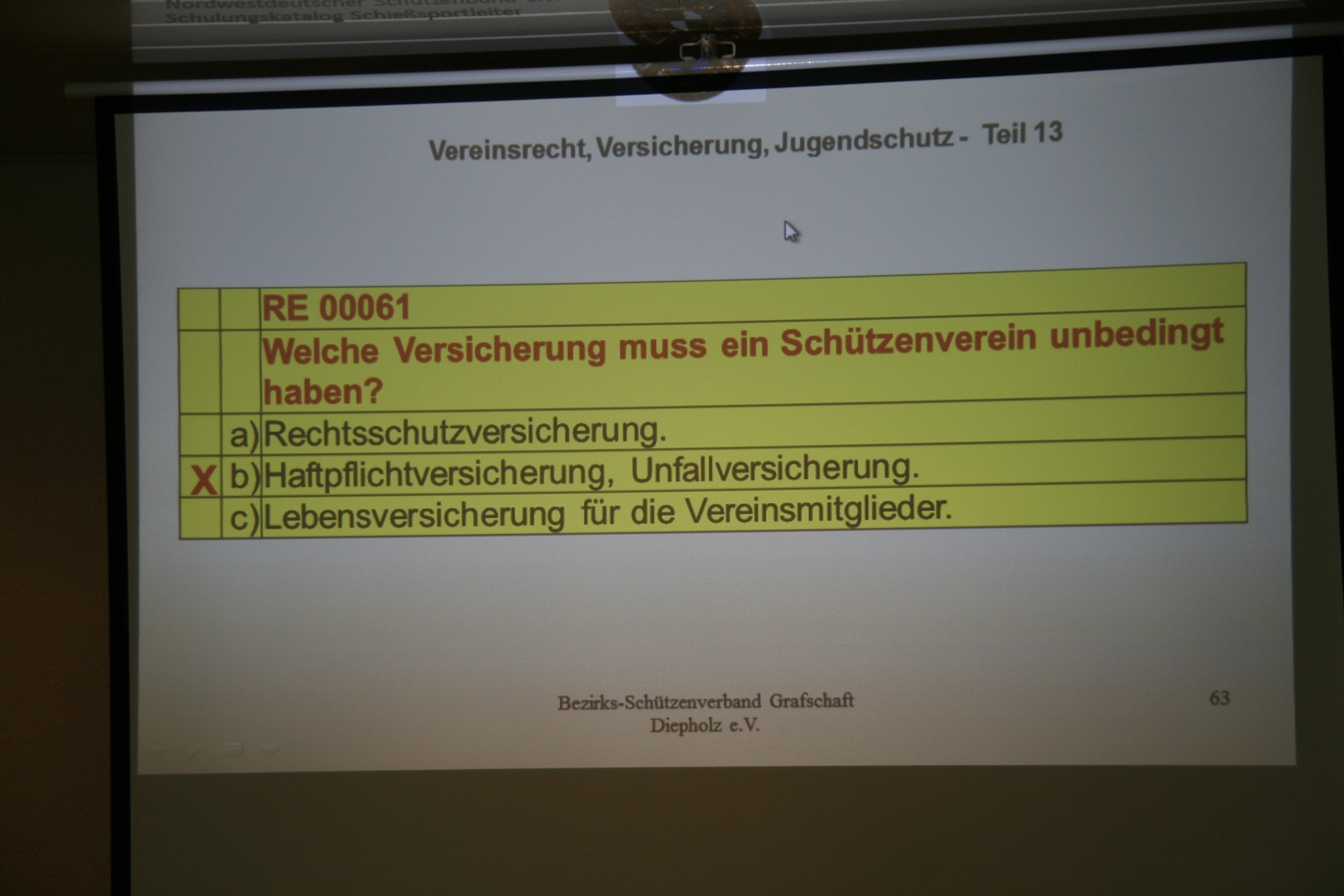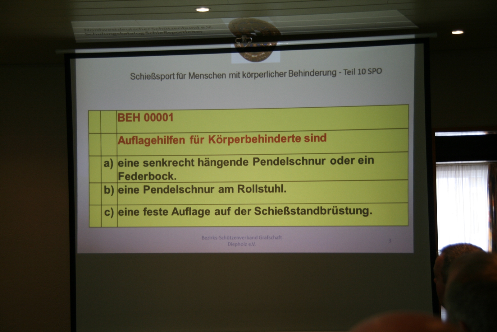 Bezirkssportleiter Siegfried Brockmann, die Referenten Horst Brinkmann, Edmar Beier, Wolfgang Mohrmann sowie Bezirkspräsident Karl-Friedrich Scharrelmann, informierten über ablauforganisatorische Meisterschaften, sportliche Angebote des DSB / NWDSB / Bezirk / Wettkampfpass / Stammverein / Rundenwett- und Ligawettkämpfe. Waffenpflege, Sicherheitsbestimmungen und auch Ballistik standen auf dem Programm. Das Wissen vom Vereinsrecht, Jugendschutzgesetz / Jugendarbeit im Verein / Jugendordnung / Aufsichtspflicht bei Jugendlichen / Mitverantwortung der Jugendlichen und Jugendsprecher wurde ebenso vermittelt.