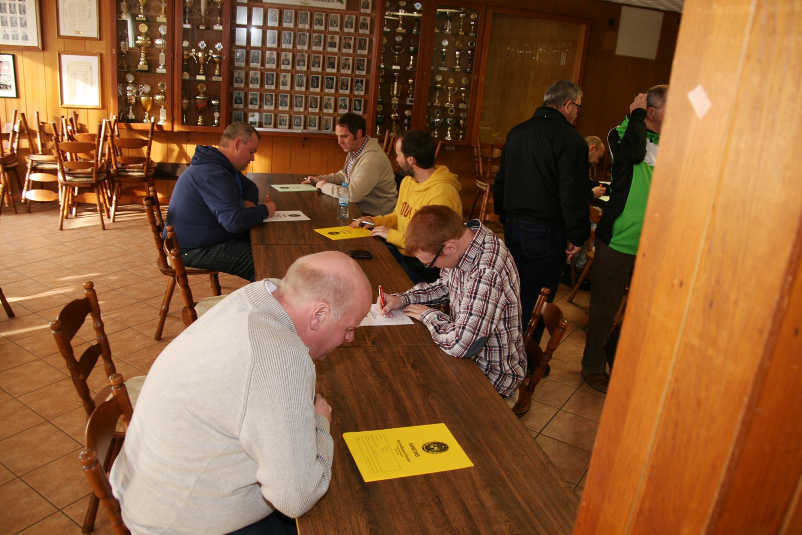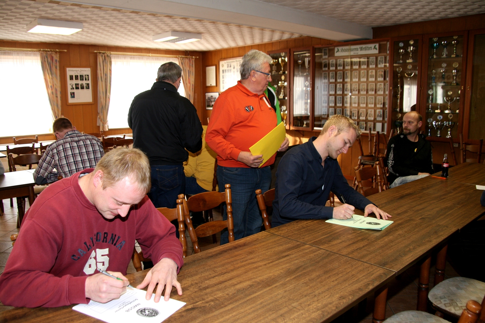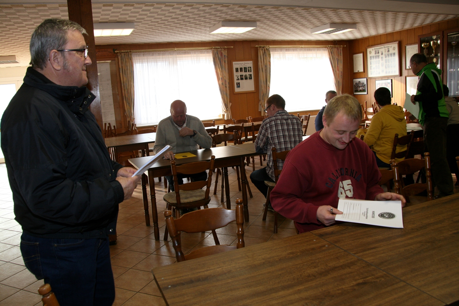 Horst Brinkmann, Friedel Kelkenberg und Siegfried Kemmsis verteilten anschließend die verschiedenfarbigen Fragebögen (grün, gelb u. weiß) für die schriftliche Prüfung. Dann wurde es „ernst“, nun mussten die Kreuzchen an der richtigen Stelle gemacht werden. 90 Fragen wurden auf diese Weise beantwortet.