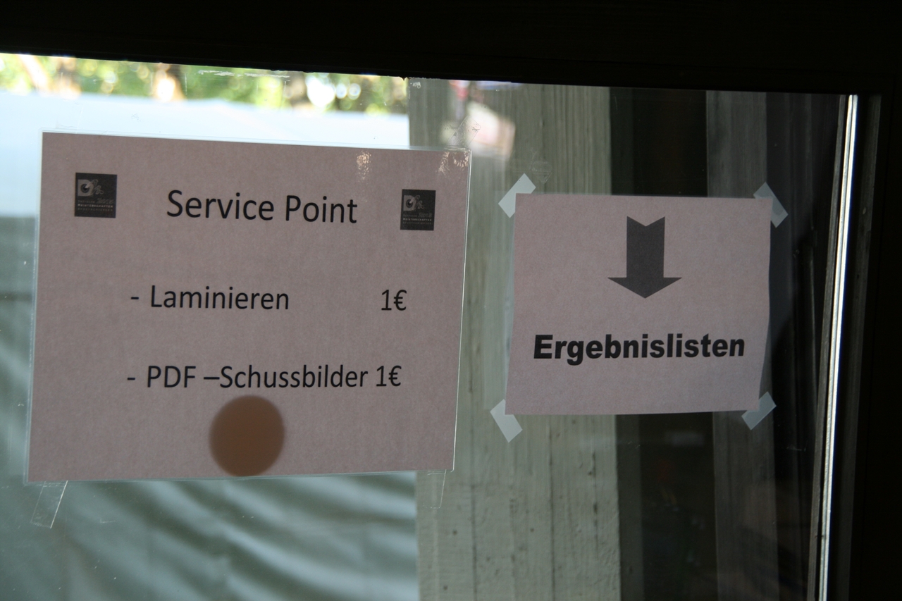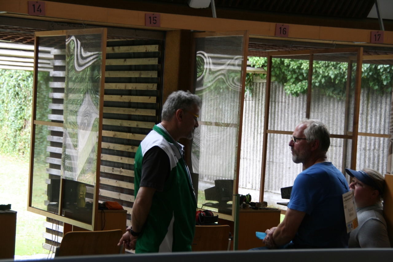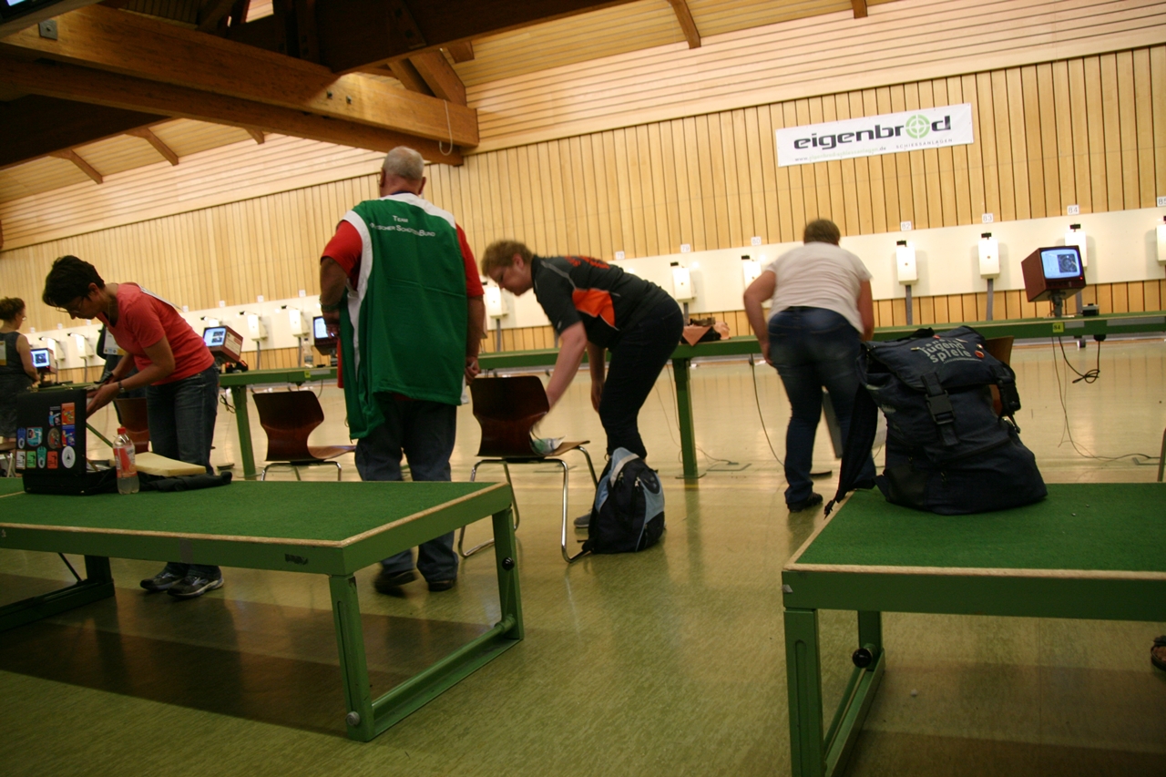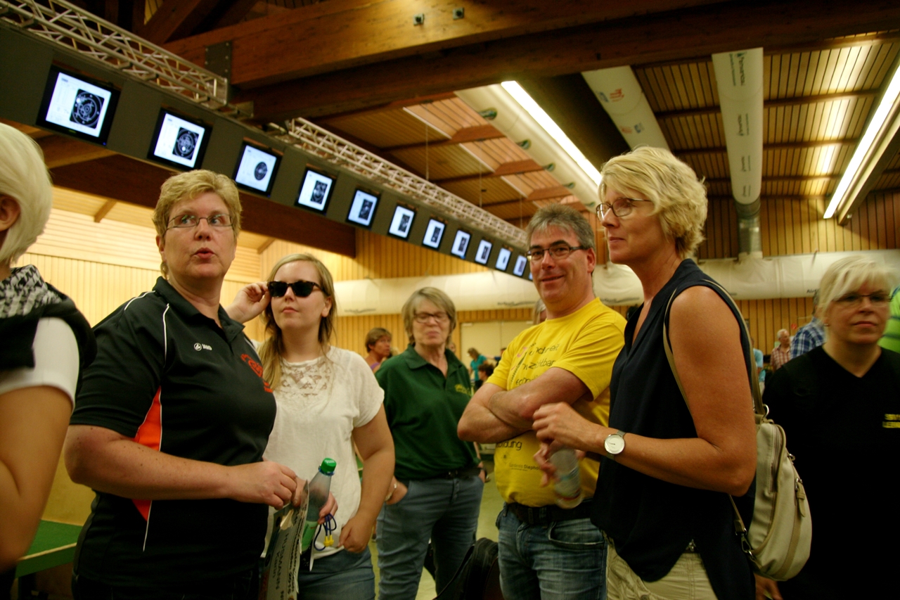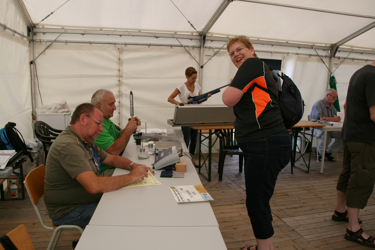 Zuerst die Startnummer ausdrucken und laminieren, dann mit der Luftpistole zur Waffenkontrolle. Da liefen uns schon die ersten Bekannten über den Weg, unter ihnen auch Horst Senkler und Ingrid Sommer mit ihren Mannschaftskolleginnen Rita Müller und Anette Teckemeyer (sie hatten die gleiche Startzeit wie Karin:13:30 Uhr).
