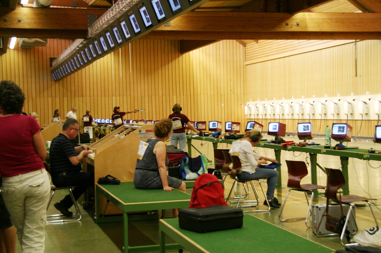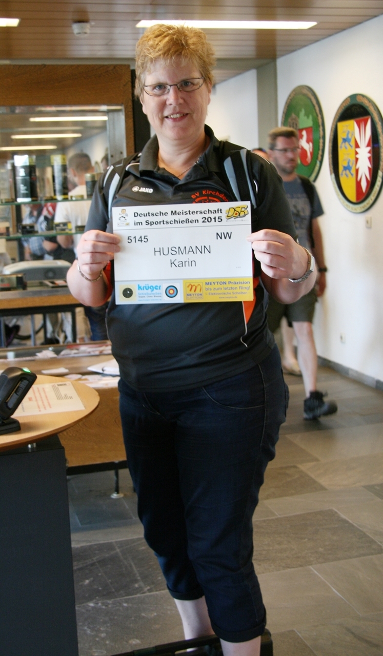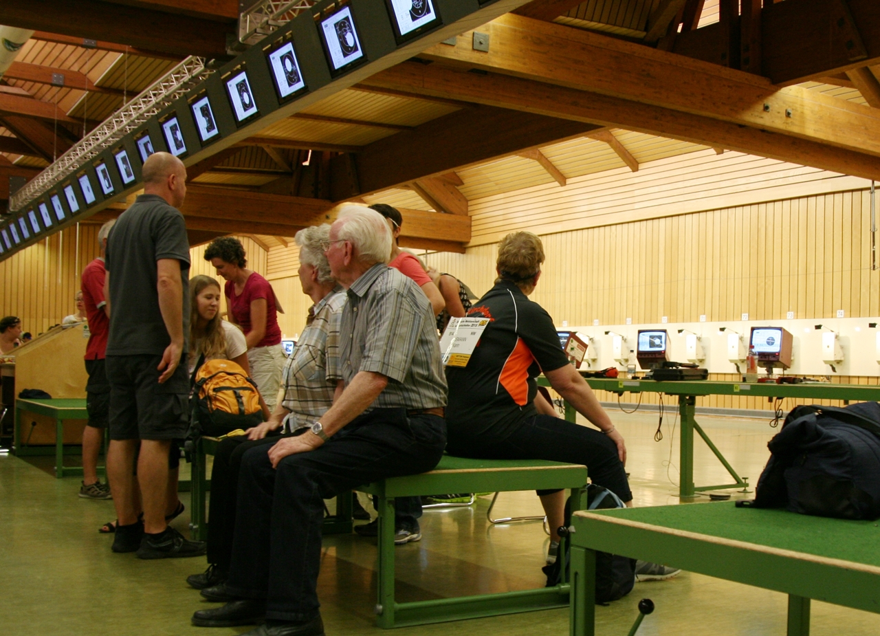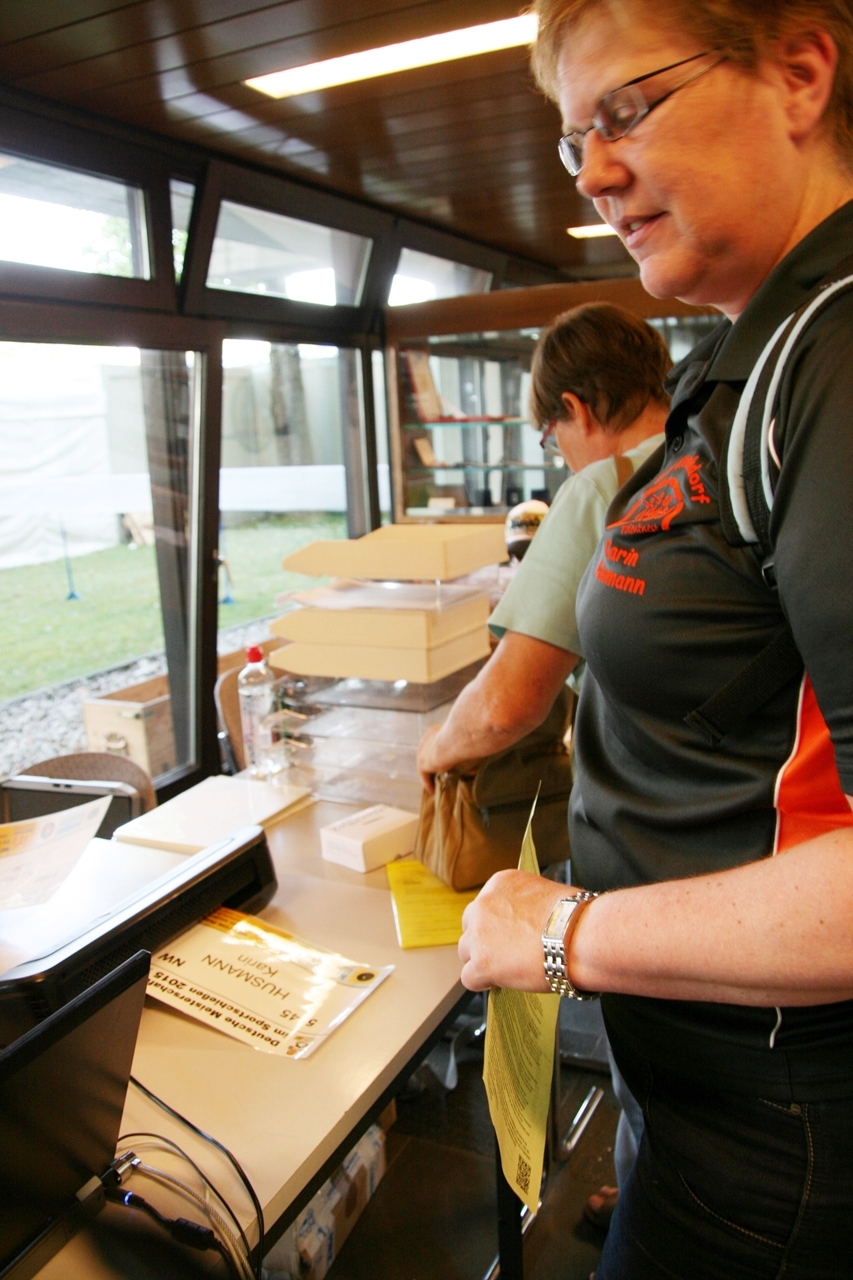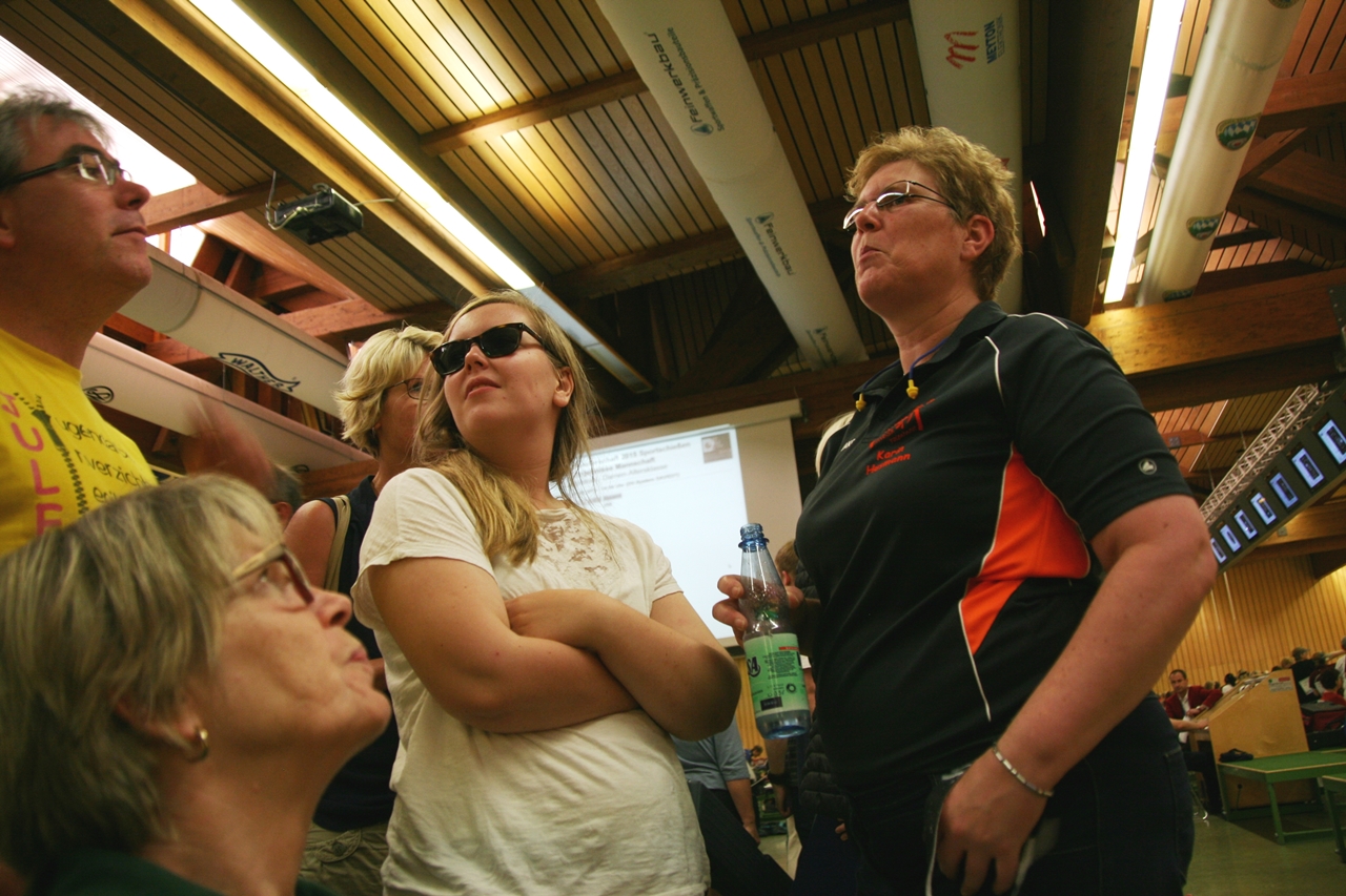 Zuerst die Startnummer ausdrucken und laminieren, dann mit der Luftpistole zur Waffenkontrolle. Da liefen uns schon die ersten Bekannten über den Weg, unter ihnen auch Horst Senkler und Ingrid Sommer mit ihren Mannschaftskolleginnen Rita Müller und Anette Teckemeyer (sie hatten die gleiche Startzeit wie Karin:13:30 Uhr).