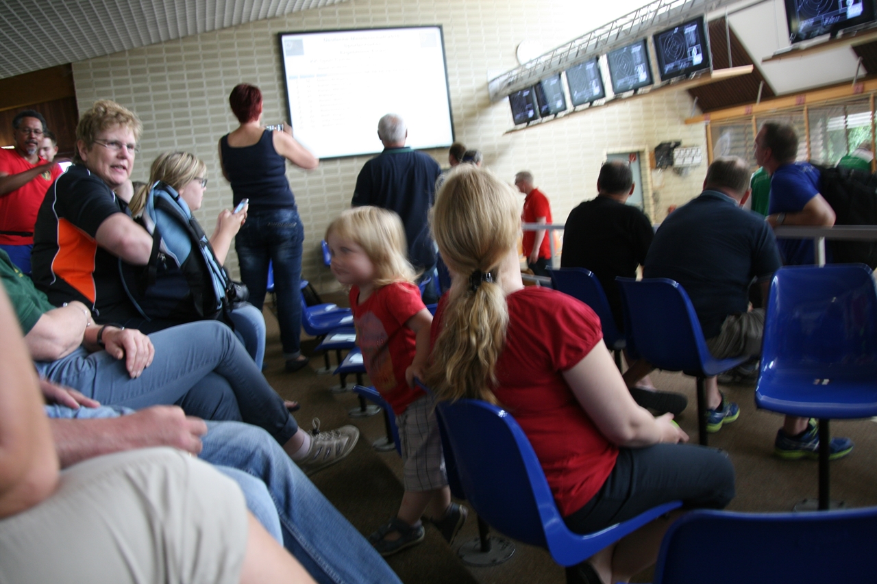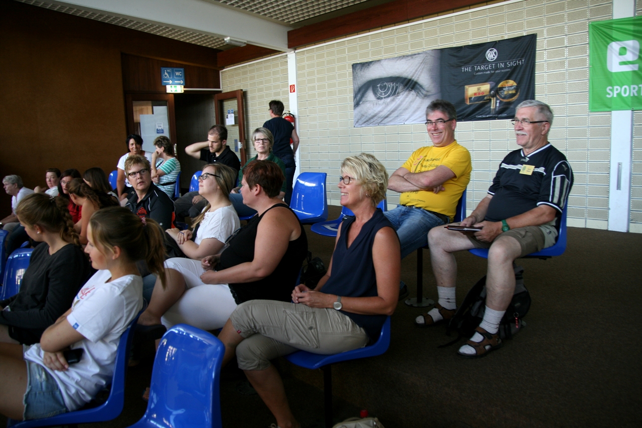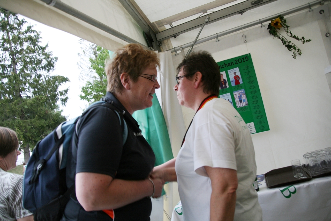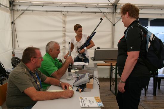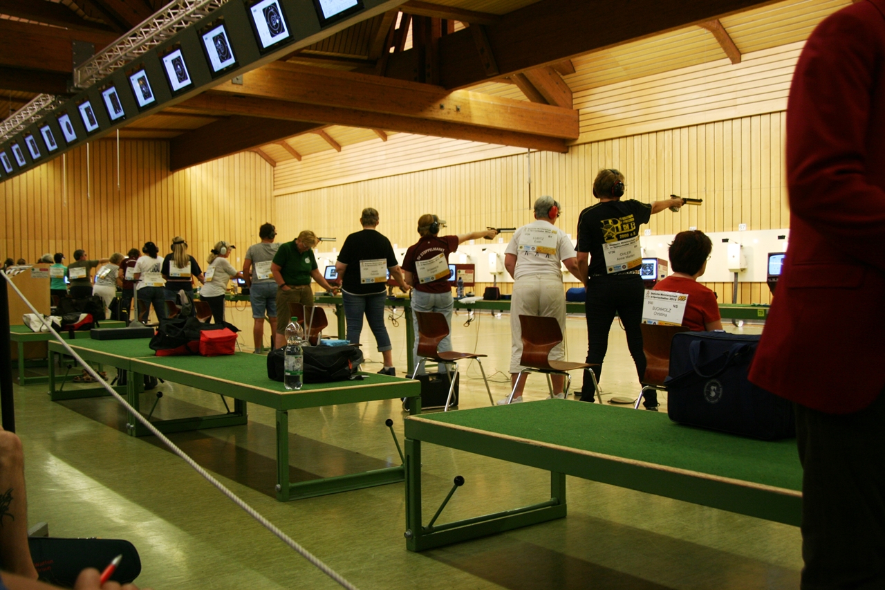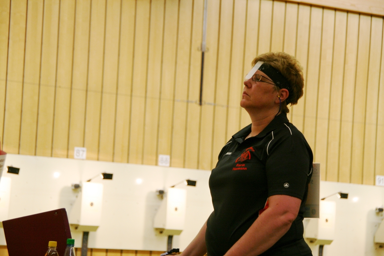 Zuerst die Startnummer ausdrucken und laminieren, dann mit der Luftpistole zur Waffenkontrolle. Da liefen uns schon die ersten Bekannten über den Weg, unter ihnen auch Horst Senkler und Ingrid Sommer mit ihren Mannschaftskolleginnen Rita Müller und Anette Teckemeyer (sie hatten die gleiche Startzeit wie Karin:13:30 Uhr).