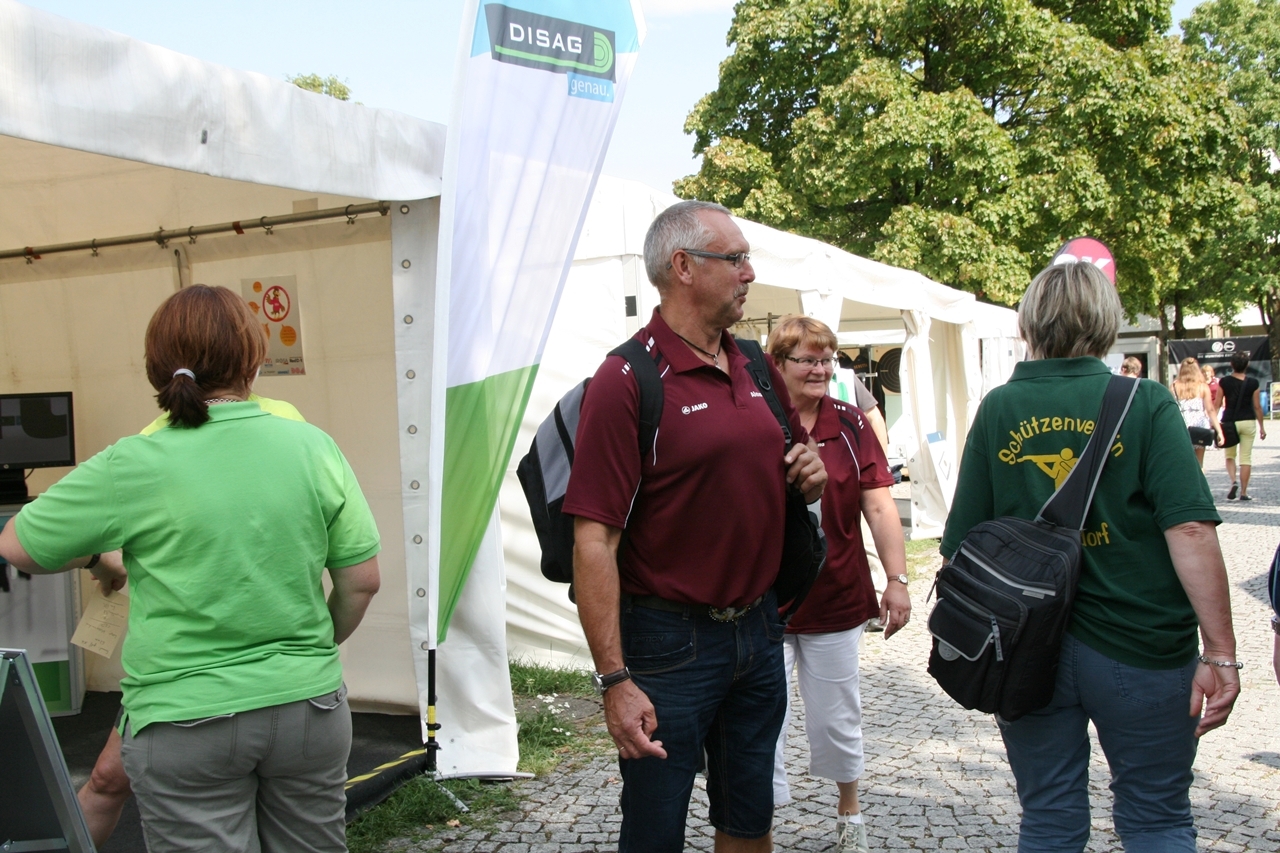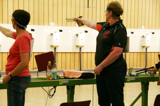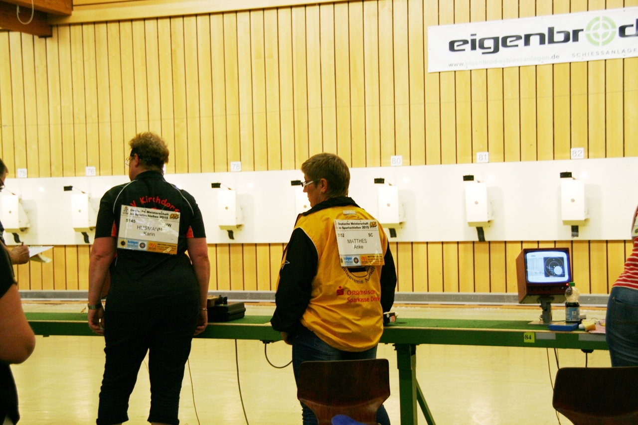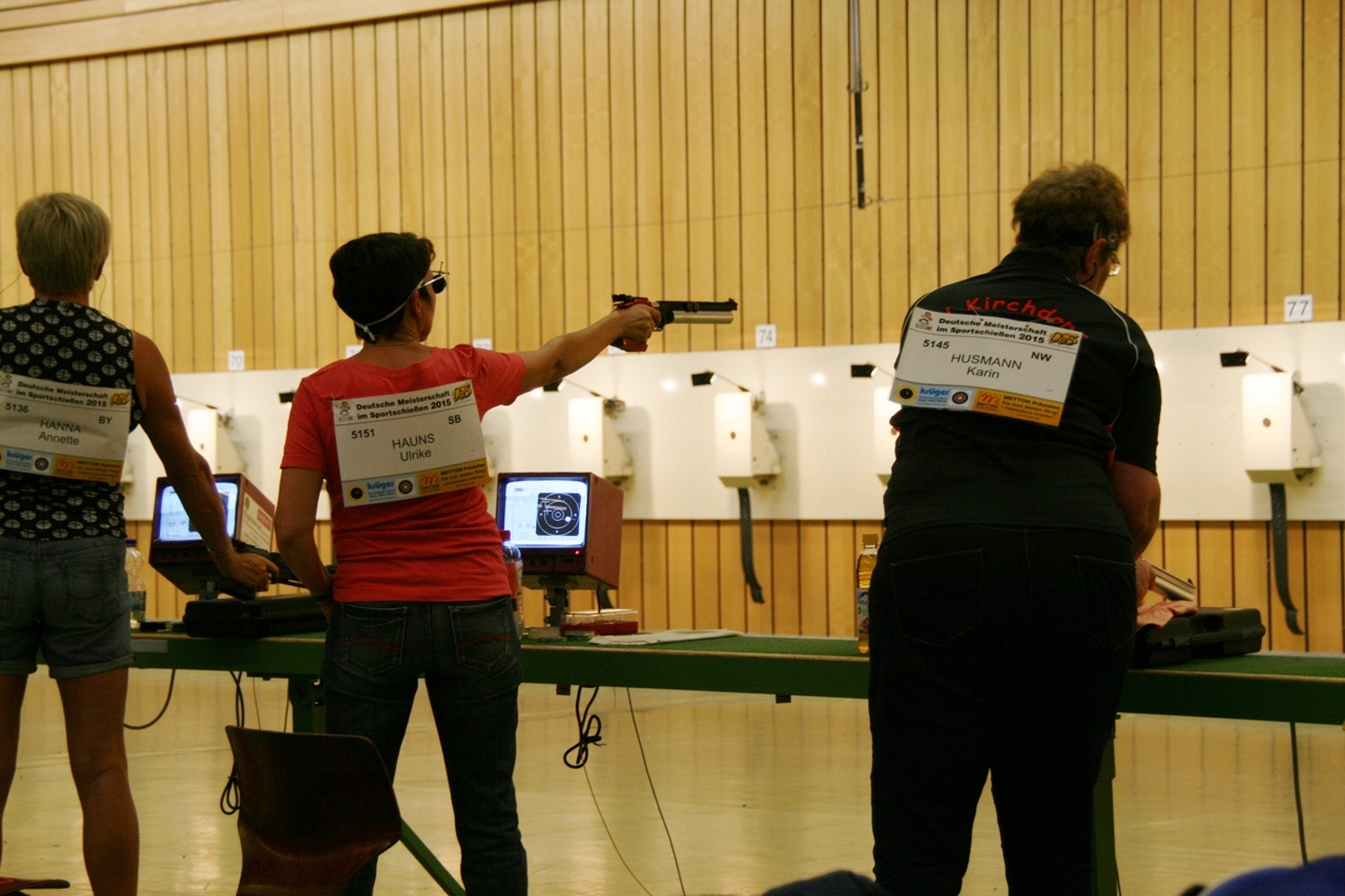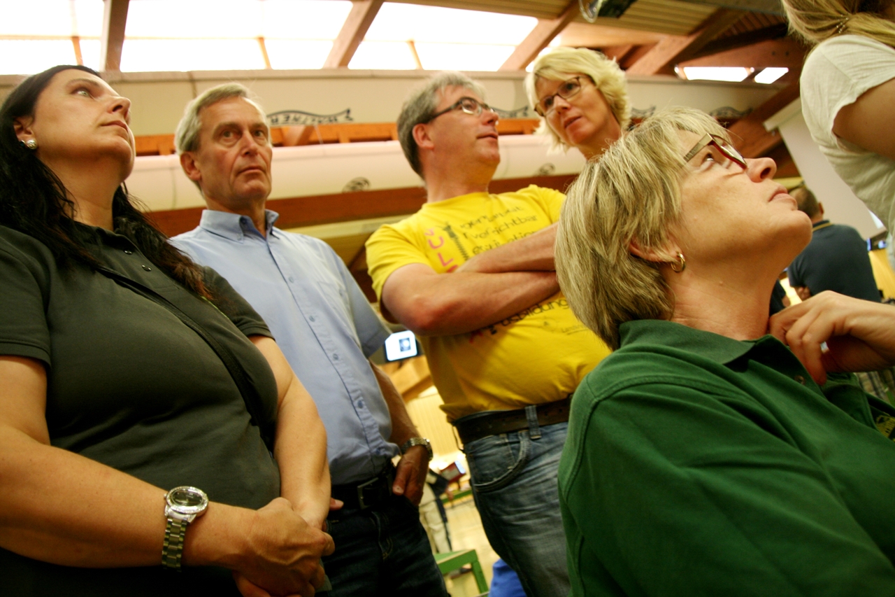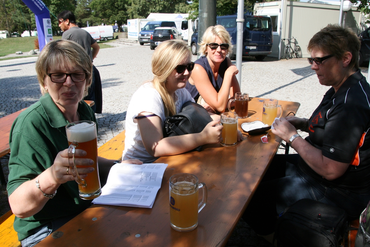Zuerst die Startnummer ausdrucken und laminieren, dann mit der Luftpistole zur Waffenkontrolle. Da liefen uns schon die ersten Bekannten über den Weg, unter ihnen auch Horst Senkler und Ingrid Sommer mit ihren Mannschaftskolleginnen Rita Müller und Anette Teckemeyer (sie hatten die gleiche Startzeit wie Karin:13:30 Uhr).