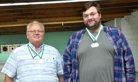 Philipp Scharrelmann (rechts) konnte sich am Samstag, den 13. Juli von zehn Teilnehmern der Herrenklasse I in der Disziplin 25m Schnellfeuerpistole, mit 541 Ringen an die Spitze setzen - im ersten Durchgang 8 - 6 und 4 Sek. = 263 Ringe und im zweiten Durchgang 278 Ringe - Seine "Verfolger" waren Paul-Philipp Mühlenbeck (511 R.) von der Bremer SGi und Maximilian Berendsen (511 R.) vom SV Reitland.
