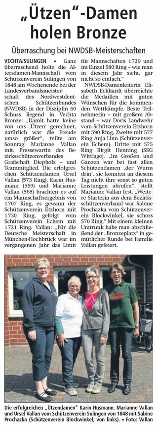 Ganz überraschend hat sich die Mannschaft-Altersdamen vom SV von 1848 Sulingen in der Disziplin 60 Schuß Liegend in Vechta/SV Stoppelmarkt an 3. Stelle "eingereiht". Damit hatte keiner gerechnet, darum war die Freude natürlich um so größer... Die glücklichen Schützinnen sind von links: Karin Husmann (569 R.), Marianne Vallan (565 R.)und Ursel Vallan (573 R.) Ihr Mannschaftsergebnis war 1707 Ringe, es gewann der SV Etzhorn mit 1730 Ringen, gefolgt vom SV Echem mit 1721 Ringen. Für die Deutsche Meisterschaft in München-Hochbrück war im vergangenen Jahr das Limit für Mannschaften 1729 und im Einzel 580 Ringe, wie man in diesem Jahr sieht, gar nicht so einfach...
