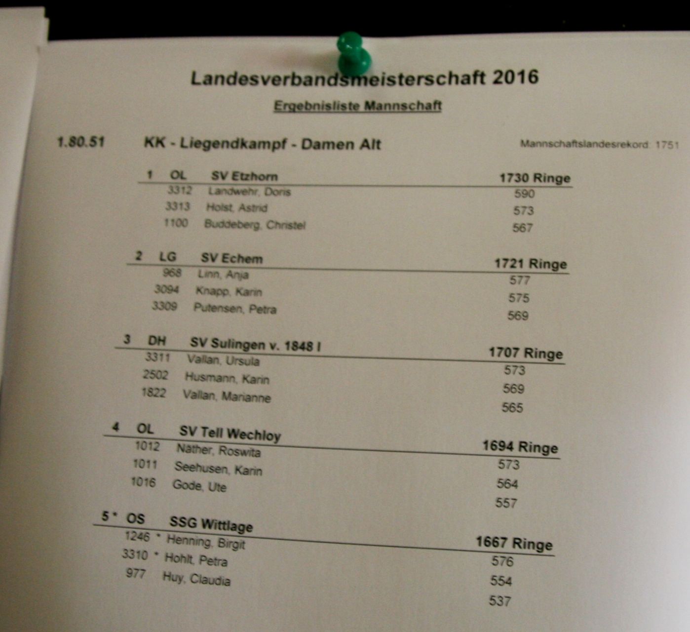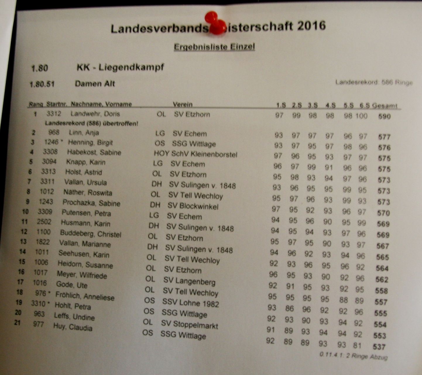 Beste Schützin mit großem Abstand war Doris Landwehr vom SV Etzhorn mit tollen 590 Ringen! Zweite mit 577 Ring wurde Anja Linn vom SV Echem und Dritte Birgit Henning von der SSG Wittlage (575 R.) Im Großen und Ganzen war bei fast allen Schützinnen der "Wurm" drin, sie konnten an diesem Tag nicht ihre sonst so guten Leistungen abrufen.