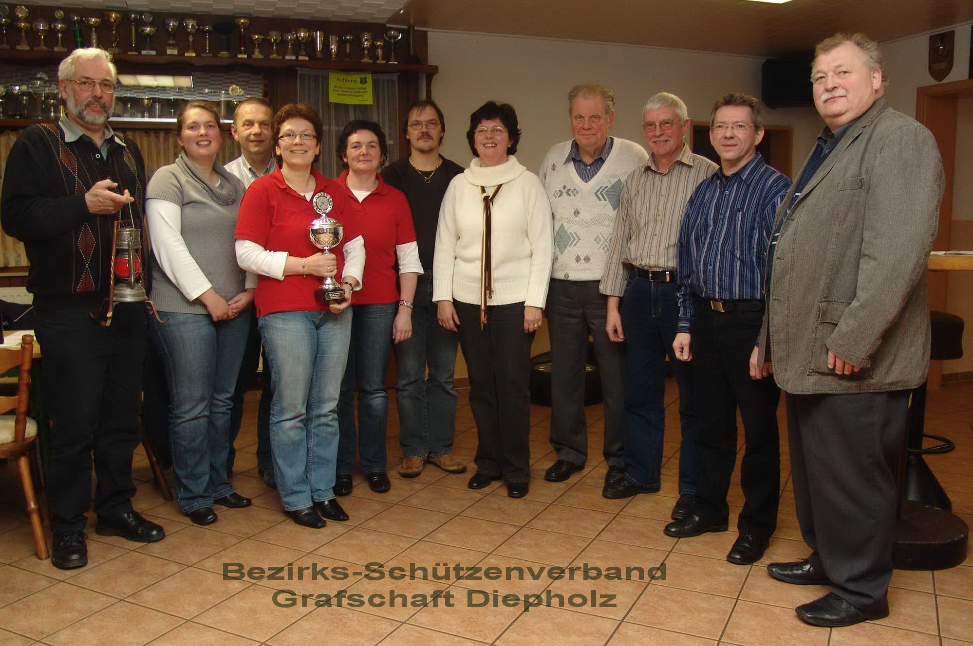Der siegreiche Kreisverband mit Wanderpokal und Manfred Rüffer (links) mit der roten Laterne, sowie Bezirkspräsident Scharrelmann und Sportleiter Brockmann (von rechts) nach der Siegerehrung
