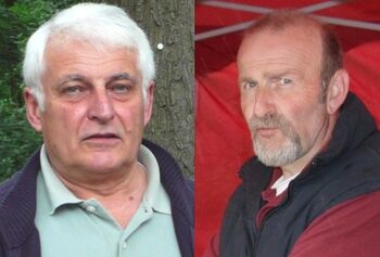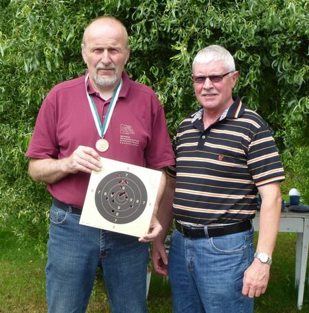Die beiden Stranger Perkussionsschützen Karl-Heinz Ullmann (mit LM-Bronzemedaille u. seinem Schußbild) und Herbert Schwenker