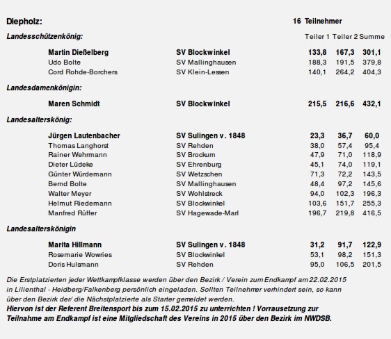 Der Endkampf um die verschiedenen Landeskönigstitel wird am 22. Februar 2015 in Lilienthal / Heidberg – Falkenberg ausgetragen.