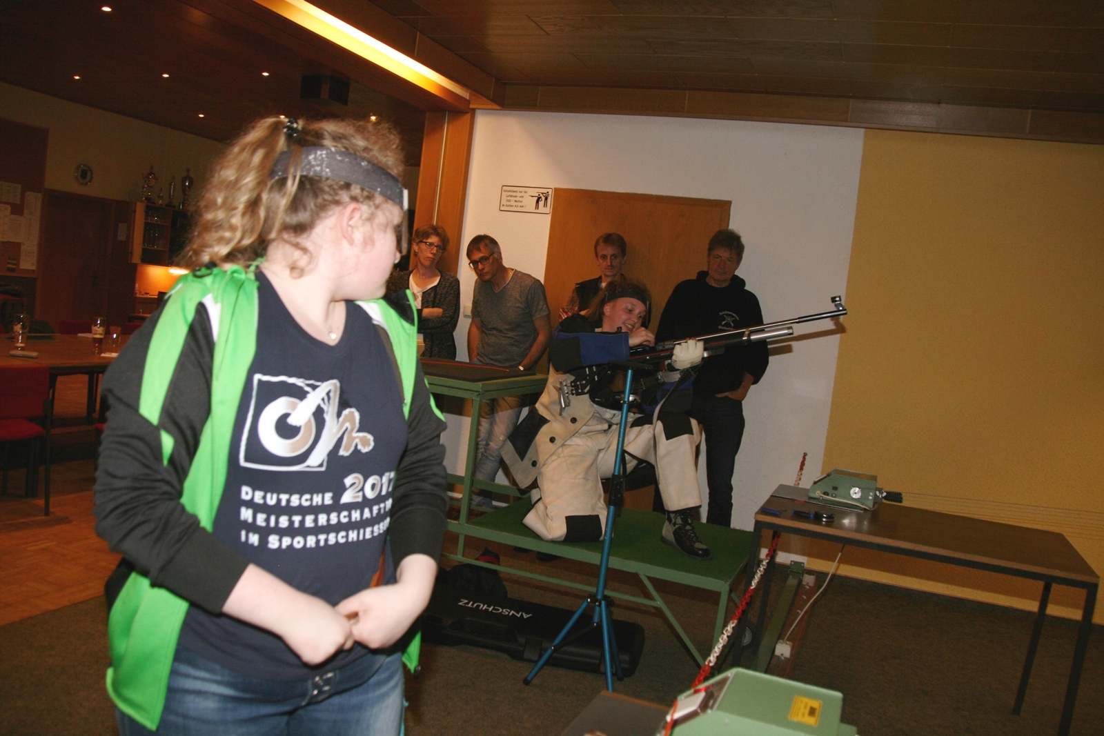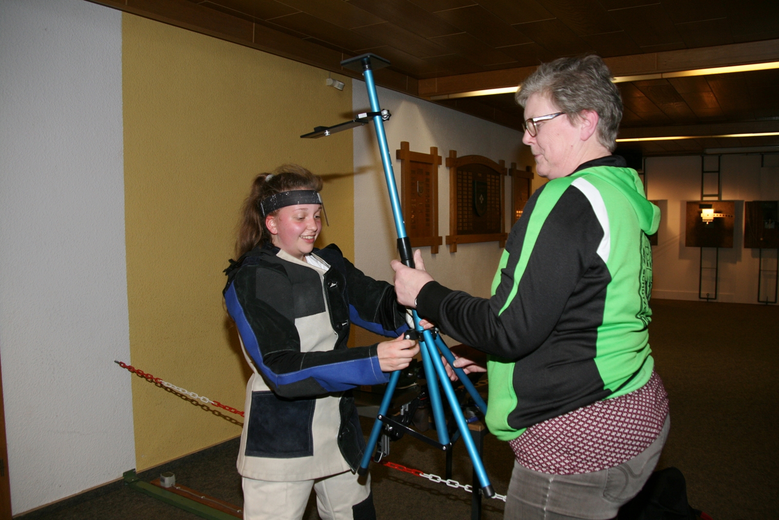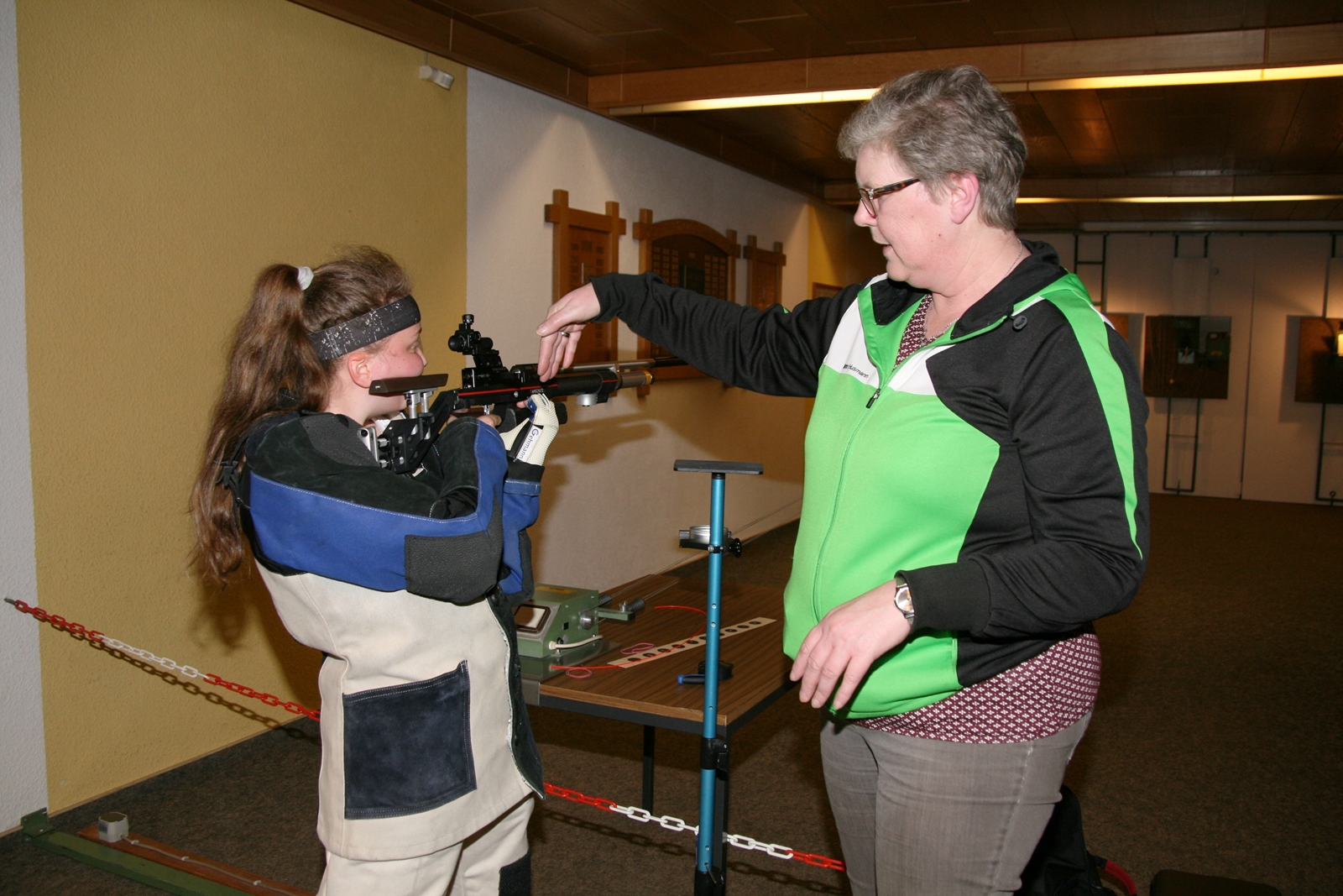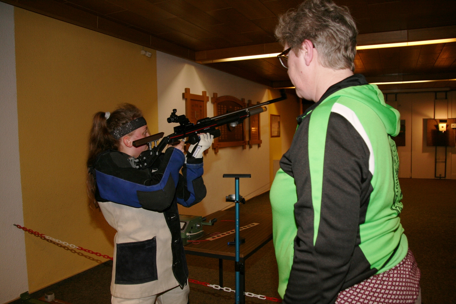 Karin Husmann erklärte sehr ausführlich die einzelnen Schritte beim Luftgewehr 3 – Stellungskampf, welche Lea-Sophie Osterkamp gleich in die Tat umsetzte. Sie absolvierte je 1/3 ihres Pensums im knienden (mit Kniendrolle), liegenden und stehenden Anschlag.