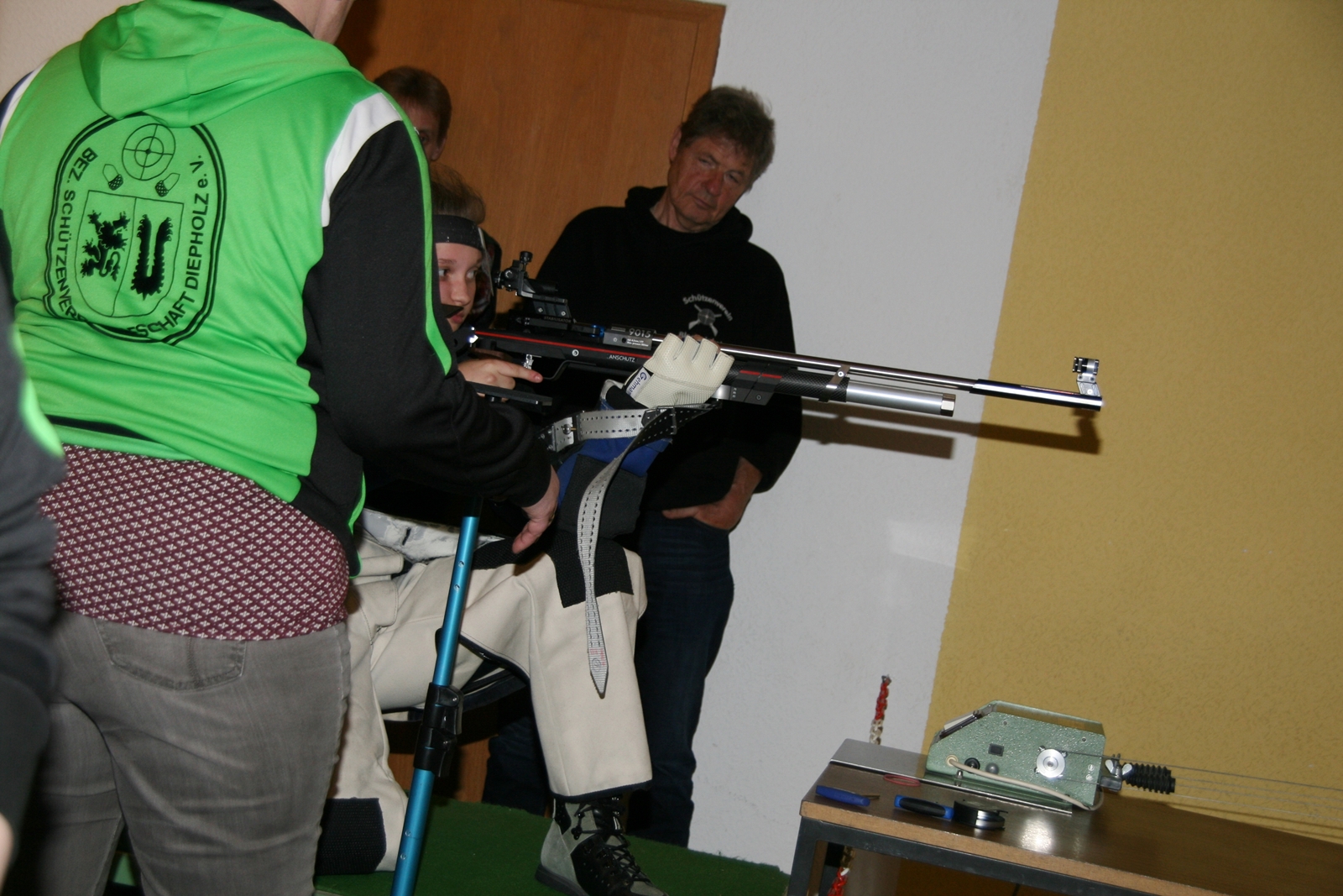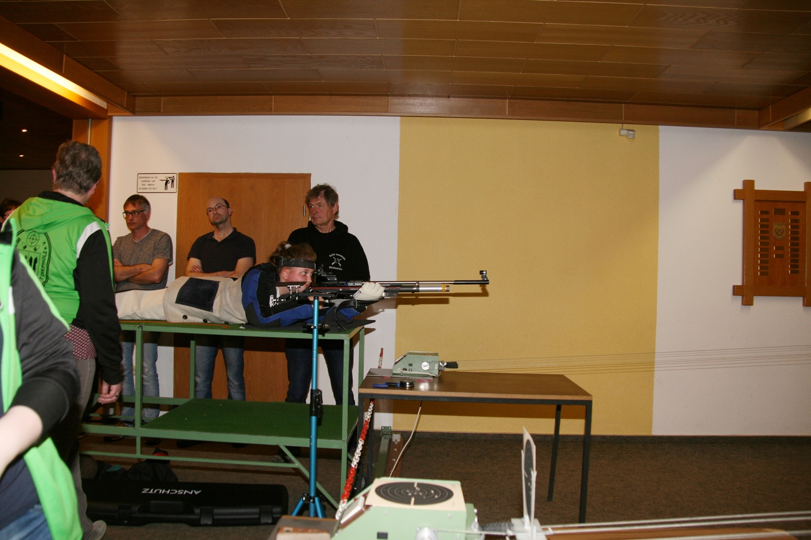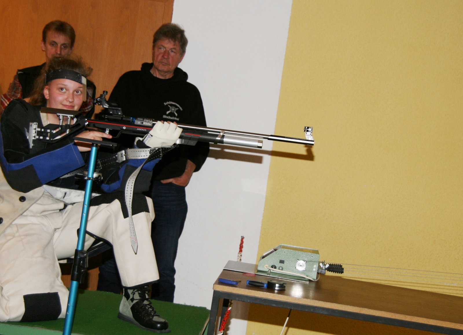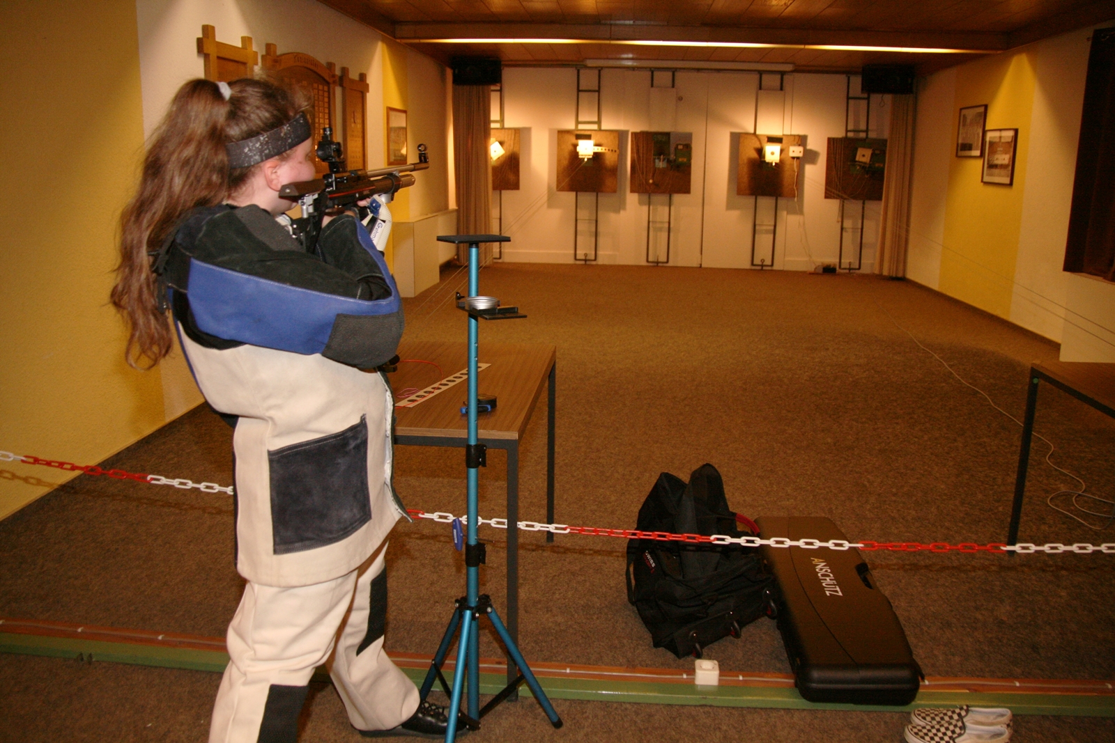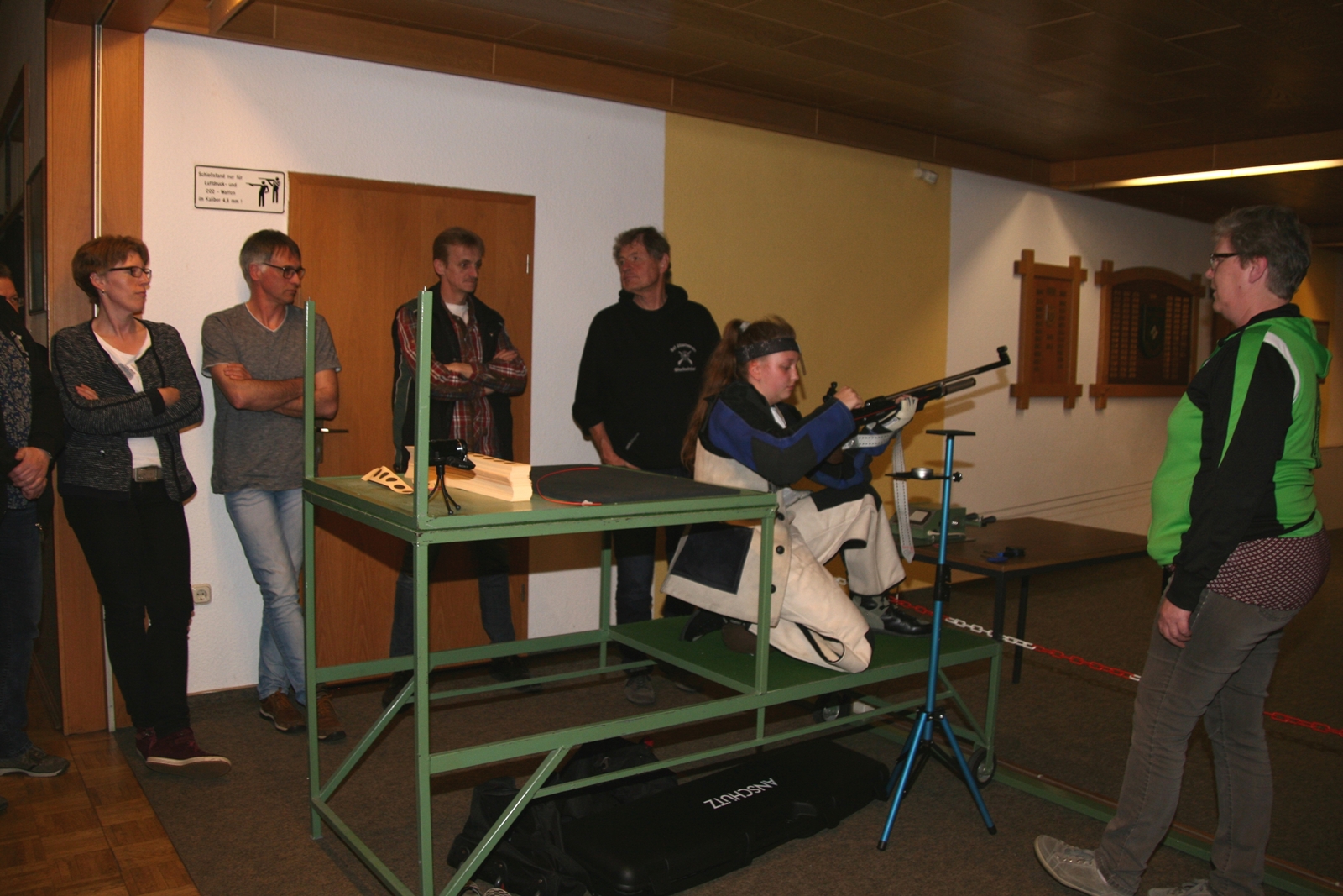 Karin Husmann erklärte sehr ausführlich die einzelnen Schritte beim Luftgewehr 3 – Stellungskampf, welche Lea-Sophie Osterkamp gleich in die Tat umsetzte. Sie absolvierte je 1/3 ihres Pensums im knienden (mit Kniendrolle), liegenden und stehenden Anschlag.