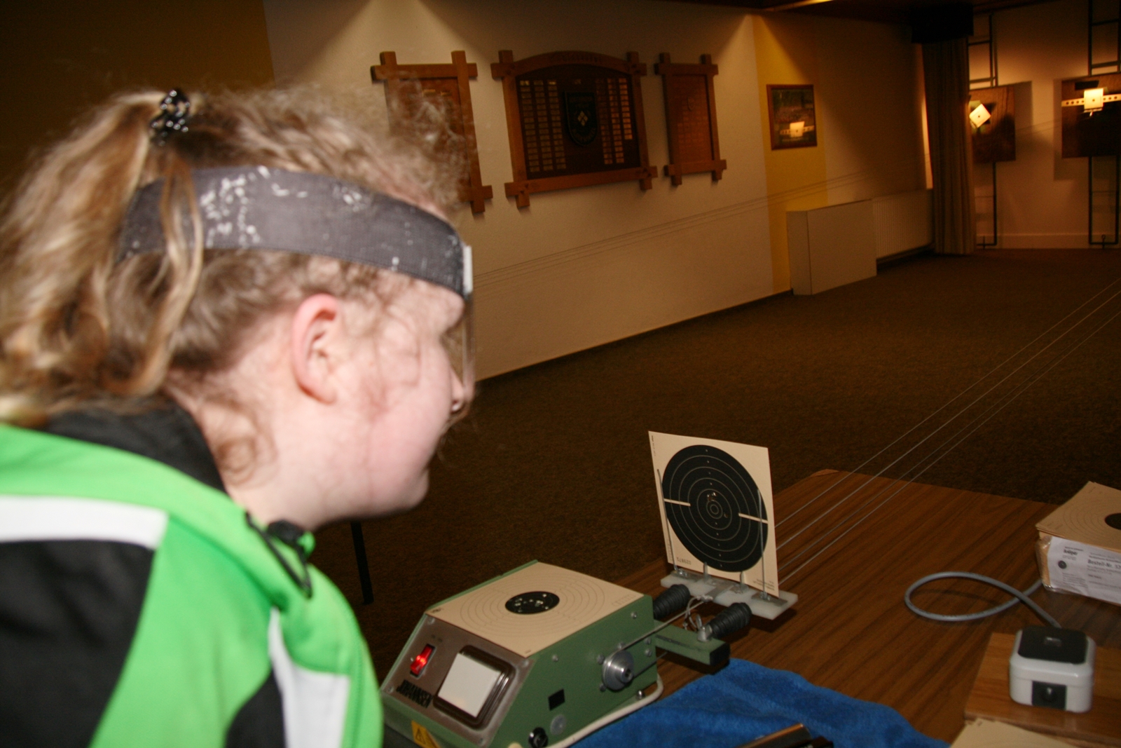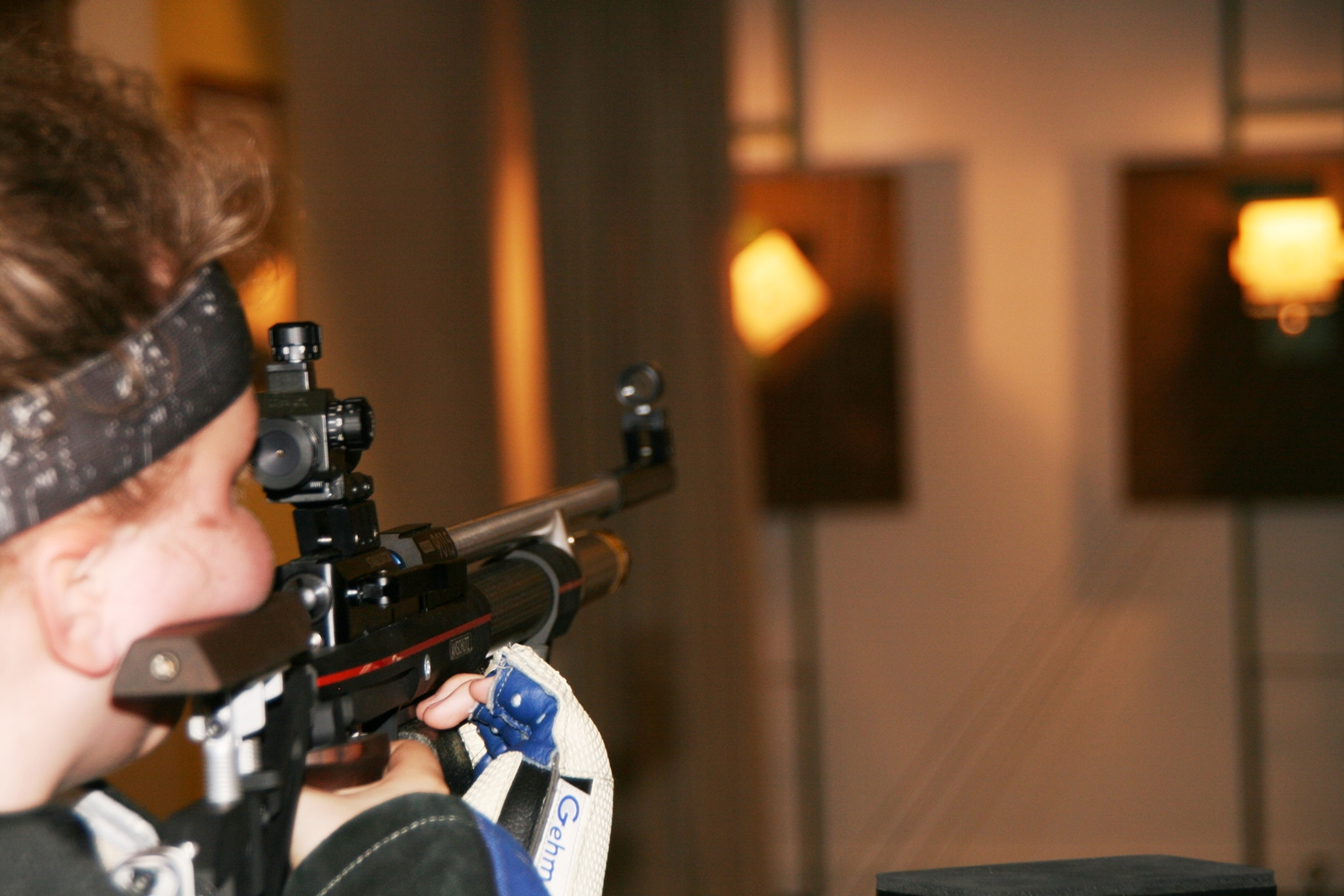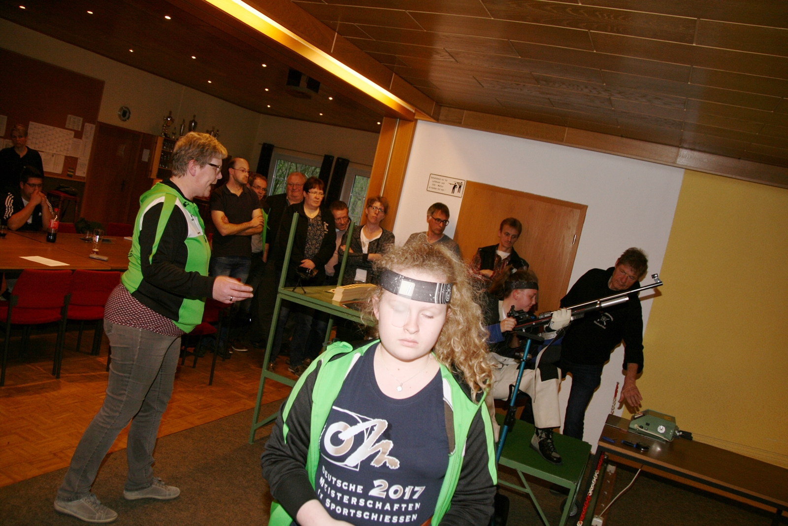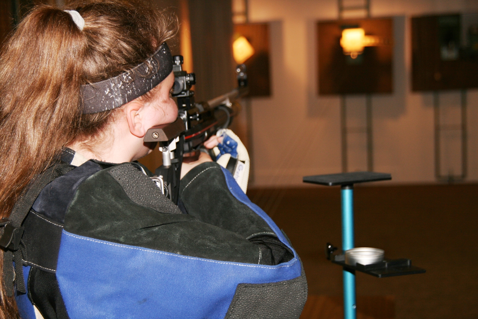Karin Husmann erklärte sehr ausführlich die einzelnen Schritte beim Luftgewehr 3 – Stellungskampf, welche Lea-Sophie Osterkamp gleich in die Tat umsetzte. Sie absolvierte je 1/3 ihres Pensums im knienden (mit Kniendrolle), liegenden und stehenden Anschlag.