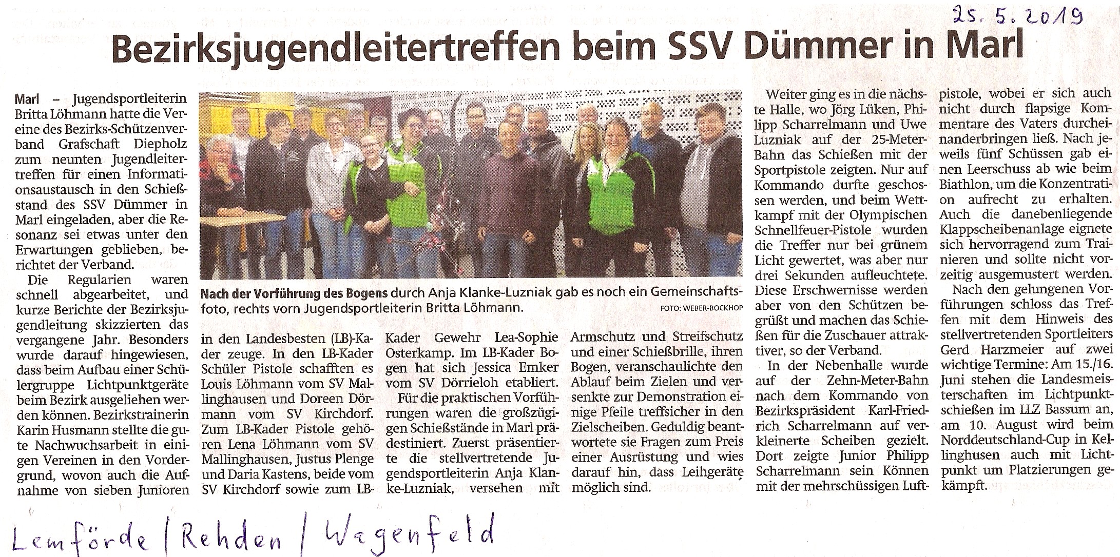 Das 9. Jugendleitertreffen des Bezirks Schützenverbandes Grafschaft Diepholz fand in diesem Jahr beim SSV Dümmer statt. Jugendsportleiterin Britta Löhmann hatte zusammen mit ihrer Stellvertreterin Anja Klanke-Luzniak zu diesem Treffen eingeladen. Die Interessierten kamen aus den Mitgliedsvereinen Brockum, Blockwinkel, Drebber von 1900, Kirchdorf, Rehden, SK Diepholz, SSV Dümmer, Mallinghausen, Stemshorn, Schwaförden, Wetschen und Wohlstreck.