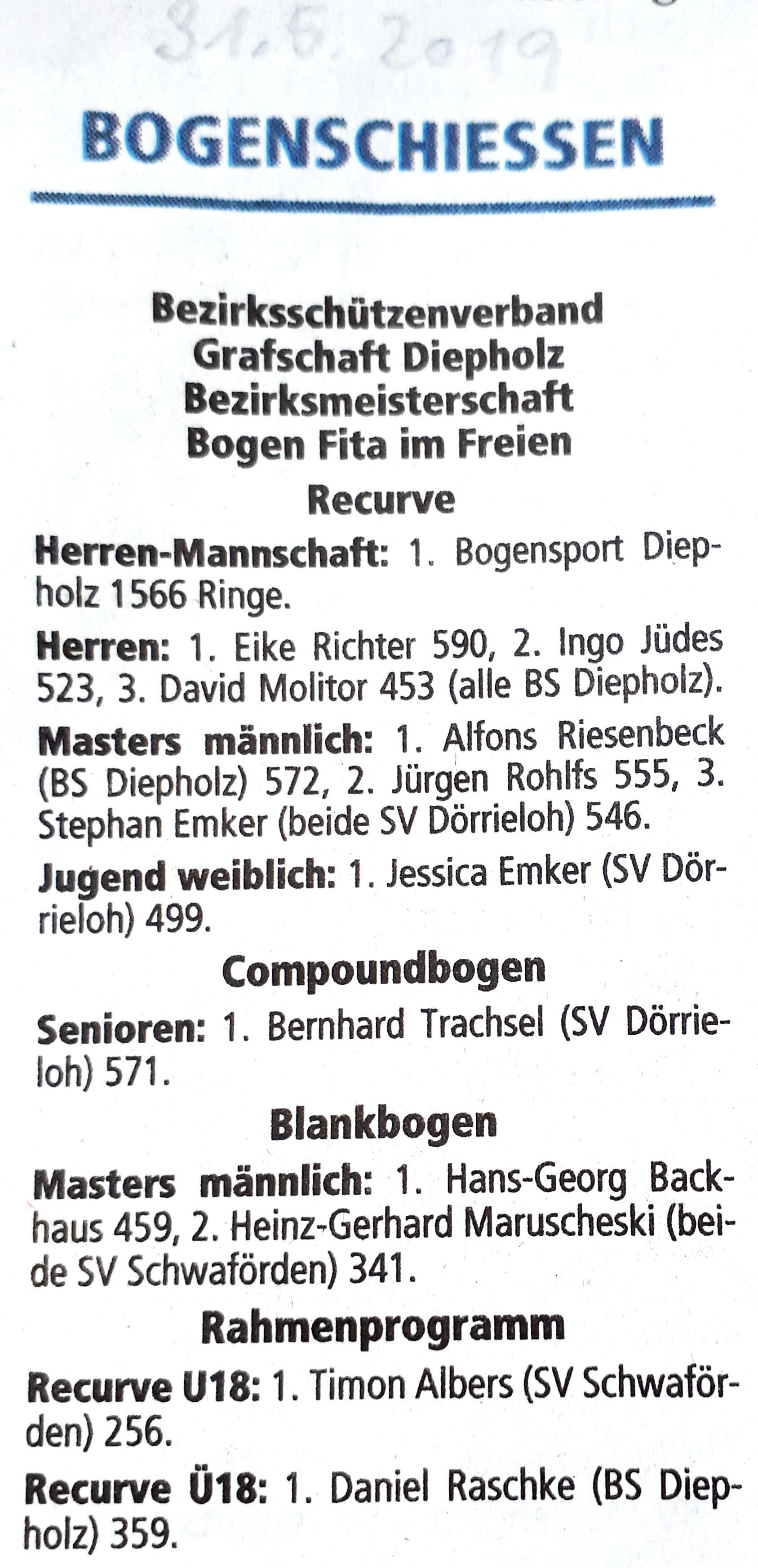 Am 26. Mai fand beim Bogensport Diepholz die Bezirksmeisterschaft Bogen Fita im Freien statt. Hier wurde natürlich wieder um gute Ergebnisse gekämpft: das heisst nach Möglichkeit eine solch hohe Ringzahl zu erreichen, dass es für die Landesverbandsmeisterschaft am 30. Juni in Zeven reicht!