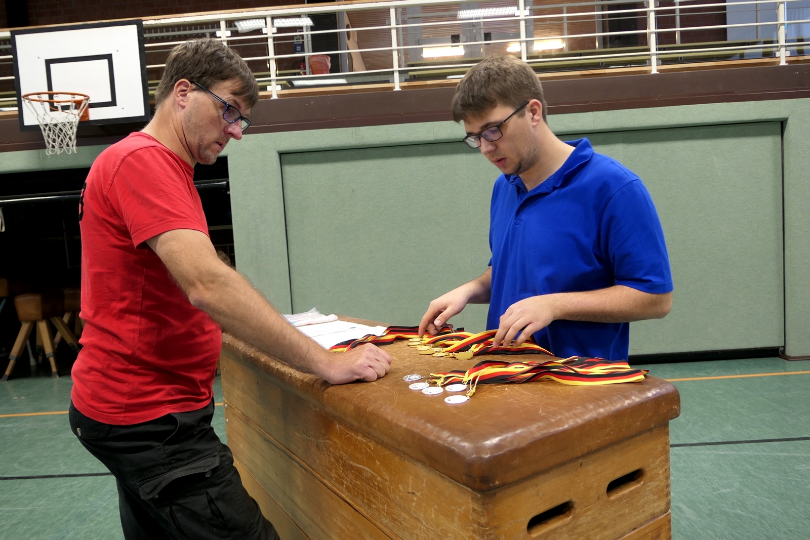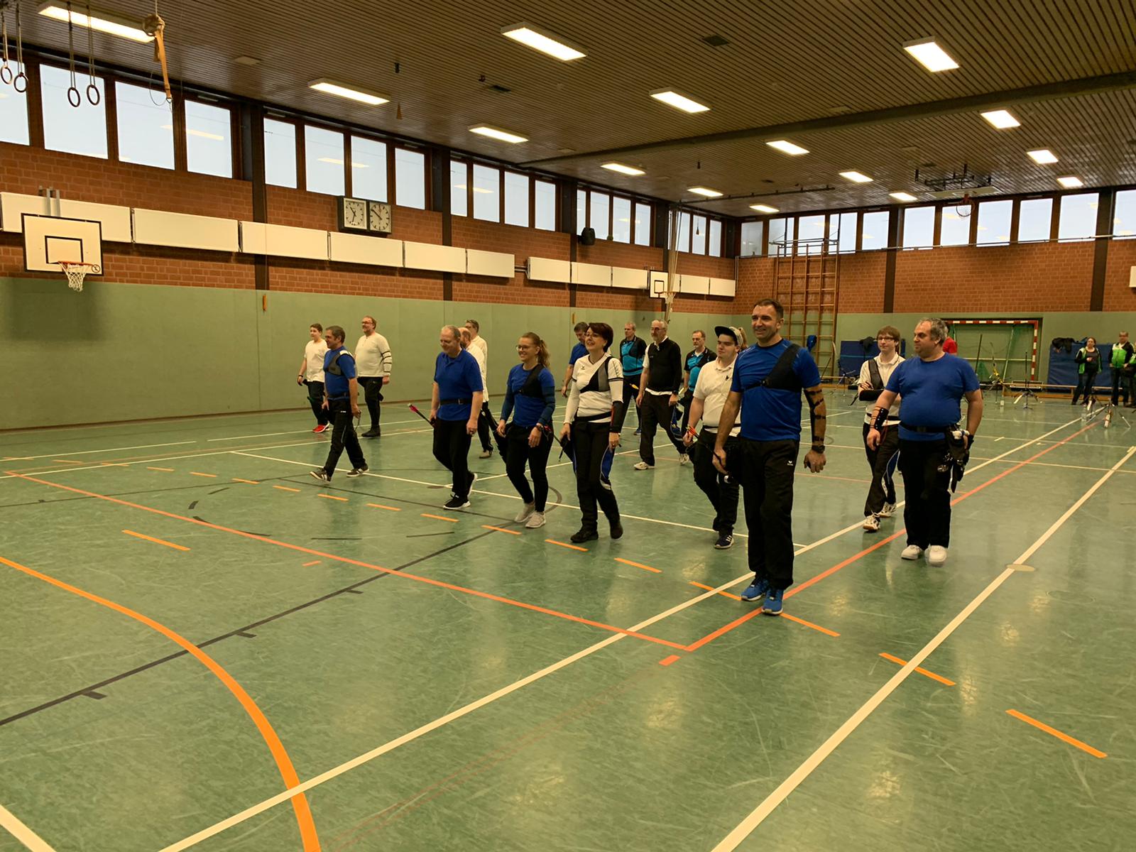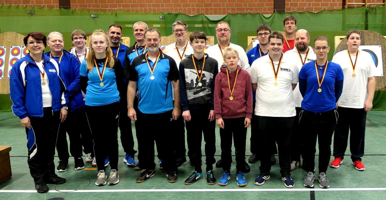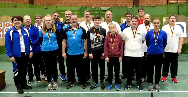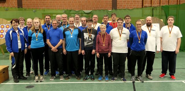 Alle Platzierten der Bezirksmeisterschaft Bogen Halle 2020, von links: Anja Klanke-Luzniack, Alfons Riesenbeck, Philipp Scharfenberg, Jessica Emker, David Molitor, Stephan Emker, Jürgen Rolfs, Hans-Georg Backhaus, Timon Albers, Klaus Hamann, Theo Klausing, Eike Richter, Martin Schudak, Andreas Schraubek, Heinz Maruschewski, Alina Wehage u. Philipp Wegner.