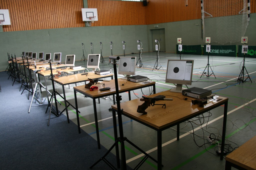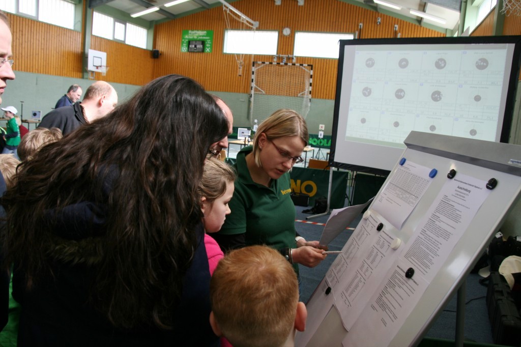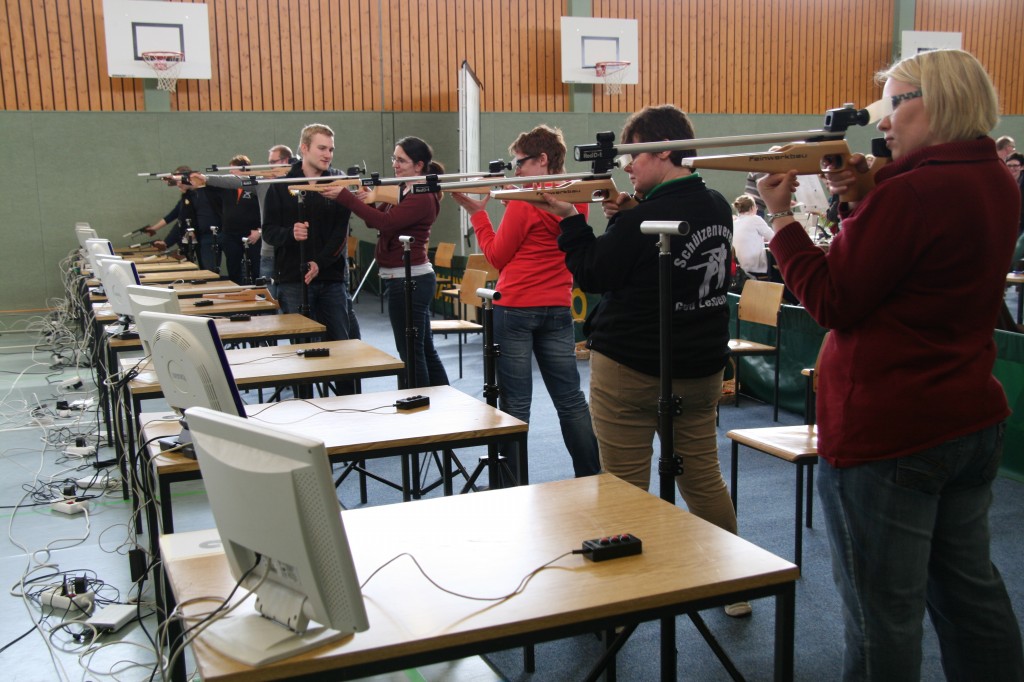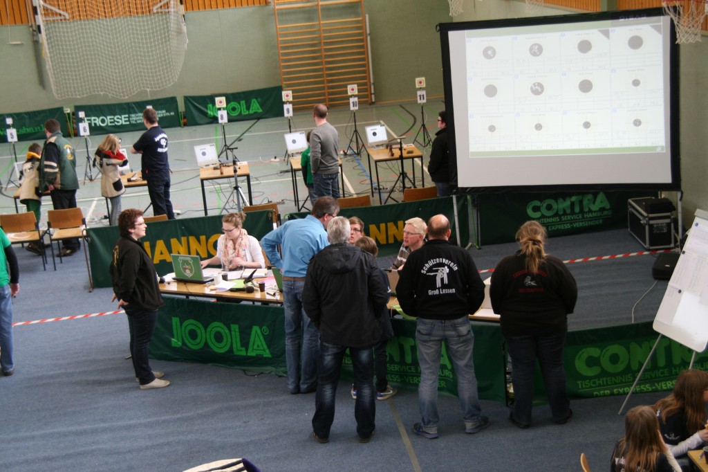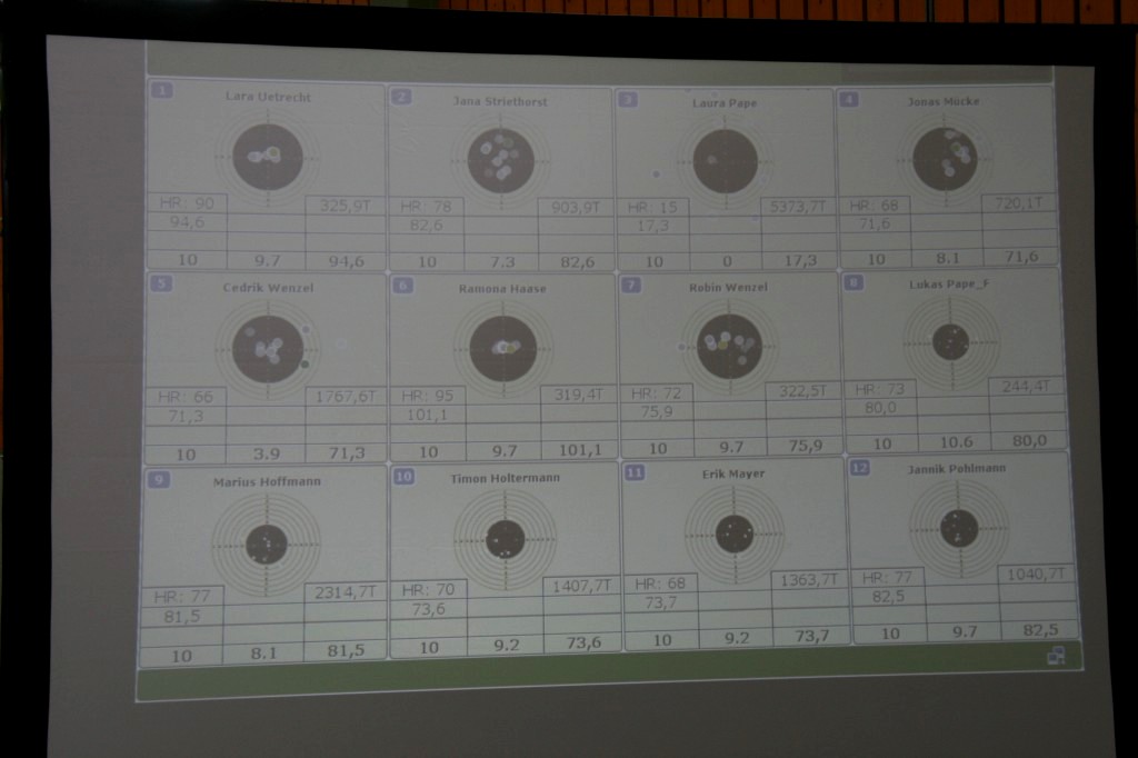 Die Turnhalle war der ideale Austragungsort für die diesjährige Bezirksmeisterschaft Lichtpunkt. Nicht nur aus dem Vorstand des KV IV kamen die Helfer, auch aus dem Schützenverein Groß Lessen war alles auf den "Beinen". An den PCs hatte Gerd Harzmeier super Hilfe von Alicia Schur, Nico Harzmeier und Cord Borchers-Rohde. Die Ergebnisse wurden nicht nur auf einer Leinwand übermittelt, sondern wurden nach jedem Durchgang ausgedruckt und an eine "Pinnwand" geheftet, diese war fast immer "umlagert". Da hörte man so manches mal:" Mensch sieh mal, ich bin immer noch "Erster" oder aber, ooch nun bin ich nur noch "Zweiter"!