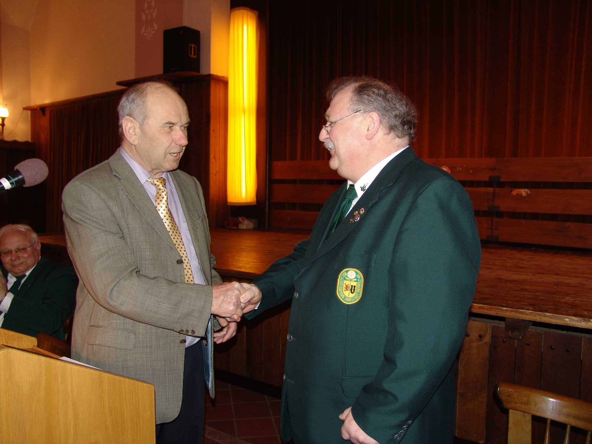 Für den Bezirkspräsidenten Karl-Friedrich Scharrelmann hatte Link eine Überraschung im Gepäck. „Scharrelmann, so Walter Link, ist im der SSV Dümmer seit 1984 Mitglied, war von 1986 bis 1990 Referent für Pistolenschießen und ist seit 1993 bis heute SSV-Vorsitzender. Seit 2004 übt er Amt des Bezirkspräsidenten aus und hat als Trainer in der Pistolendisziplin viele SSV-Mitglieder bis zur Deutschen Meisterschaft geführt. Wer so viele Verdienste im Schützenwesen, besonders bei den Sportschützen hat, der hat sich so verdient gemacht, dass ich ihm heute die Goldene Verdienstnadel des KSB übereichen kann“. Die Versammlung gratulierte ihrem Präsidenten mit viel Applaus.