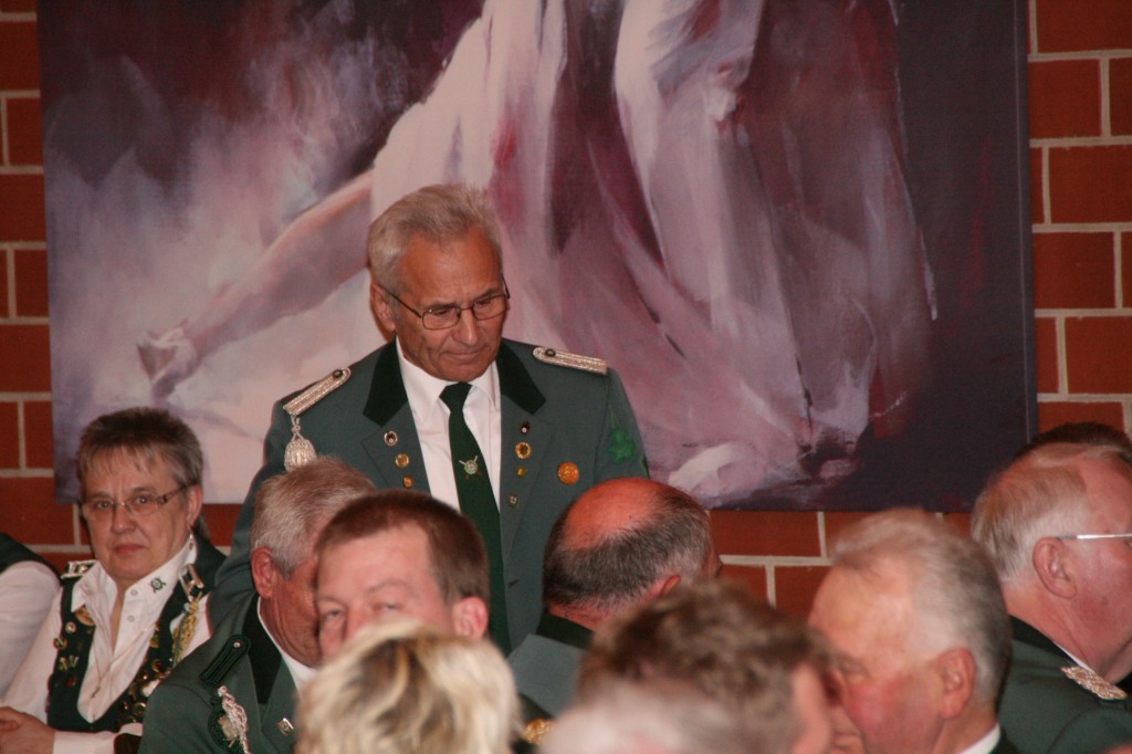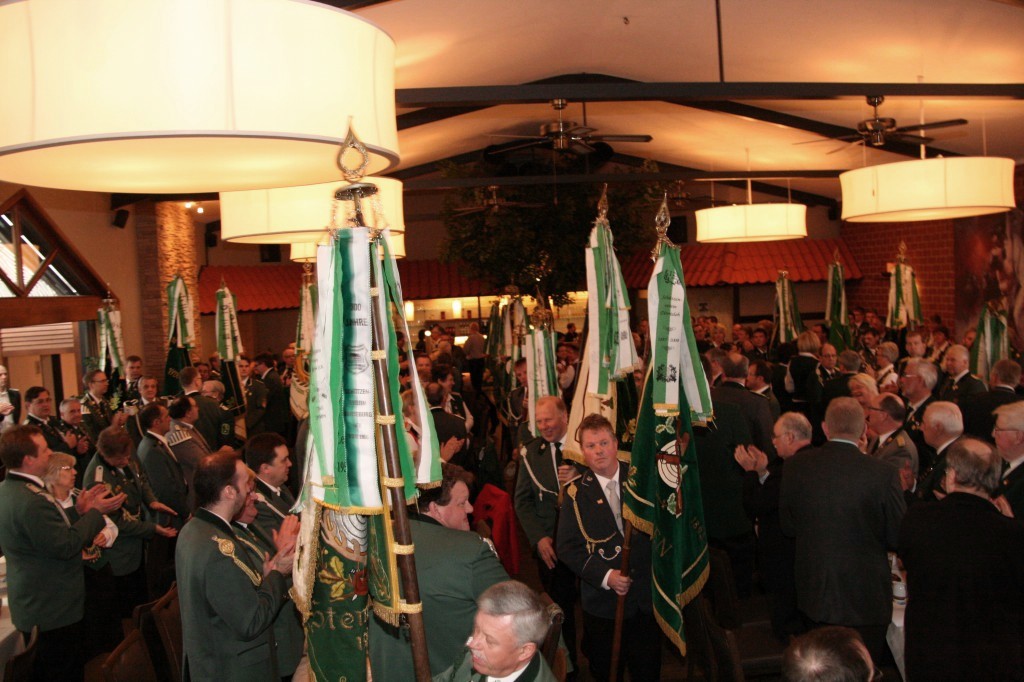 Der Fahneneinmarsch war wie immer recht eindrucksvoll, Präsident Dieter Lüdeke vom Kreisverband III zeigte den Fahnenträgern ihre Marschroute durch den Saal. Danach folgte die Totenehrung, alle hatten sich dafür von den Stühlen erhoben.