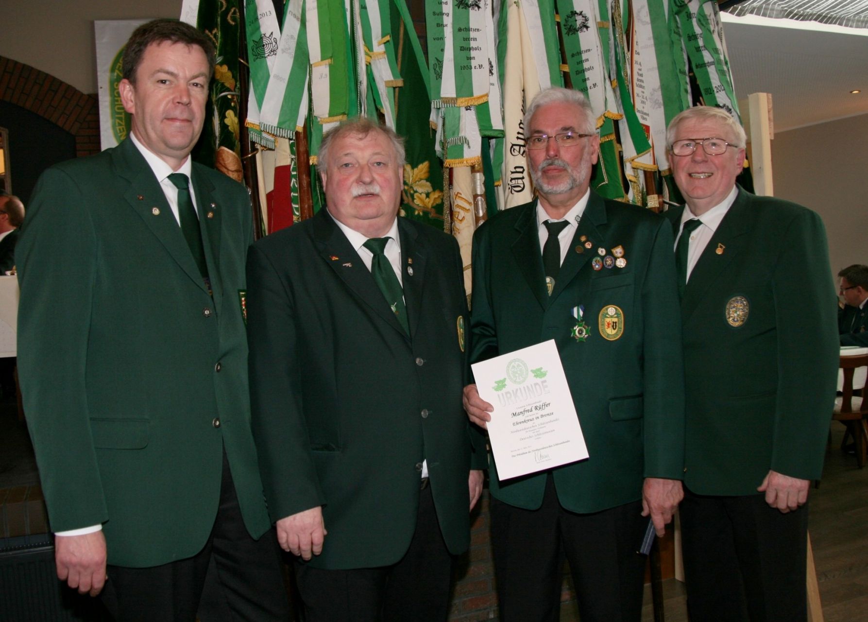 Das Ehrenkreuz des NWDSB für Manfred Rüffer vom SV Hagewede-Marl, überreichte auch Heinz Rösseler, Peter Wiechmann und Karl-Friedrich Scharrelmann gratulierten herzlich.