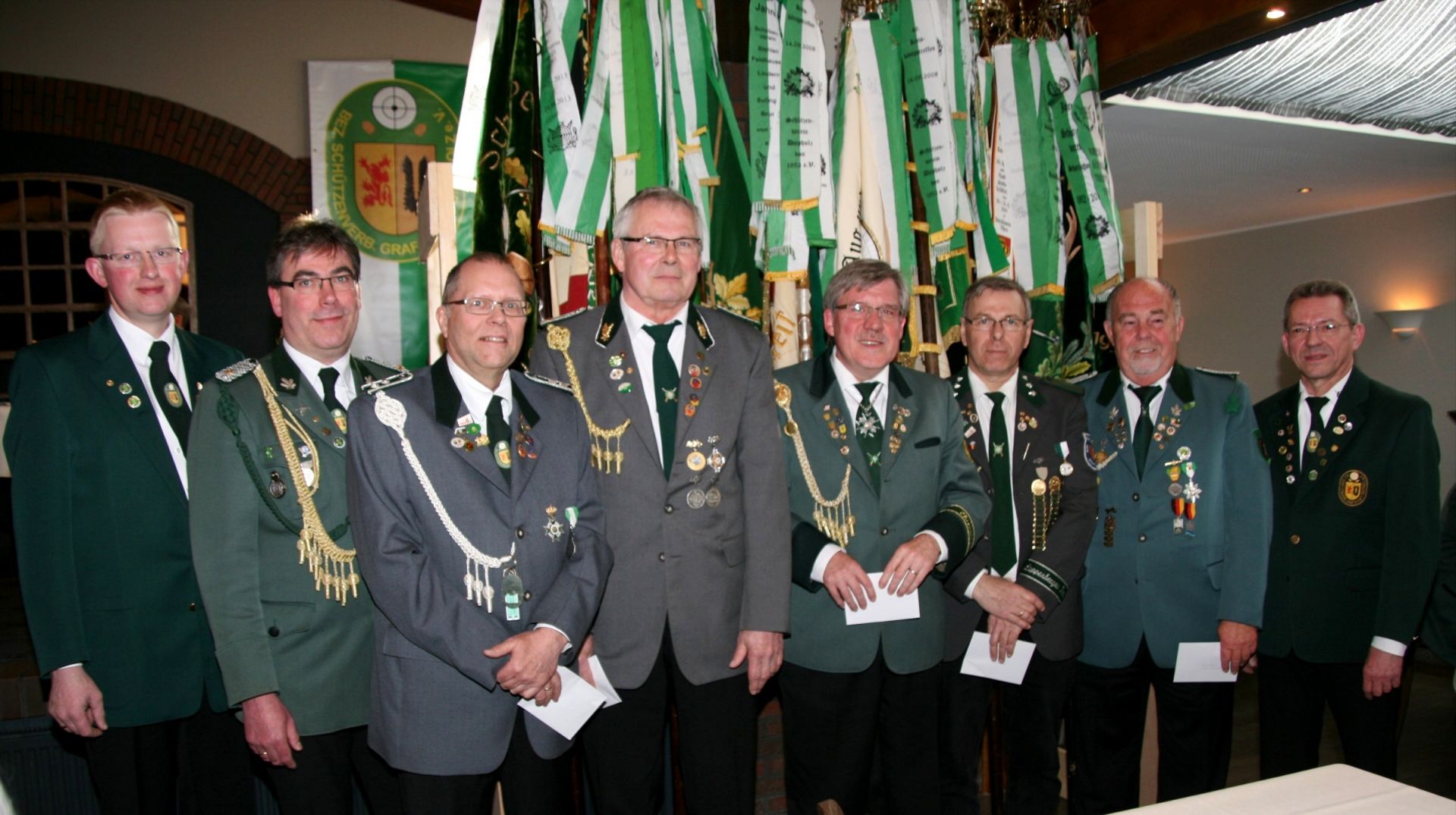 Präsident Karl-Friedrich Scharrelmann, Günter Herzig und Hein Lüesse übergaben die Nadeln: Erst die Goldene Ehrennadel Bezirk, Silberne Verdienstnadel des Bezirks und die Goldene Verdienstnadel des Bezirks. Die Ehrennadel des NWDSB wurde vom Vizepräsidenten Heinz Rösseler übergeben.