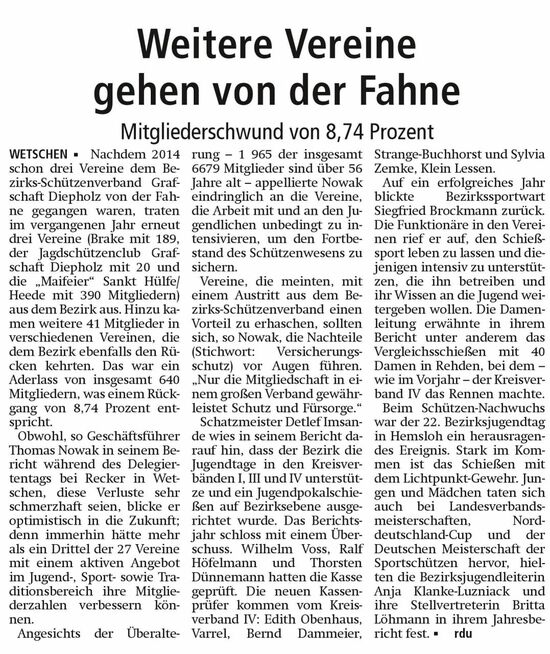 Thorsten Dünnemann bestätigte stellvertretend für die nicht anwesenden Kassenprüfer den positiven Kassenbestand von Schatzmeister Detlef Imsande. Wilhelm Voß und Ralf Höfelmann hatten die Kasse auf "Herz und Niere" geprüft. Als neue Kassenprüfer für das Jahr 2017 wurden Edith Obenhaus, Varrel, Bernd Dammeier, Strange-Buchhorst und Sylvia Zemke aus Klein Lessen gewählt. KV IV-Präsident Gerd Griffel hatte sie vorgeschlagen. Der nächste Delegiertentag findet am 18. März 2017 im KV IV in der Gaststätte Hartje in Varrel statt.