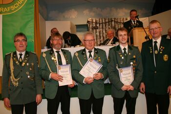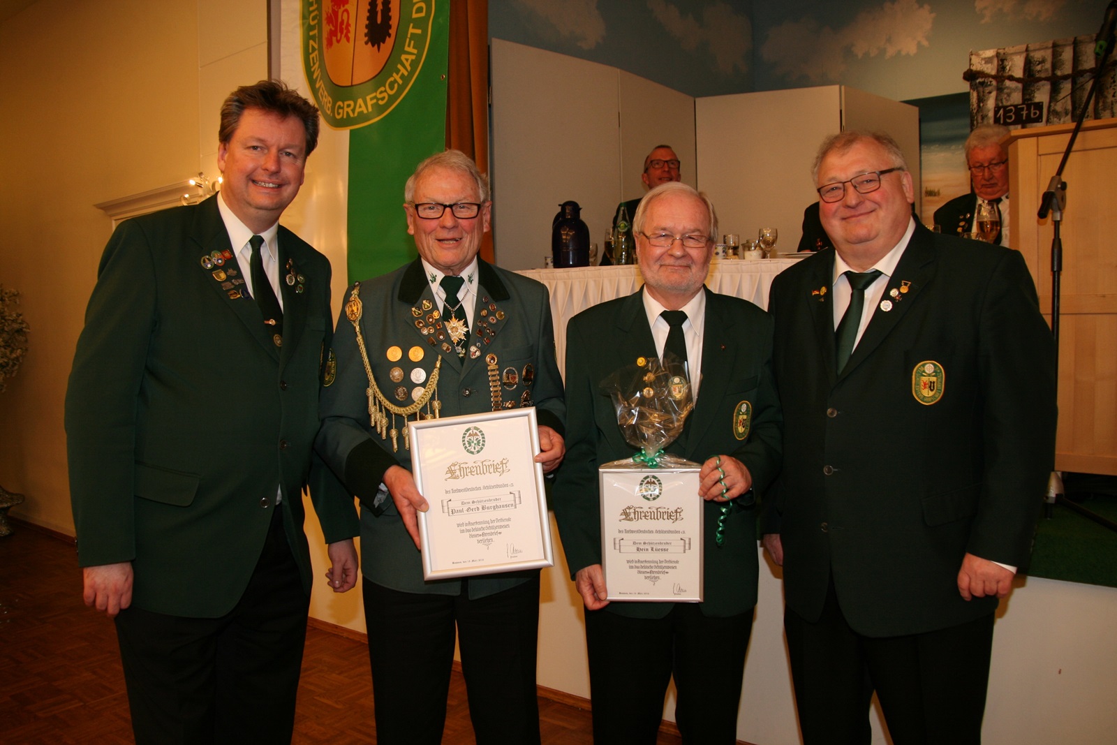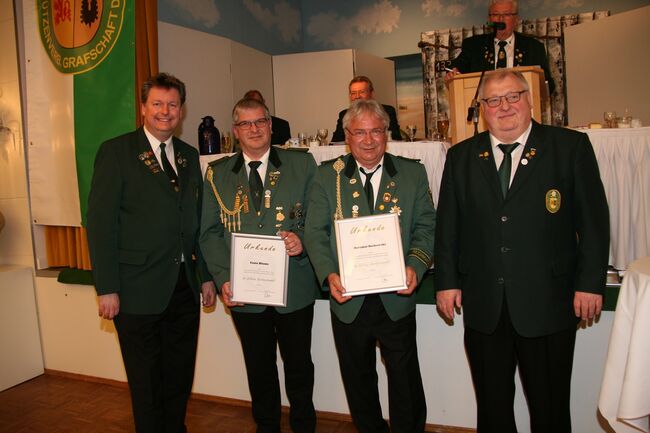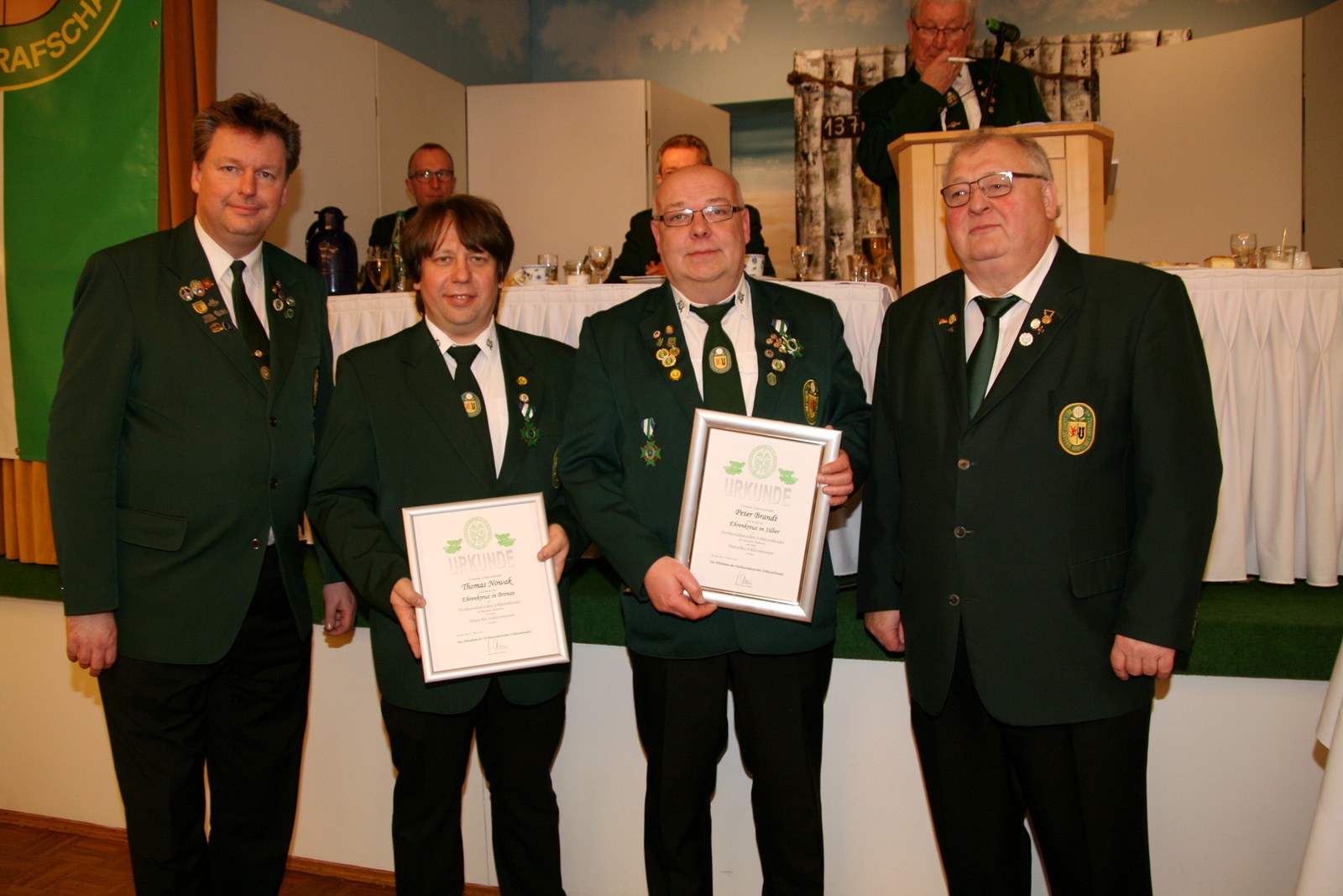 Eingerahmt vom NWDSB-Vizepräsidenten Frank Pringel u. BZ-Präsident Karl-Friedrich Scharrelmann stehen Thomas Nowak u. Peter Brandt mit ihren Urkunden. Das Ehrenkreuz in Bronze des NWDSB erhielt Thomas Nowak vom SV Rehden und das Ehrenkreuz in Silber des NWDSB bekam Peter Brandt vom SV Wohlsteck.