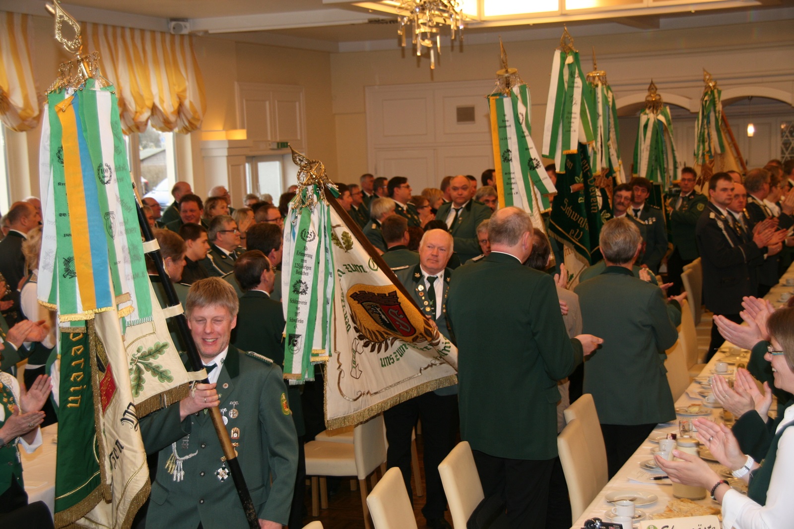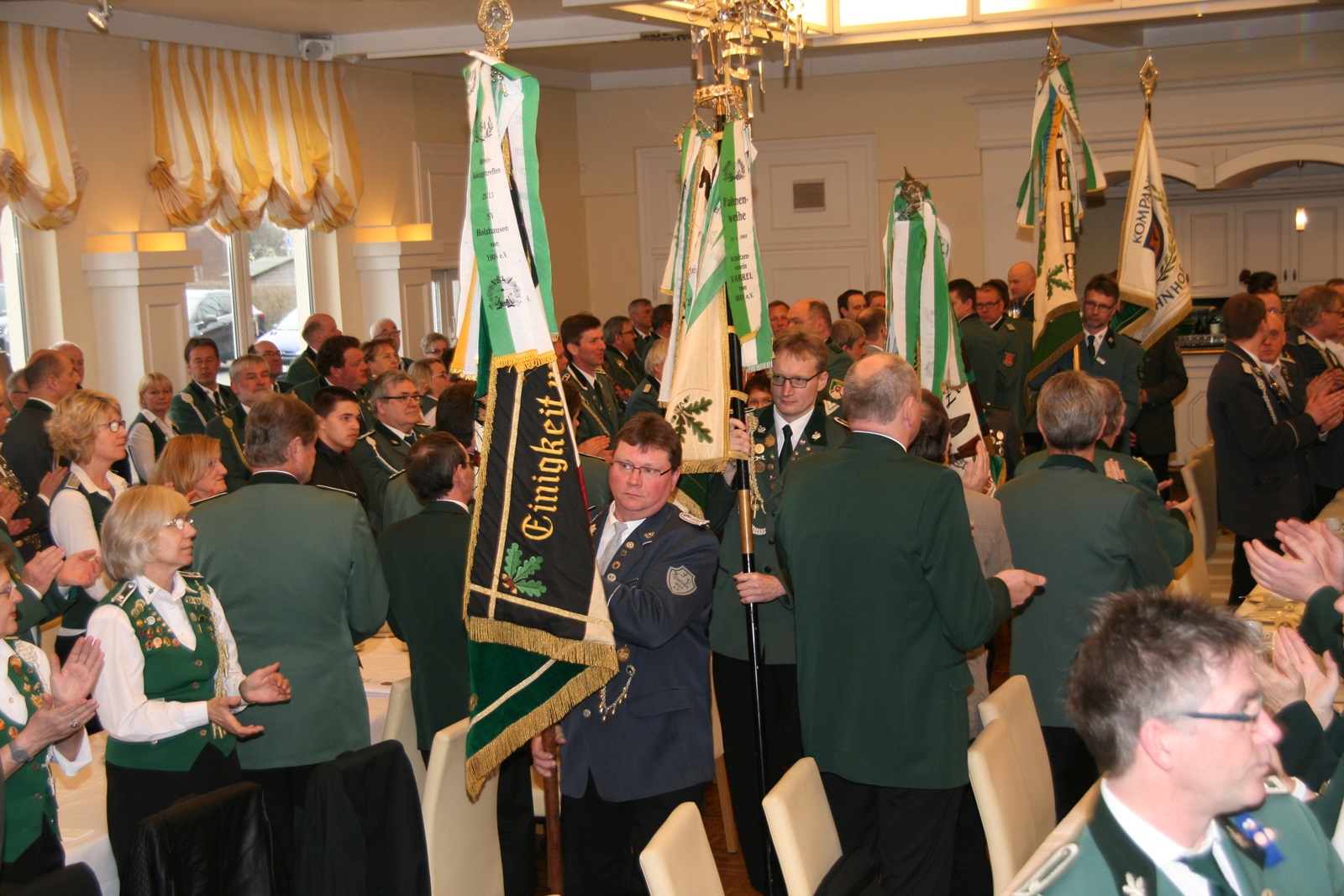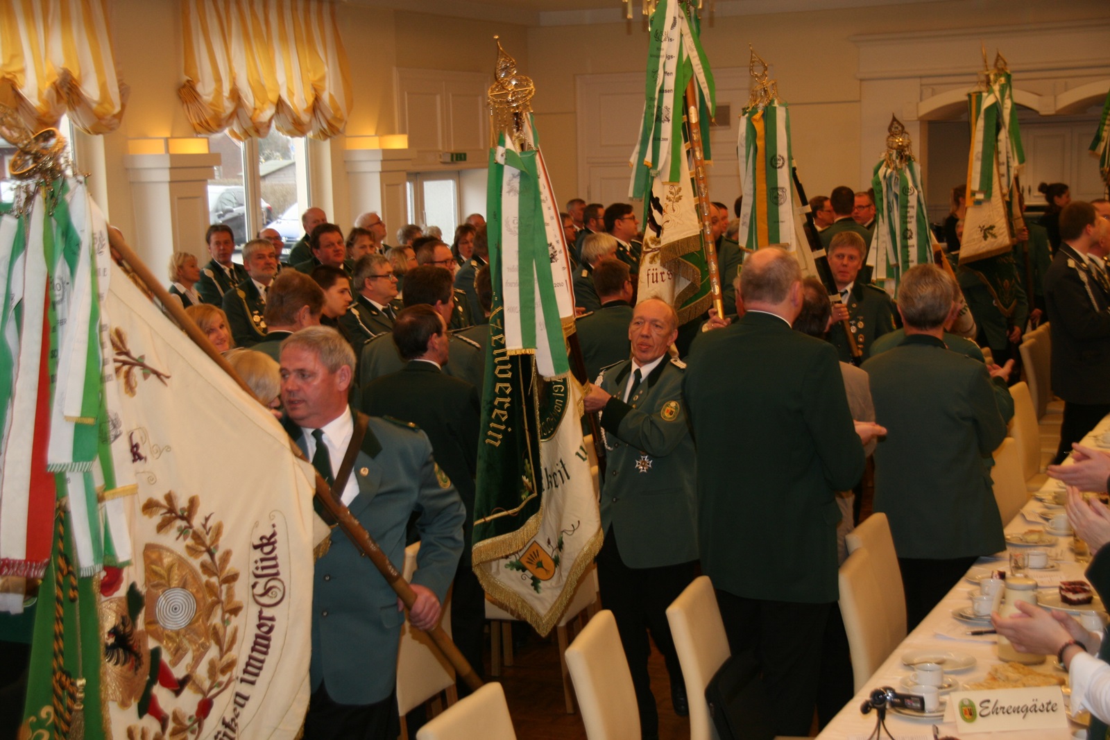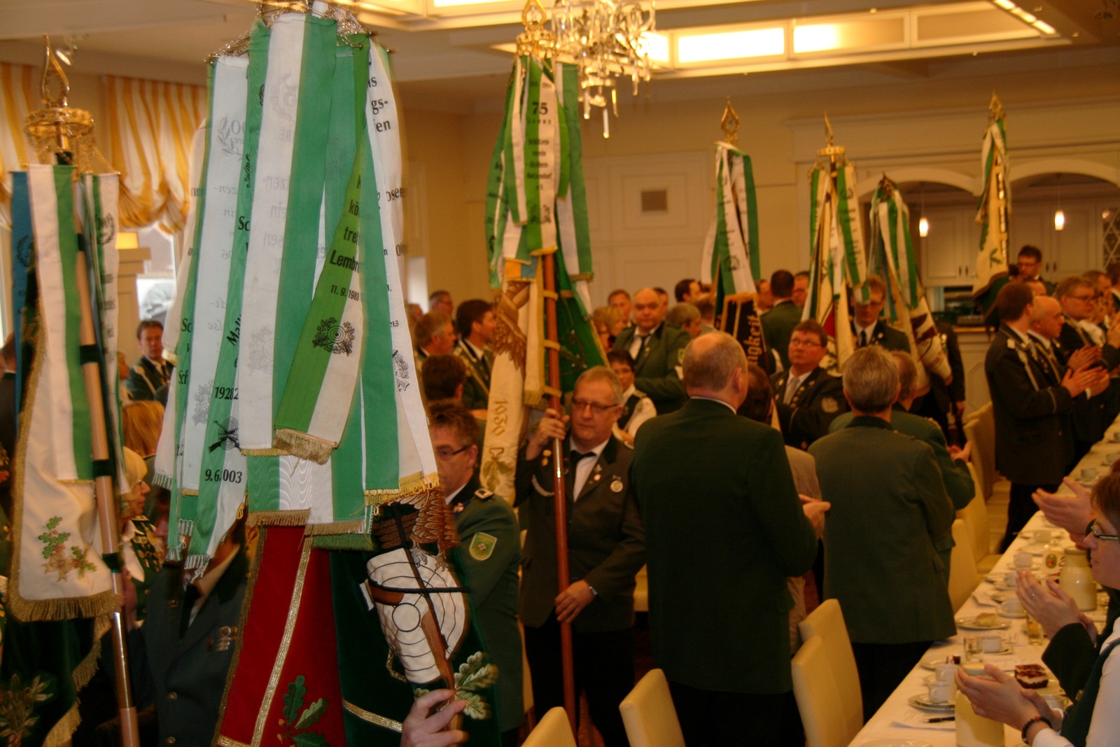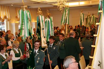 Zum Fahneneinmarsch standen alle auf und geleiteten die Fahnenträger der Mitgliedsvereine des Bezirks mit rythmischen Klatschen in den Saal, anschließend erfolgte die Ehrung der im letzten Jahr Verstorbenen mit gesenkten Fahnen.