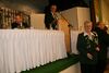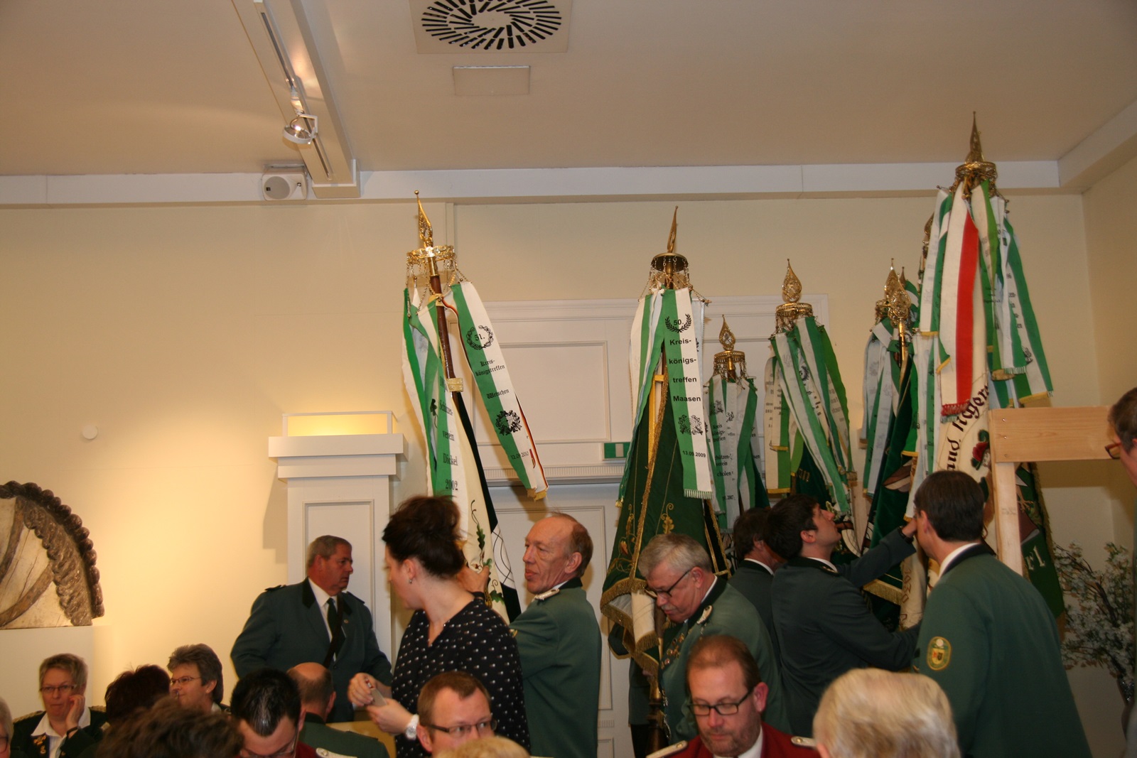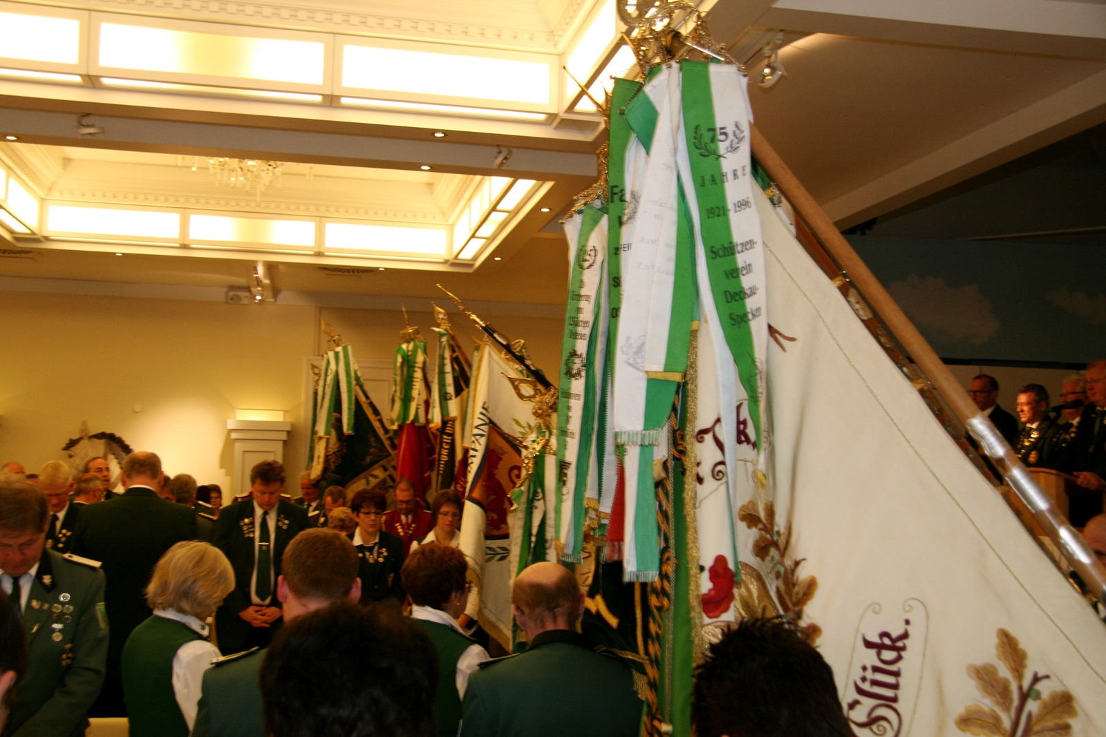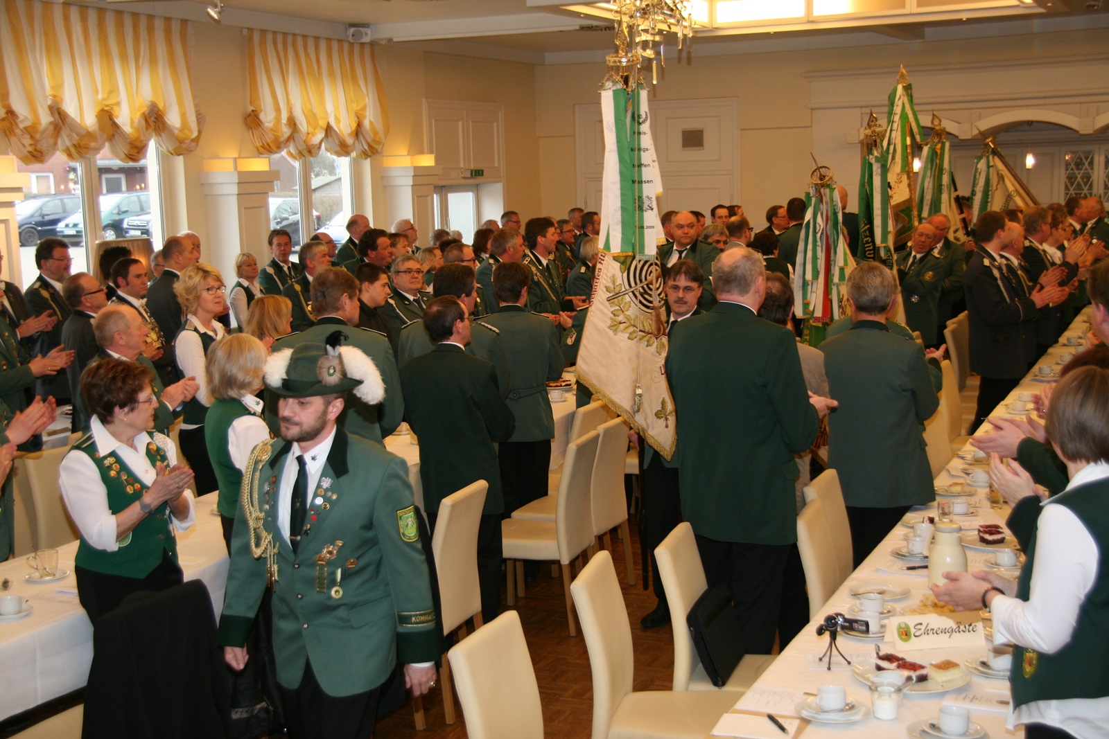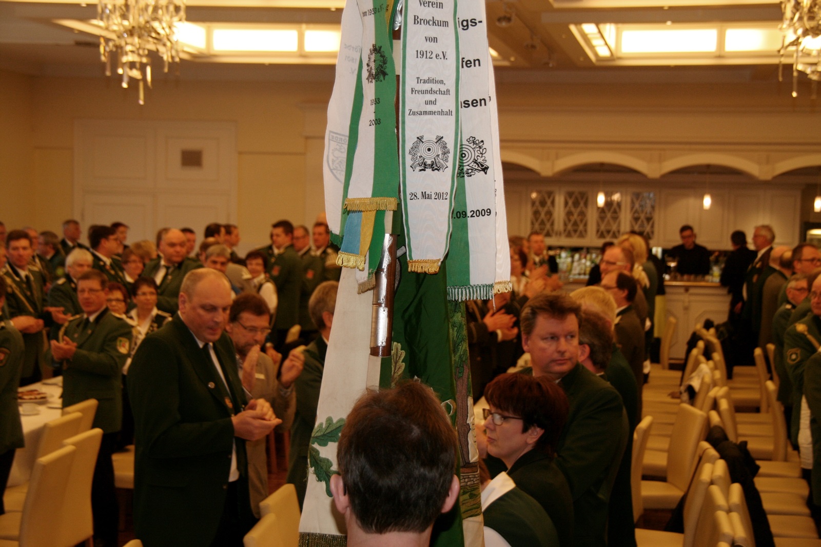 Zum Fahneneinmarsch standen alle auf und geleiteten die Fahnenträger der Mitgliedsvereine des Bezirks mit rythmischen Klatschen in den Saal, anschließend erfolgte die Ehrung der im letzten Jahr Verstorbenen mit gesenkten Fahnen.