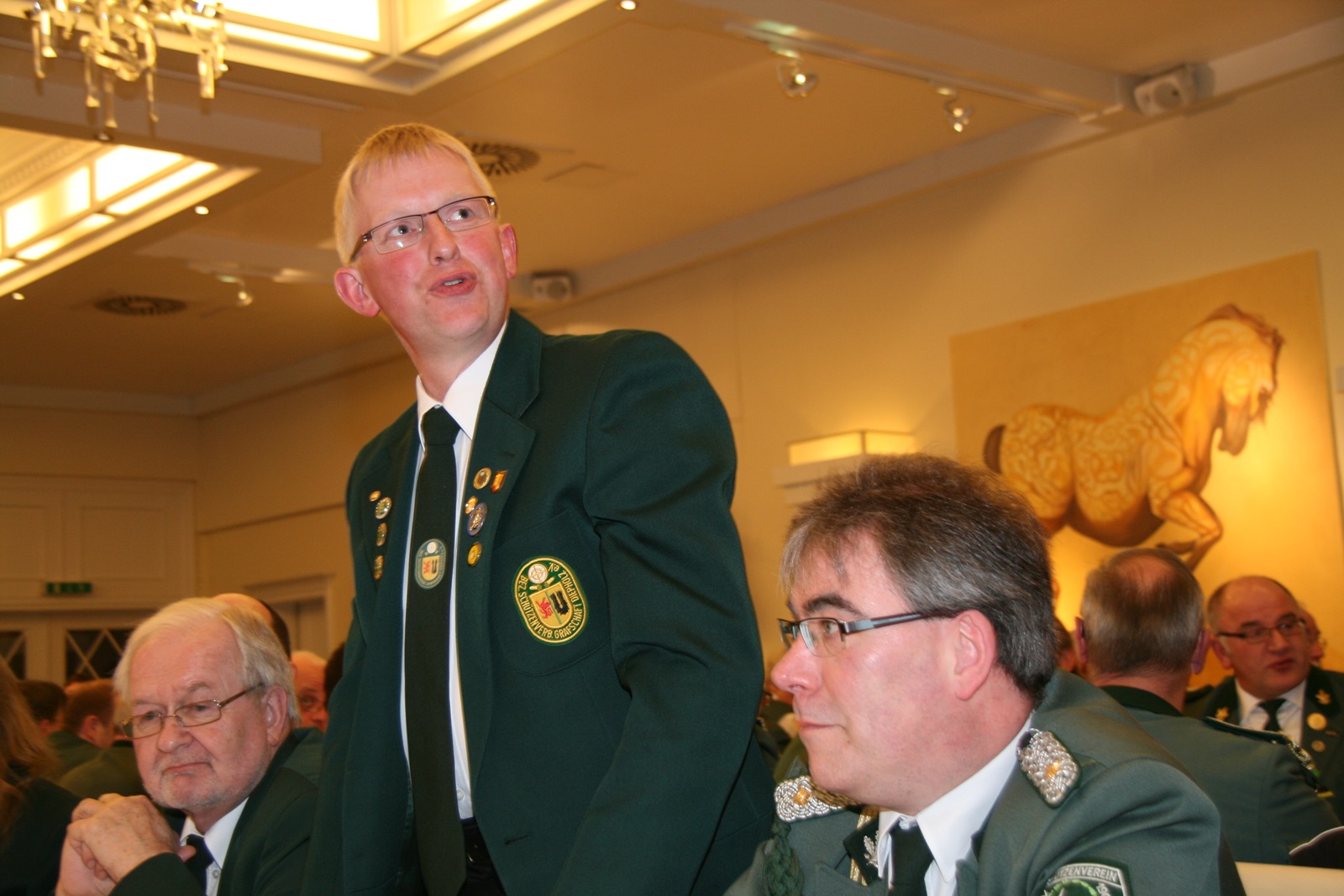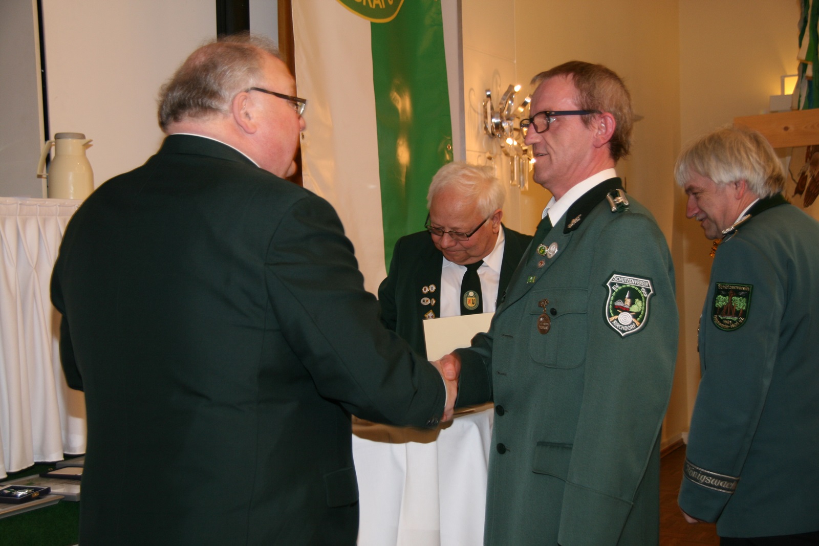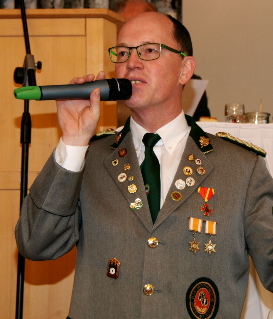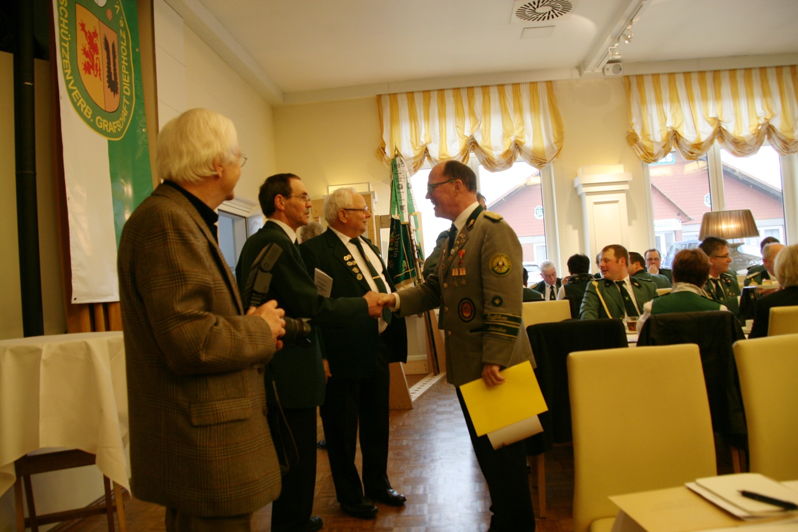 Stefan von Aschwege, überbrachte die besten Grüße nicht nur als Vizepräsident vom Oldenburger Schützenbund, sondern auch die Grüße aller Nachbarbezirke. Solche Delegiertentage nehme man gern zum Anlaß die nachbarschaftliche Unterstützung zu bekunden, denn gemeinsam sind wir stark. Bei der Regionalkonferenz Ende Mai im LLZ Bassum sollen unter anderen Themen, auch die Schießstandabnahmen besprochen werden. Zum Teil beurteilen Behörden Schießstände immer noch unterschiedlich, obwohl es ja Verordnungen gibt. Mitgliederwerbung wird auch ein Thema bei der Konferenz sein. Es ist gut, dass wir die Traditionsschützen haben, ohne sie gäbe es auch kein Weltkulturerbe. Weiter führte er aus, dass es wichtig ist, gemeinsame Ziele zu erklären und weiterzuverfolgen. Freuen wir uns auf eine gute Zusammenarbeit, er wünschte eine gute Versammlung mit weisen Beschlüssen.
