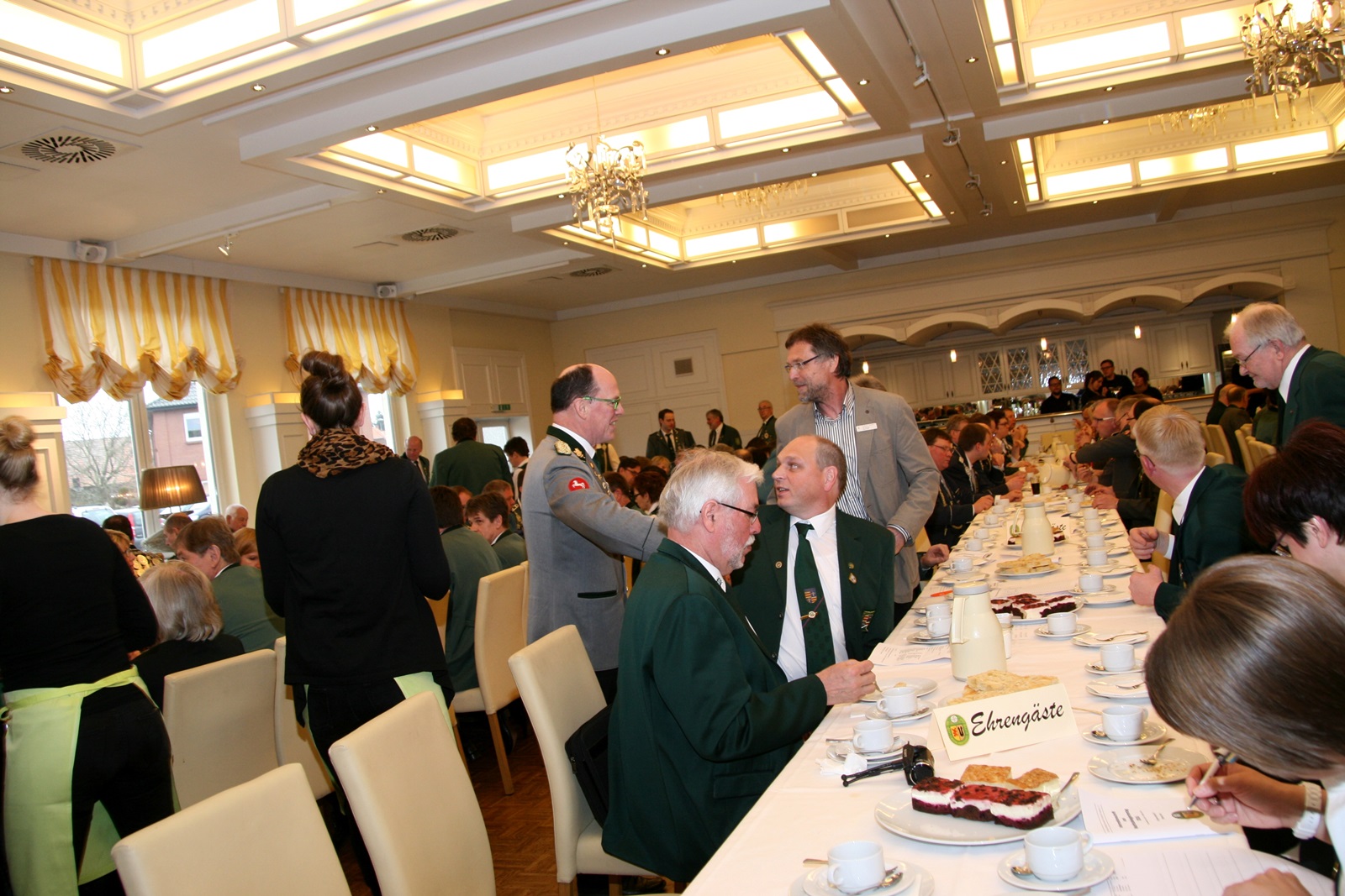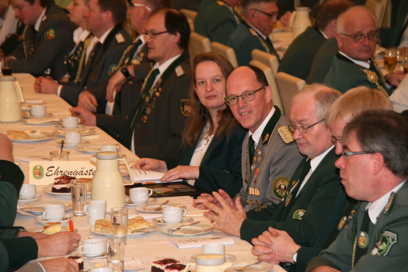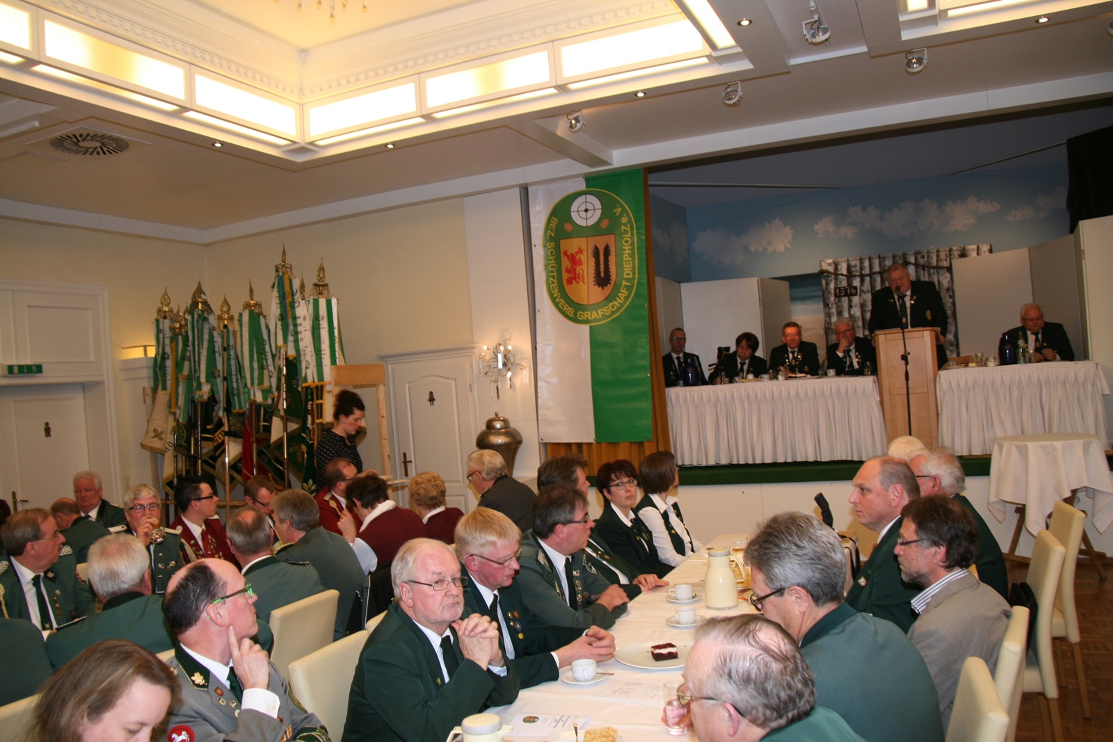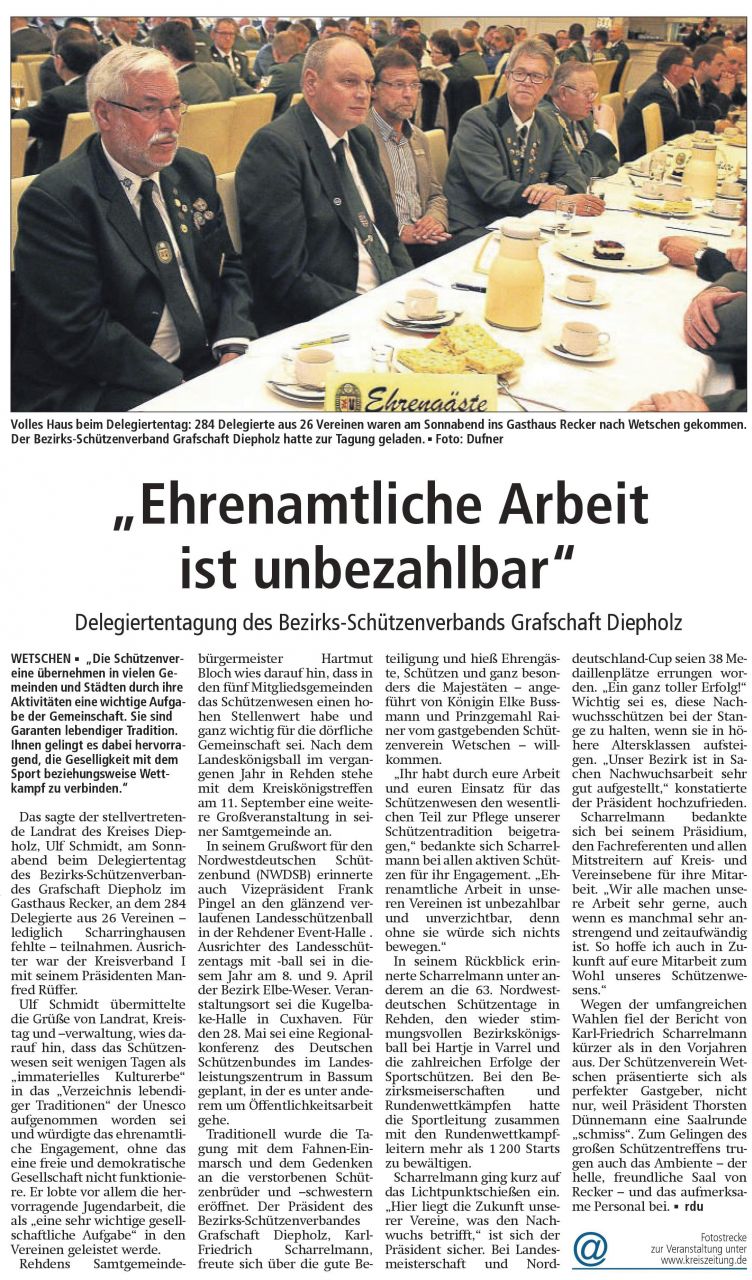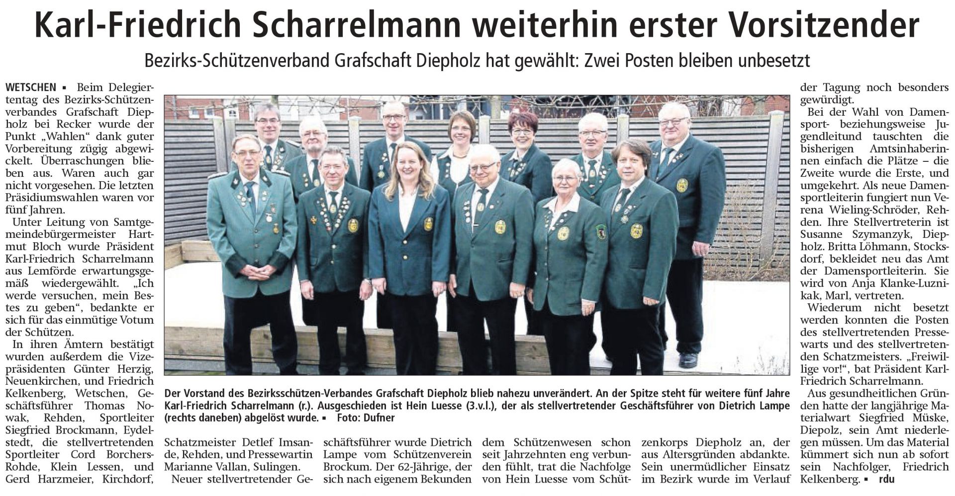 In seiner Begrüßung hieß Bezirkspräsident Karl-Friedrich Scharrelmann alle herzlich willkommen, sein besonderer Gruß galt allen Majestäten und Ehrengästen aus Nah und Fern. Zu den Ehrengästen gehörten der Stellvertretende Landrat des Landkreises Diepholz Ulf Schmidt, Bürgermeister der Samtgemeinde Rehden Hartmut Bloch, Karl-Friedrich Dünnemann Bürgermeister der Gemeinde Wetschen, NWDSB-Vizepräsident Frank Pringel, Stefan von Aschwege, Vizepräsident vom Oldenburger Schützenbund, Uwe Drecktrah als Vertreter des Bezirks Hoya, des Fachverbandes Schießsport und des Kreissportbundes Diepholz sowie von der Presse Reinhold Dufner Kreiszeitung und Bezirkspressewartin Marianne Vallan. Dank sagte er dem KV I mit seinem Präsidenten Manfred Rüffer an der Spitze für die Ausrichtung und Organisation dieses Delegiertentages.