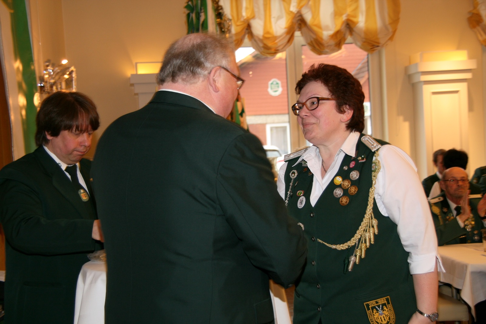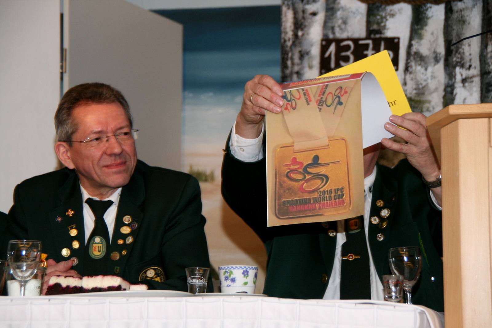 Uwe Drecktrah wurde von unserem Präsidenten mit einem Glückwunsch zu seinem am Vortag gefeierten Geburtstag begrüßt. Dieser bedankte sich auch für die Einladung, er ist gern in das quasi sportliche Epizentrum des Bezirks-Schützenverbandes Grafschaft Diepholz nach Wetschen gekommen. Er entschuldigte den KSB-Präsident Peter Schnabel, denn der feiere an diesem Tag seinen 65. Geburtstag, Axel Knöerig habe sich kurzfristig wegen einer grippalen Erkrankung abgemeldet. So überbringe er auch die Grüße des KSB und „seines“ BZ-Hoya. Als Vorsitzender des Fachverbandes Schießsport, berichtete er stolz von den tollen Erfolgen der Sportschützin Elke Seeliger, welche im fernen Bangkok beim IPC Shooting World Cup, eine Goldmedaille mit dem Sportgewehr und eine Silbermedaille mit dem Luftgewehr errungen habe. Sie habe sich vom jeweils 5. und 6. Platz in der Qualifikation, mit viel Nervenstärke im Finale nach vorn „gearbeitet“. Dabei erinnerte er an Walter Link der warb ja mit dem Ausspruch (der sich auch heute immer wieder bewahrheitet): “ Aus der Breite an die Spitze“! Elke Seeliger sei ein Musterbeispiel dafür. So hat sie sich auch den Quotenplatz für die Paralympics in Rio im September 2016 durch ihre super Leistungen erworben und wird wohl diejenige sein, die zu den Paralympics fährt. Seit ein paar Jahren sitzt sie krankheitsbedingt im Rollstuhl, ihr Mann trainiert und betreut sie, zu den Wettkämpfen rund um die Welt fahren sie auf eigene Kosten. Drecktrah sieht es positiv, die Schützen in unseren Bezirken sind eigentlich gut aufgestellt bei den Bezirksrundenwettkämpfen, Landes- und Bundesligen mit LG und LP, darin entwickeln sich die Schützinnen und Schützen, welche grosse Leistungen erbringen. Ich danke jedem Schützen in dieser Runde für ihr Arrangement, auch im Namen des KSB und wünsche dieser Versammlung einen guten Verlauf.
