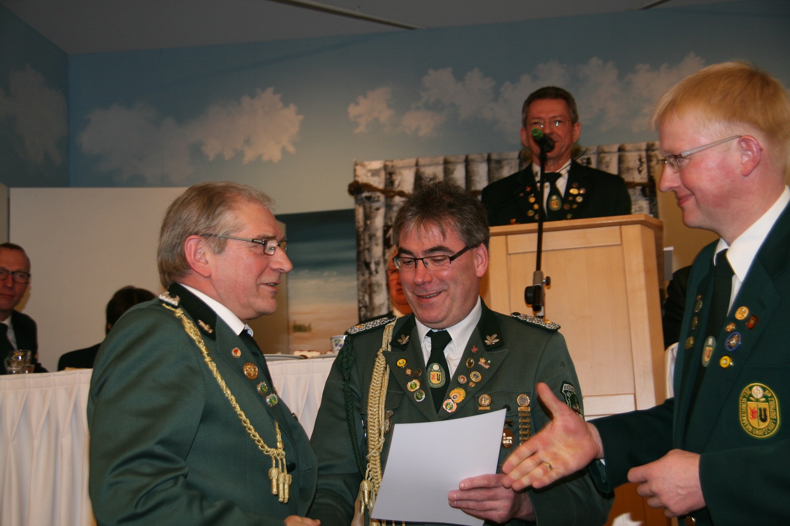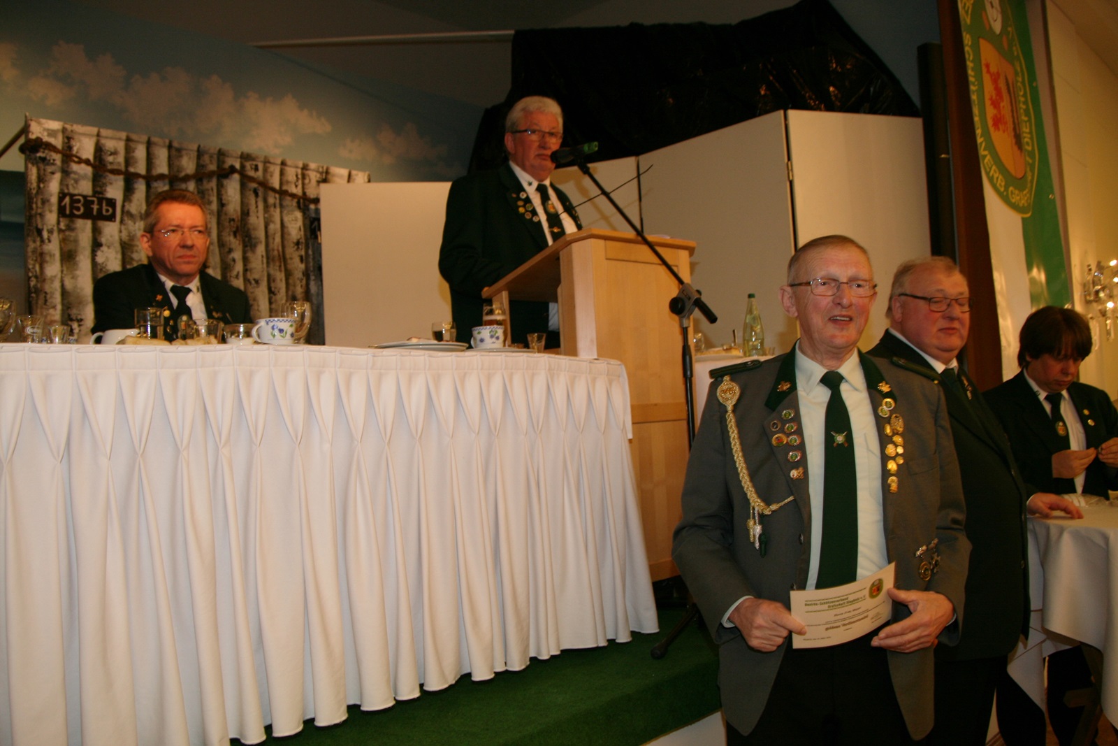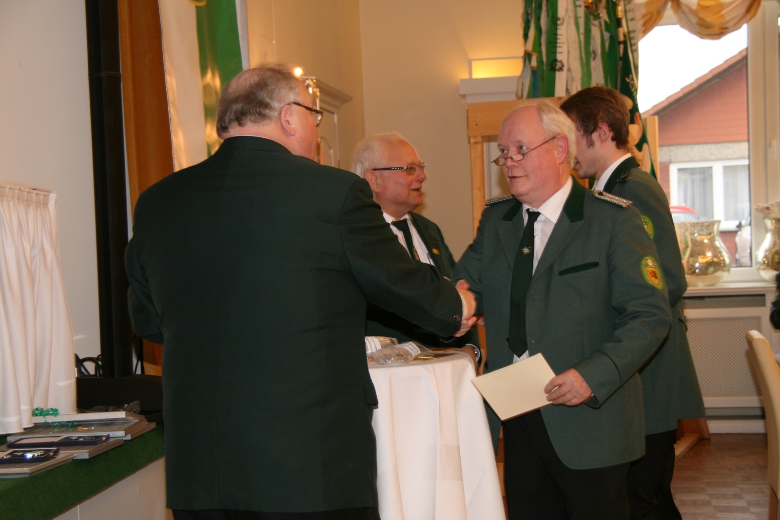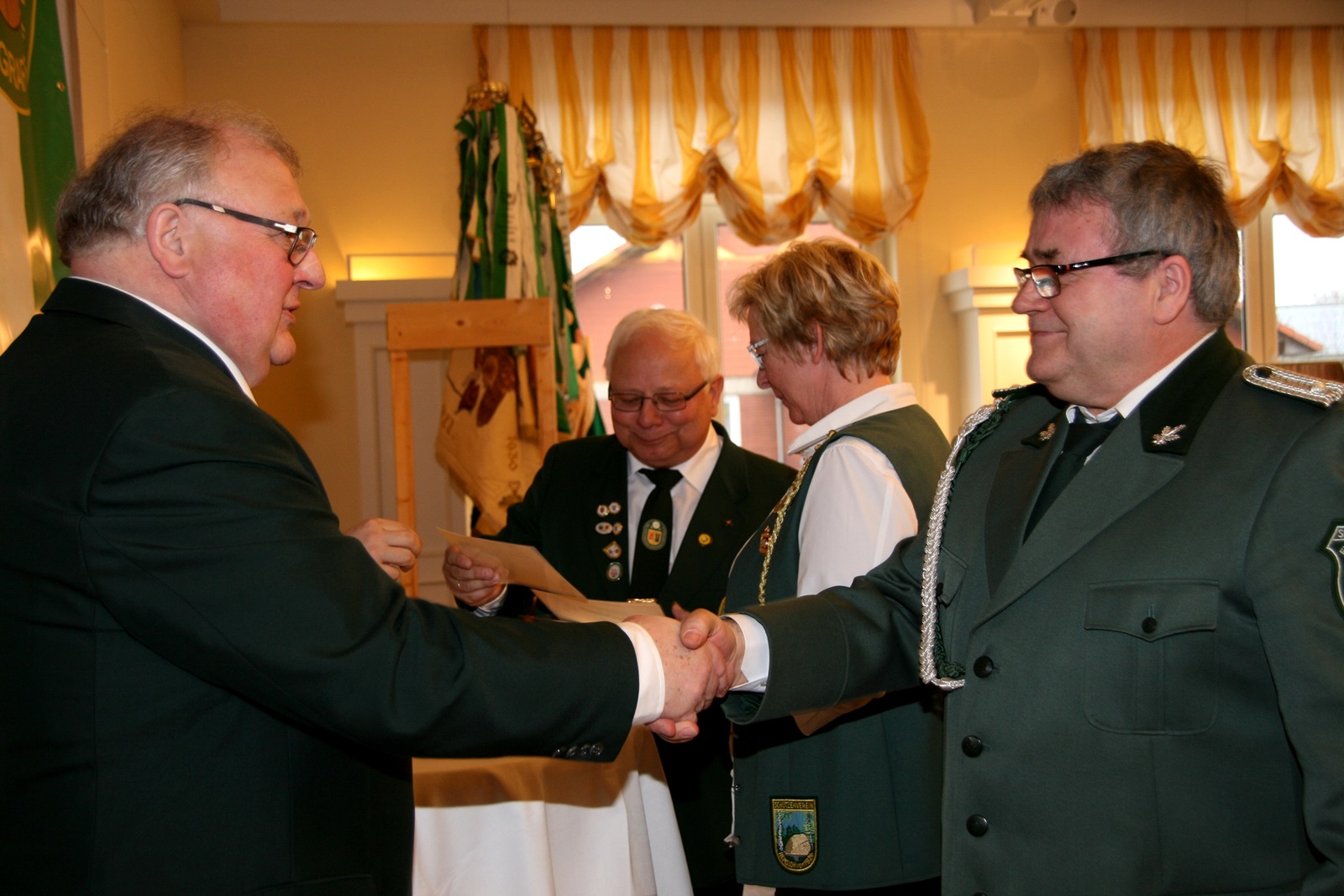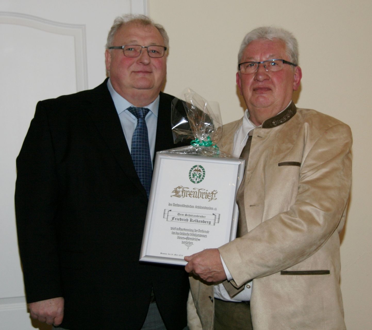 Eine Überraschung gab es für Friedel Kelkenberg auf der Feier anläßlich seines 70. Geburtstages: Präsident Karl-Friedrich Scharrelmann überreichte ihm den Ehrenbrief des Nordwestdeutschen Schützenbundes.
