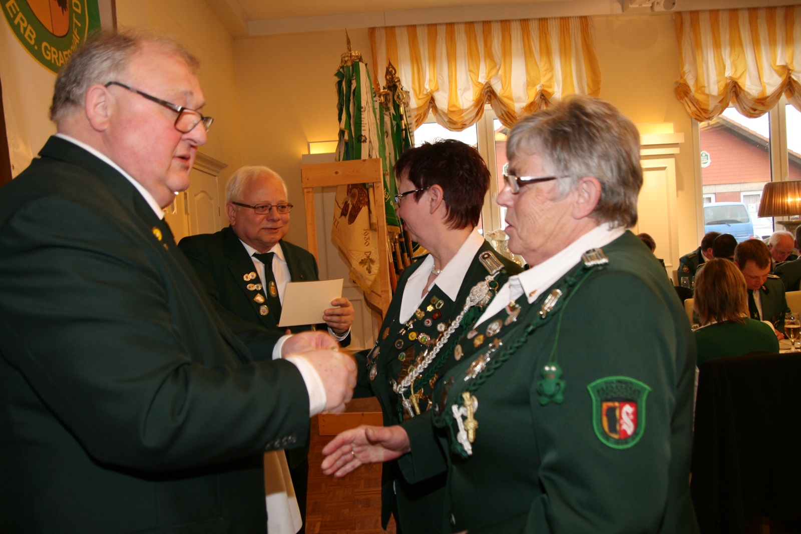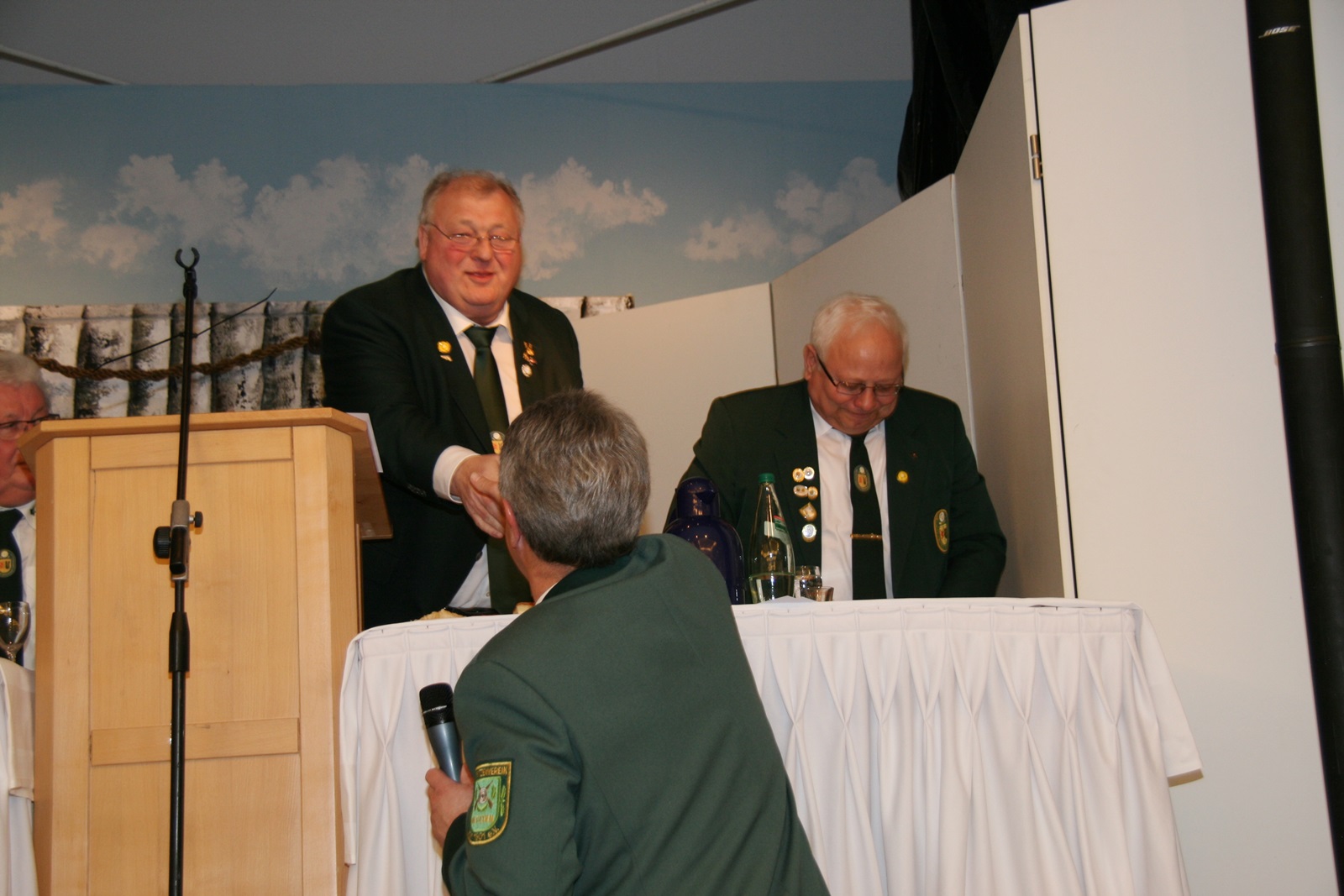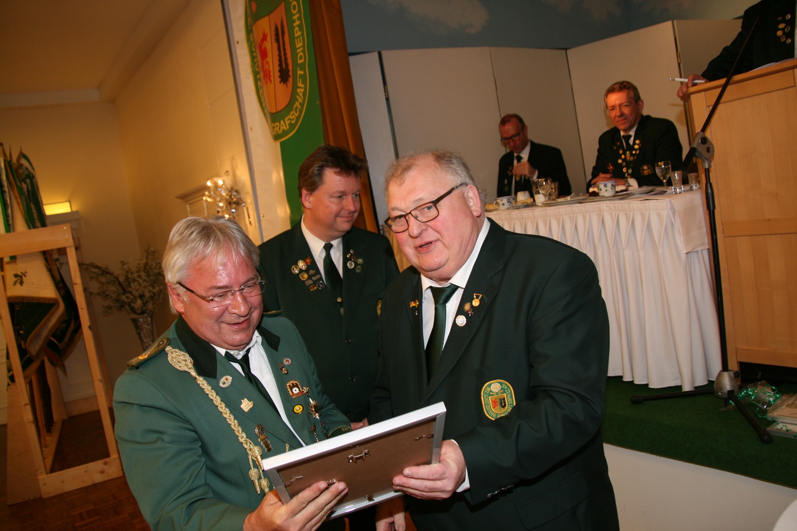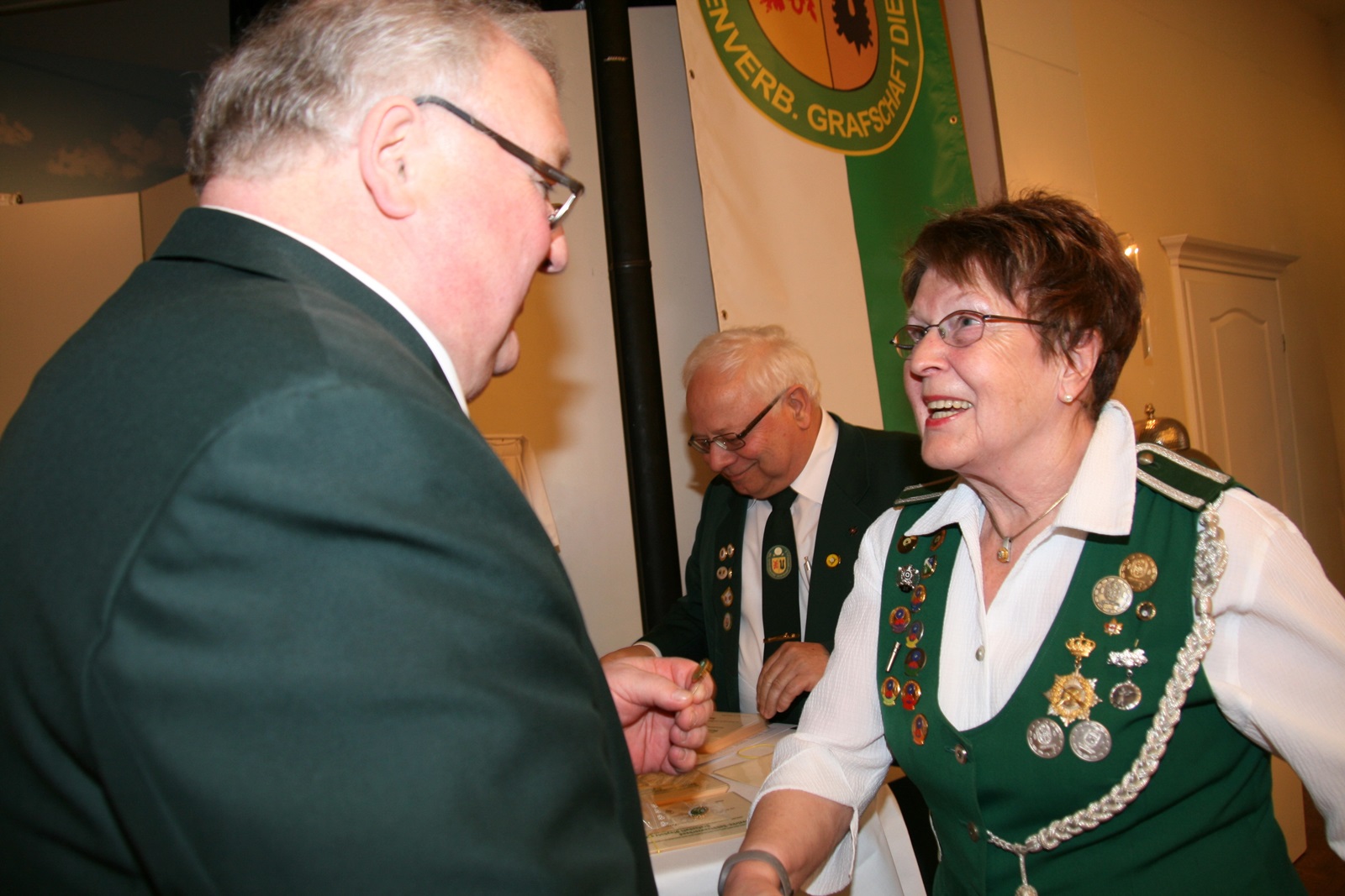 Eine Überraschung gab es für Friedel Kelkenberg auf der Feier anläßlich seines 70. Geburtstages: Präsident Karl-Friedrich Scharrelmann überreichte ihm den Ehrenbrief des Nordwestdeutschen Schützenbundes.