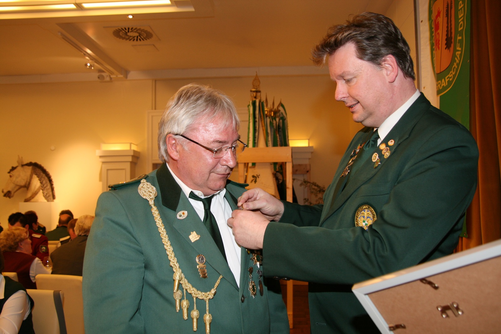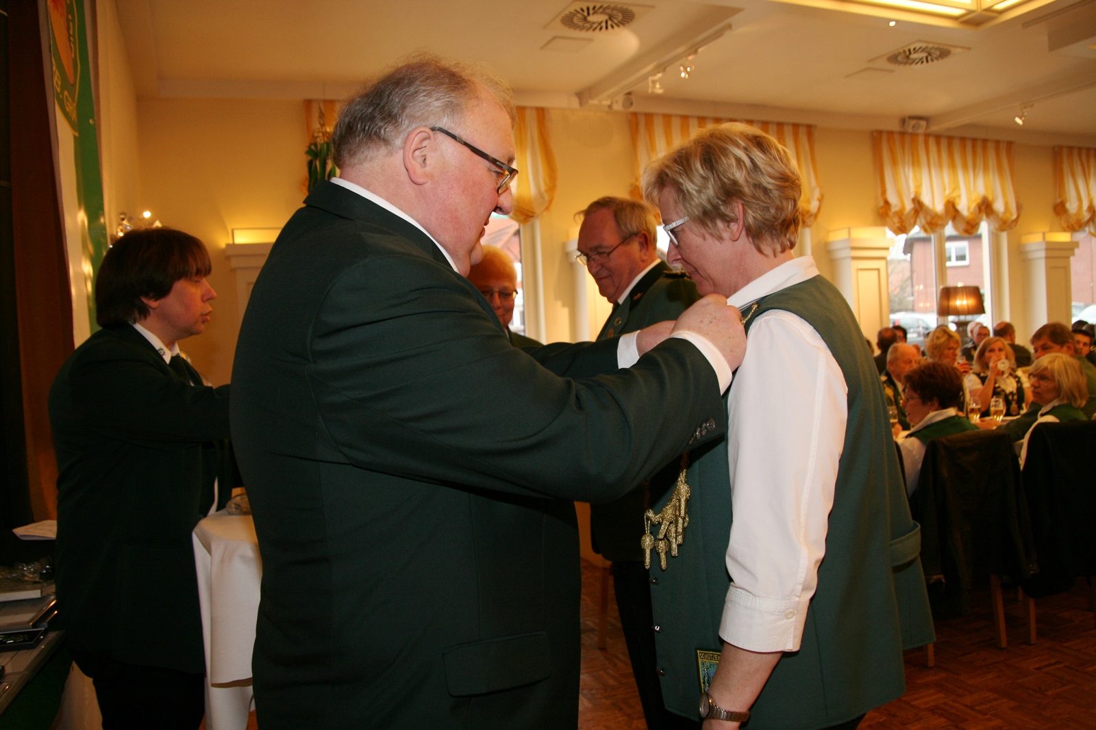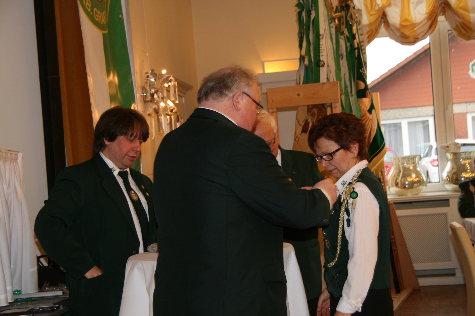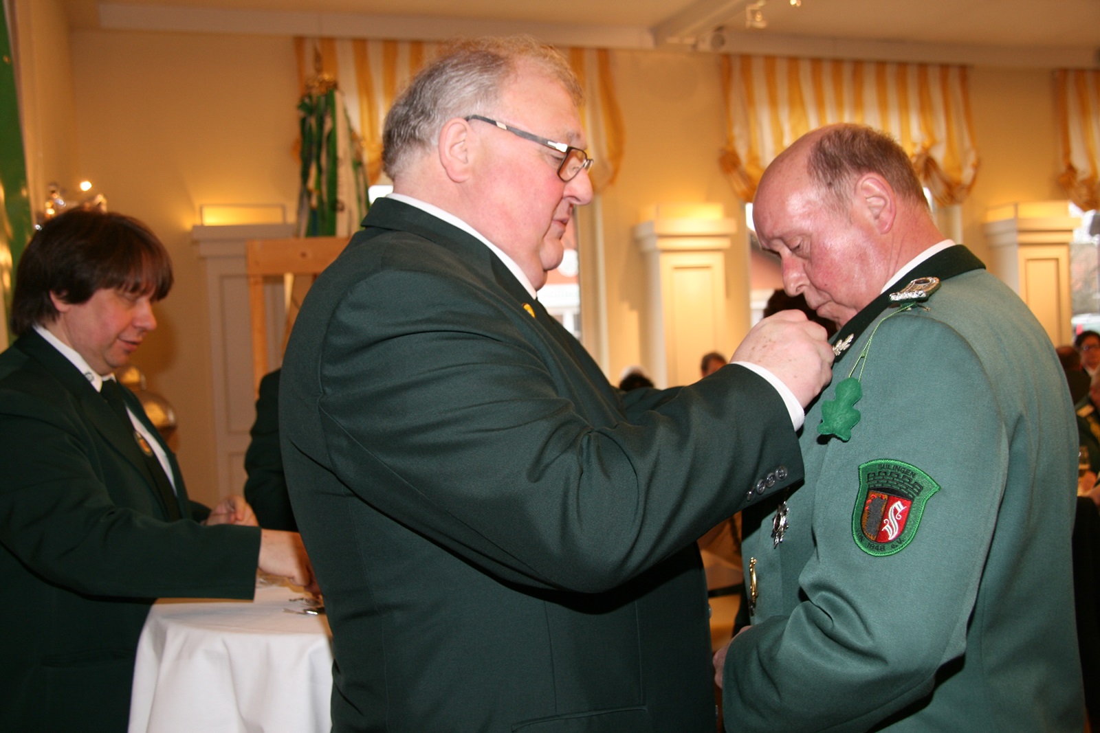 Die besonderen Ehrungen wurden von Friedel Kelkenberg verlesen, dazu gehörten die Goldene Ehrennadel sowie die Silberne und Goldene Verdienstnadel des Bezirks. Auch die Ehrennadel-, das Ehrenkreuz in Bronze und Silber des NWDSB. Der Ehrenbrief des NWDSB ist mit eines der höchsten Auszeichnungen vom Landesverband, darüber freuten sich an diesem Tag Paul-Gerd Burghausen und Hein Lüesse. (Auf der Generalversammlung des SV Klein Lessen, wurde zuvor Wilhelm Borchers-Rohde und auf seiner Feier zum 70. Geburtstag war sie Friedel Kelkenberg verliehen worden.)