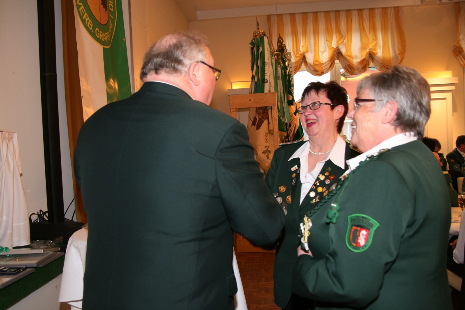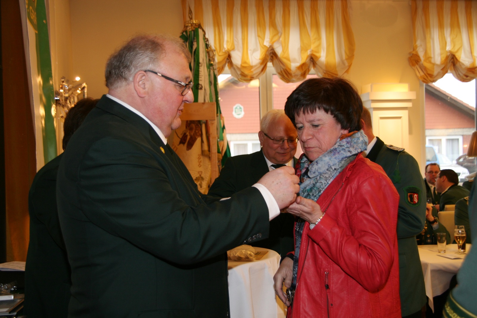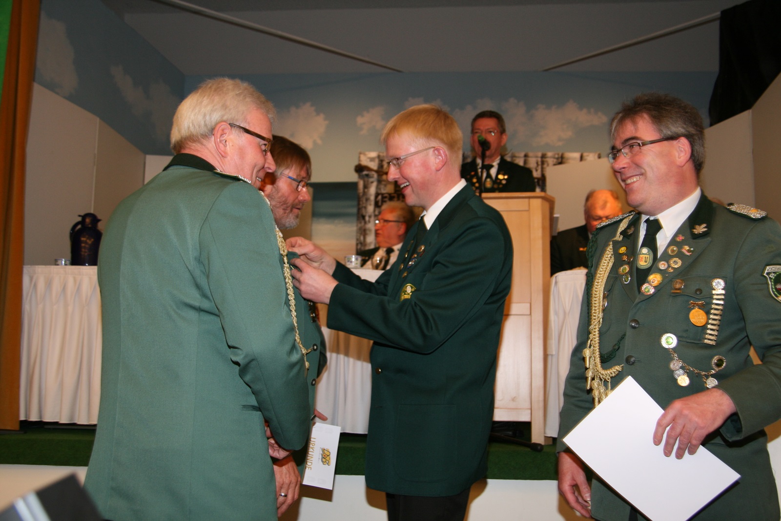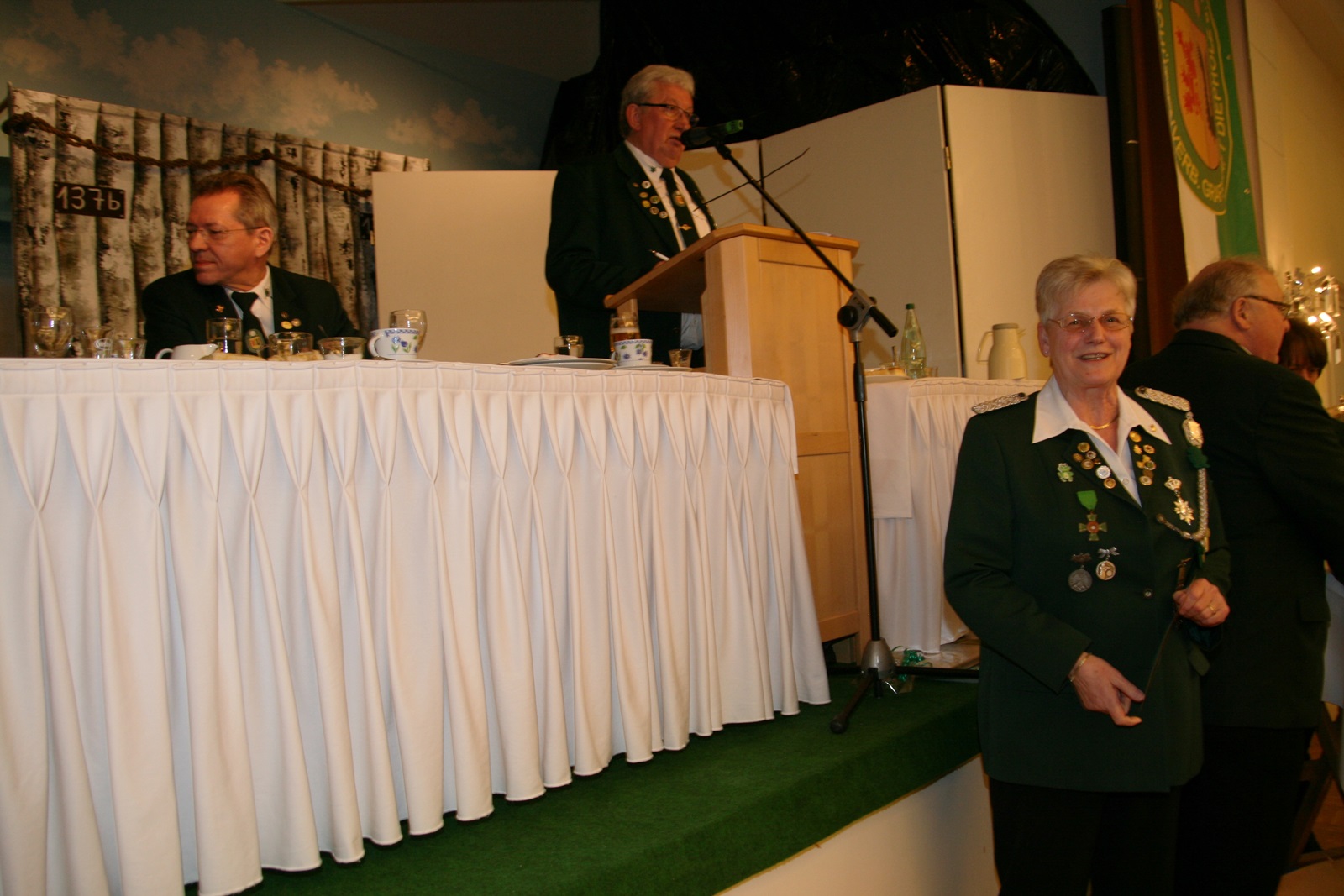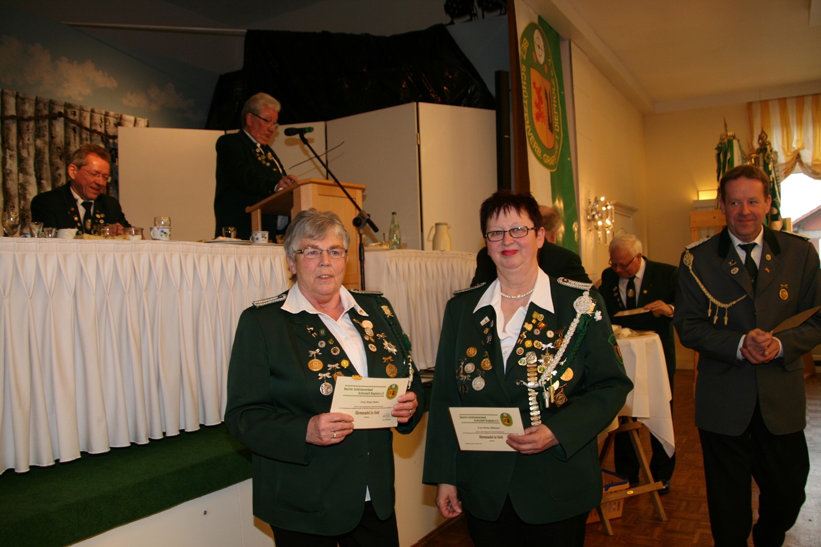 Die besonderen Ehrungen wurden von Friedel Kelkenberg verlesen, dazu gehörten die Goldene Ehrennadel sowie die Silberne und Goldene Verdienstnadel des Bezirks. Auch die Ehrennadel-, das Ehrenkreuz in Bronze und Silber des NWDSB. Der Ehrenbrief des NWDSB ist mit eines der höchsten Auszeichnungen vom Landesverband, darüber freuten sich an diesem Tag Paul-Gerd Burghausen und Hein Lüesse. (Auf der Generalversammlung des SV Klein Lessen, wurde zuvor Wilhelm Borchers-Rohde und auf seiner Feier zum 70. Geburtstag war sie Friedel Kelkenberg verliehen worden.)