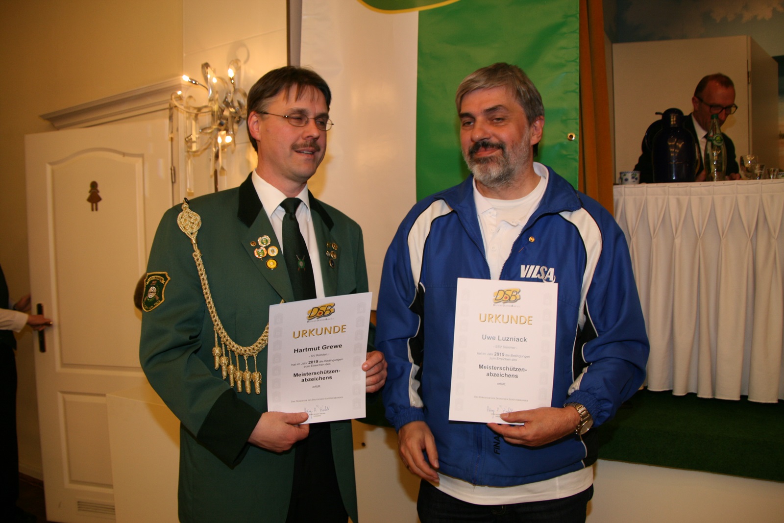 Ebenso stolz halten die beiden Vereinskollegen Enno Blume u. Hartmut Borkowski vom SV Ossenbeck ihre Urkunden. Die dazugehörige Ehrennadel erhielten sie vom NWDSB-Vizepräsidenten Frank Pringel, BZ-Präsident Karl-Friedrich Scharrelmann gratulierte auch ihnen herzlich.